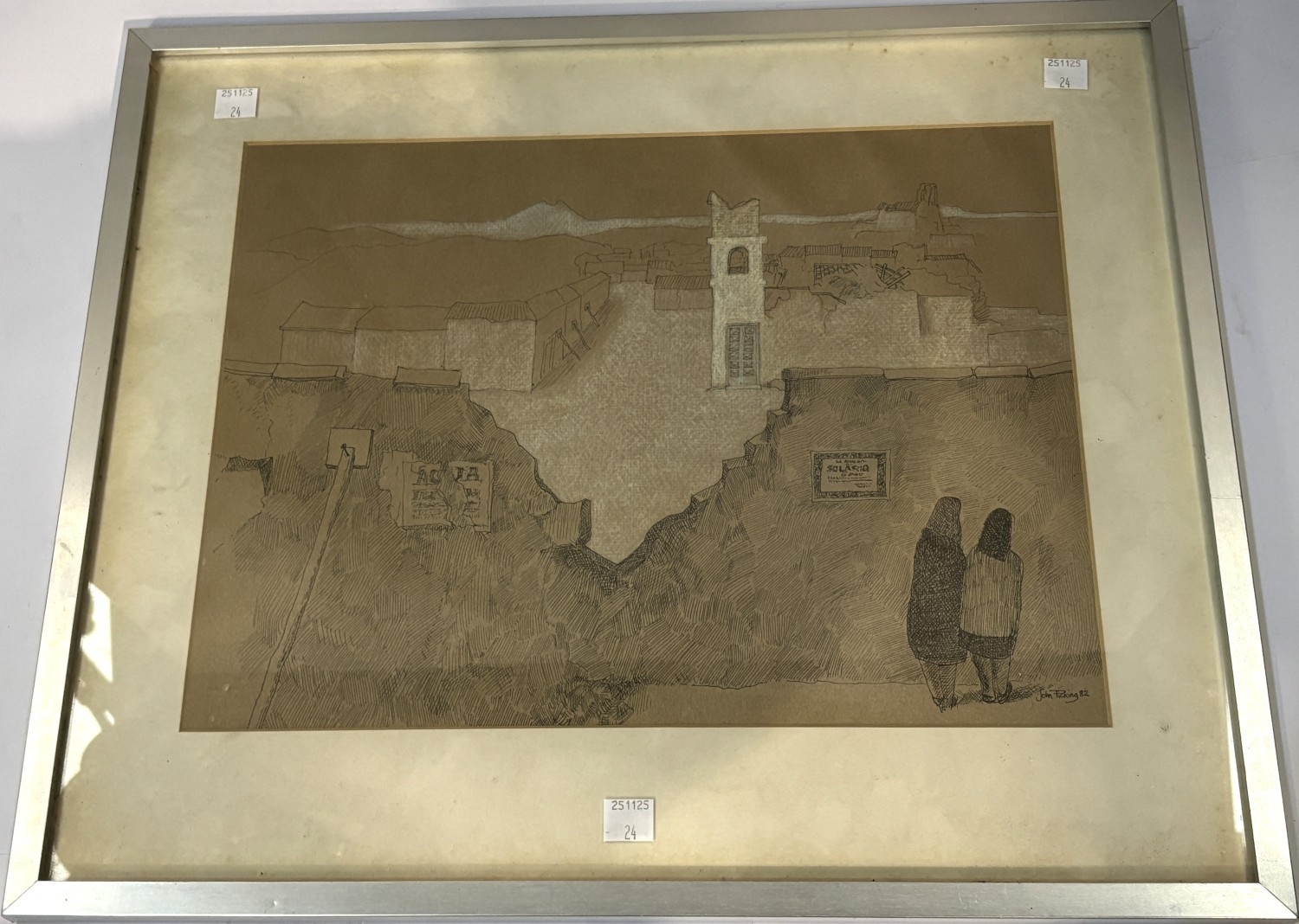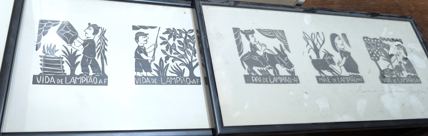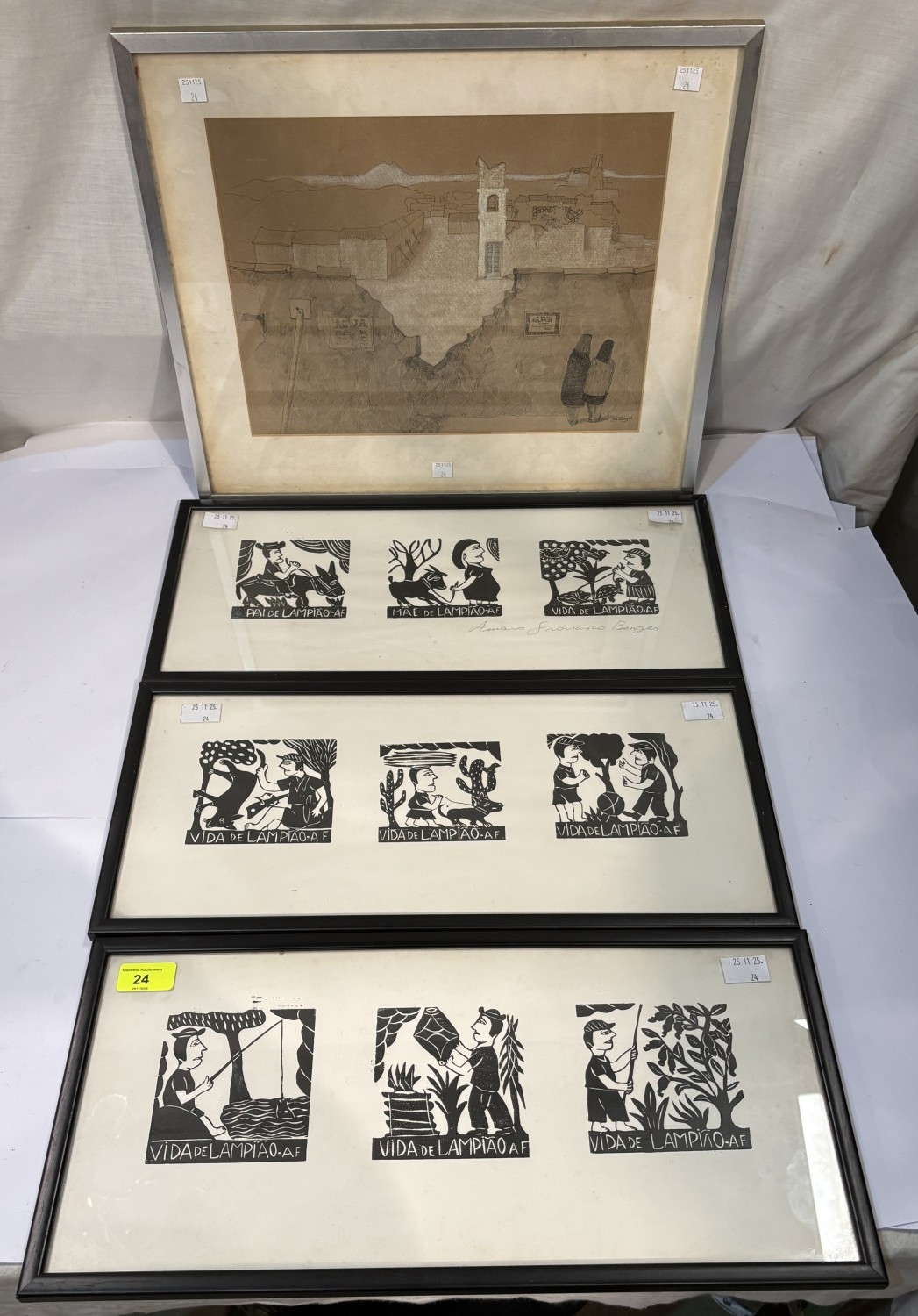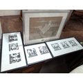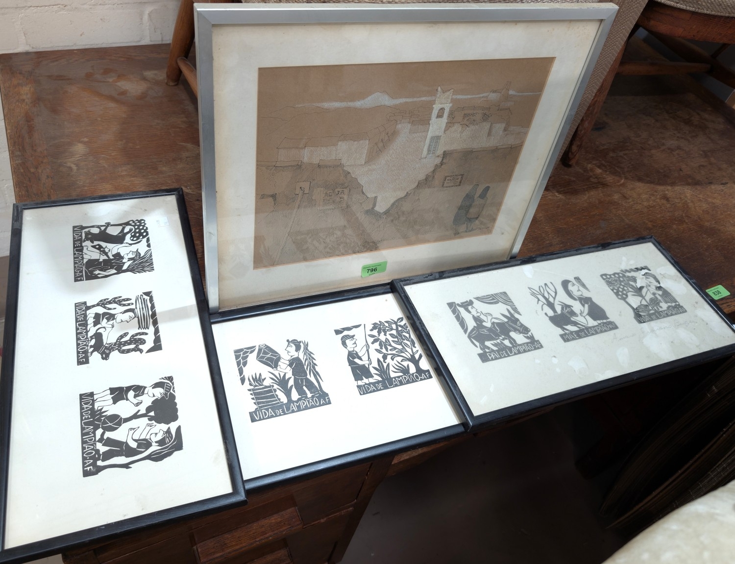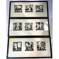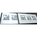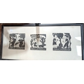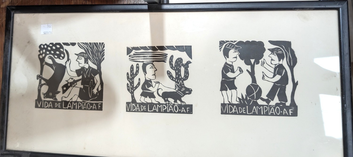 Amaro Francisco woodblock print, 3 sets framed as one, one signed in pencil and a John Pickering pen and ink picture.