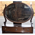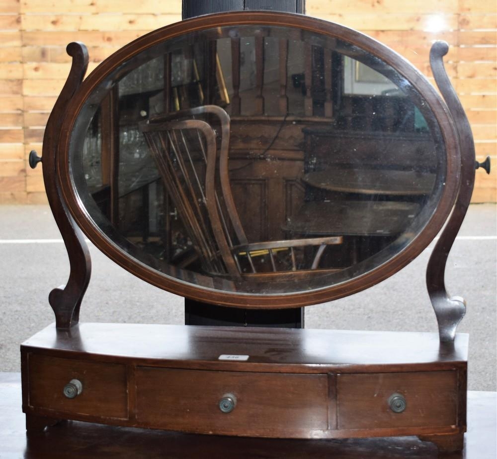 A 19th century mahogany dressing mirror, oval bevelled plate flanked by scrolling supports, the bow-front base with three drawers, outlined with boxwood and ebony stringing, bracket feet, 59cm high