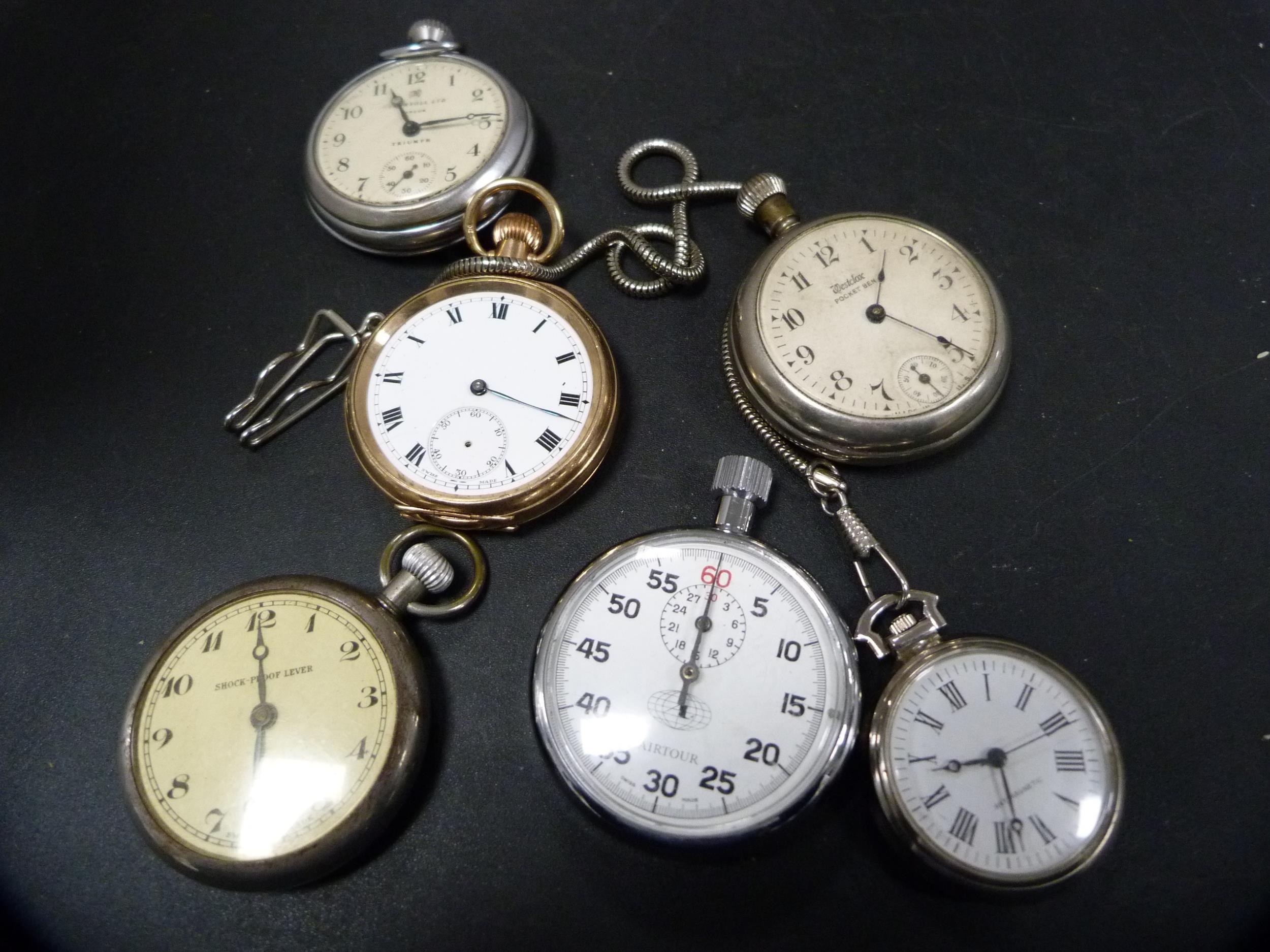 Bag containing miscellaneous pocket watches to include rolled gold, Swiss made, Ingersoll, Westclox and others. (6)