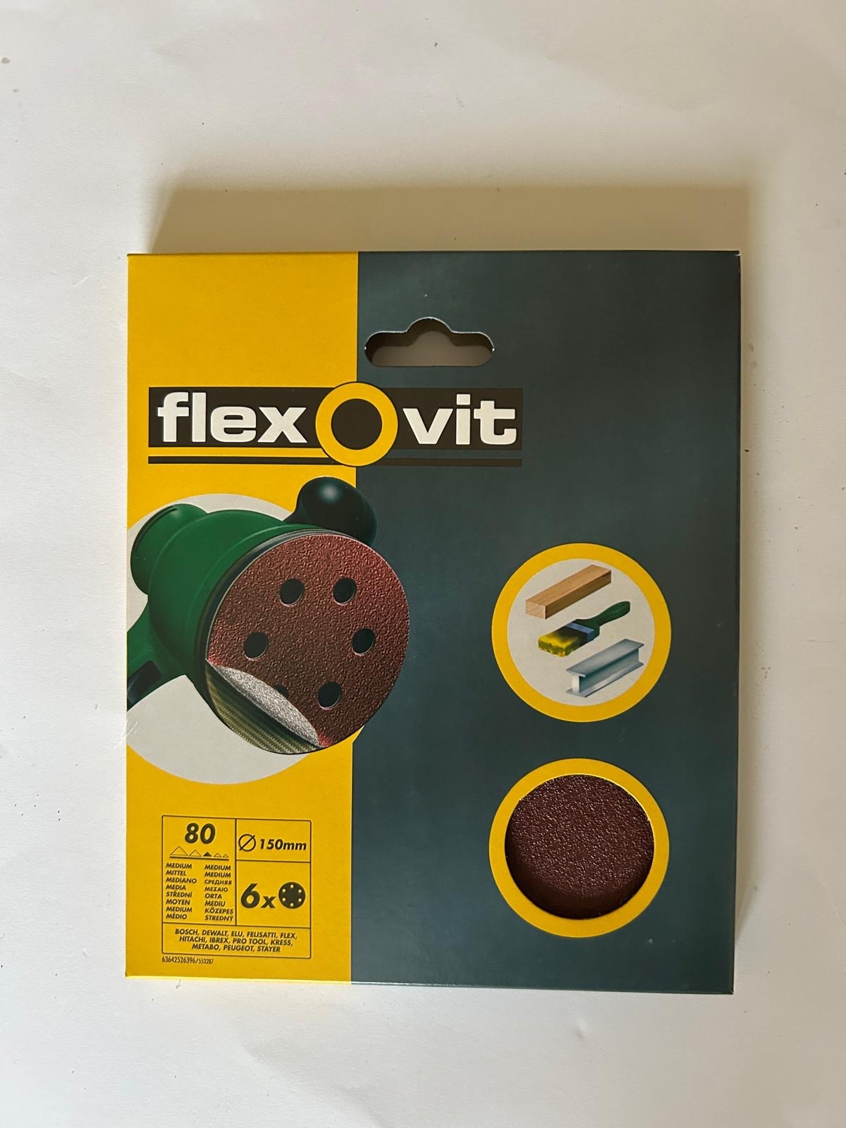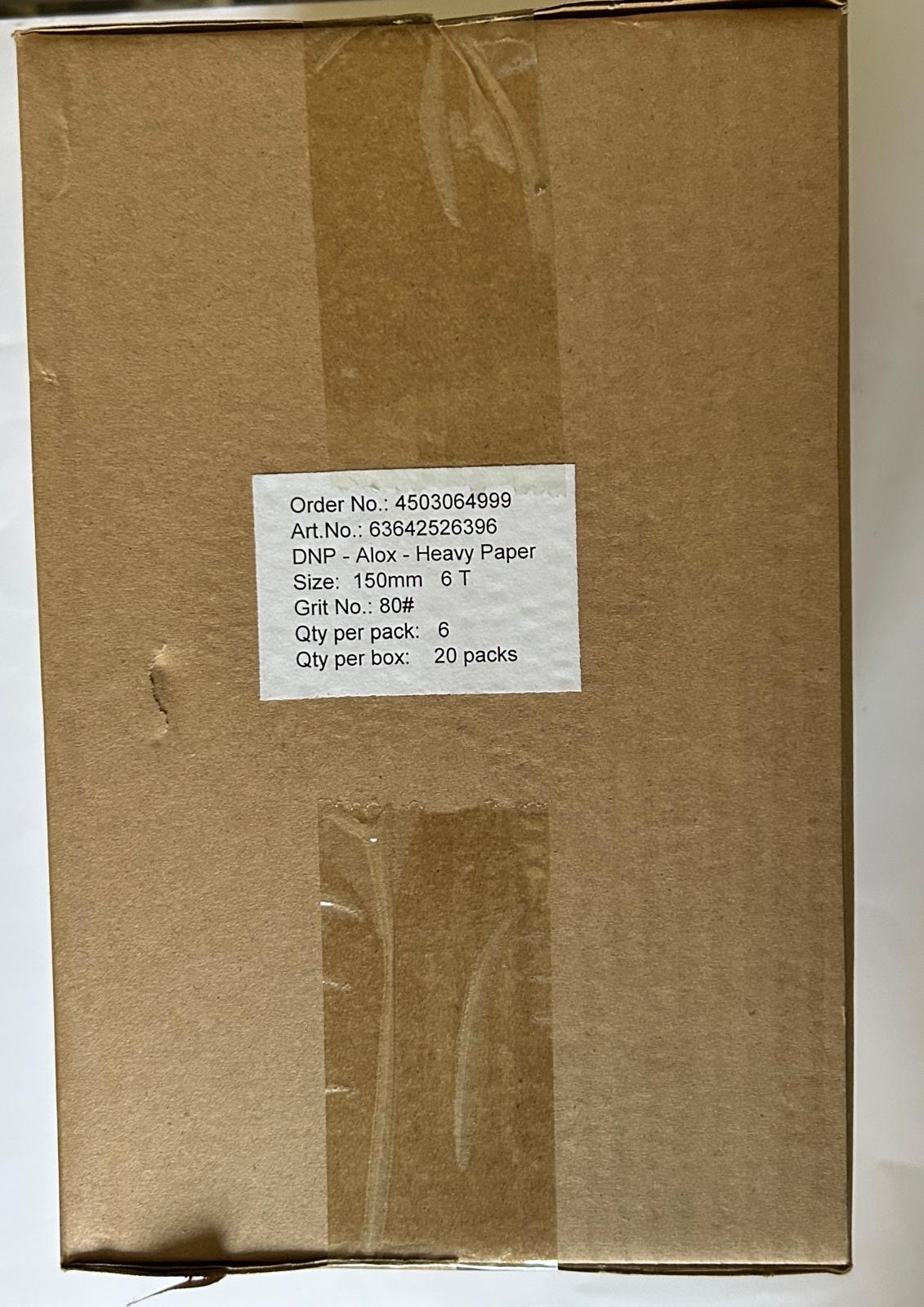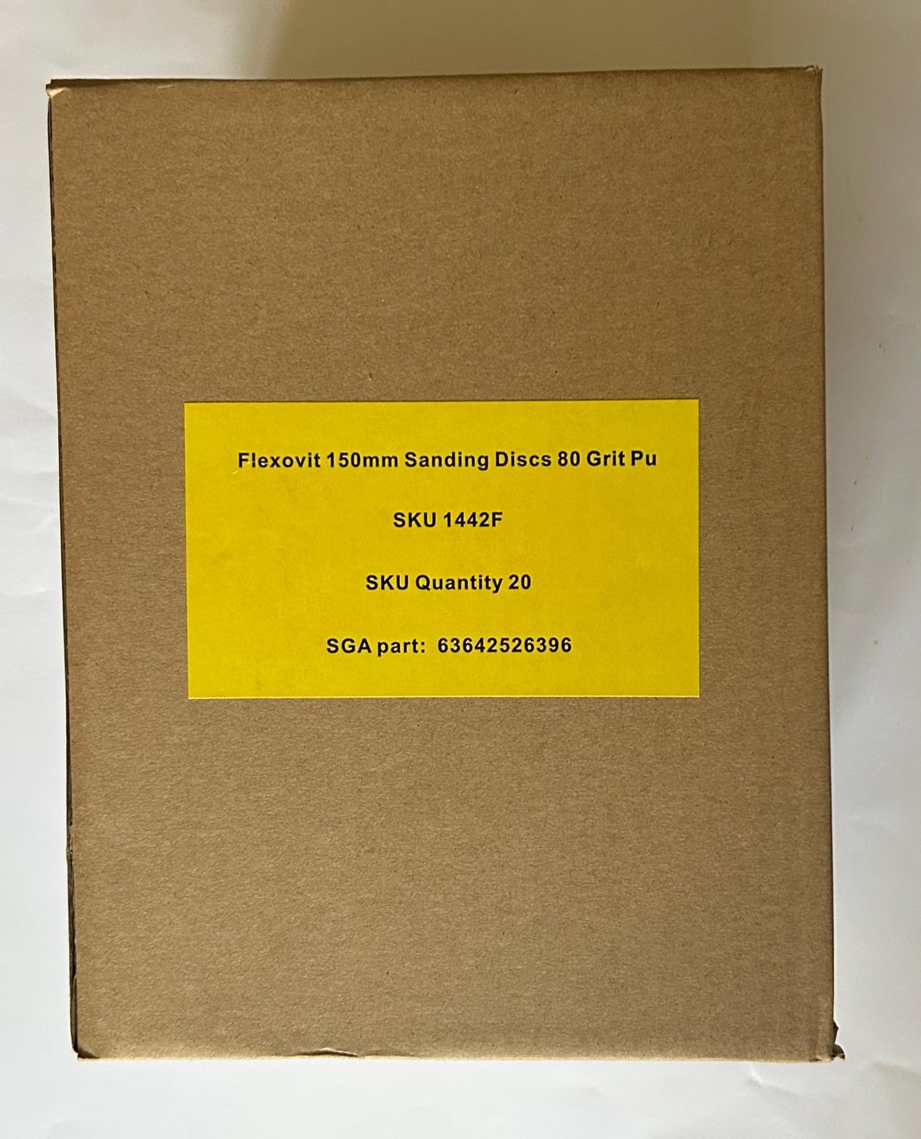 1 box of 80 grit orbital ventilated sanding discs. Diameter 150mm. The box contains 20 packs and each pack contains 6 disks.
