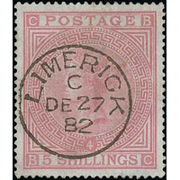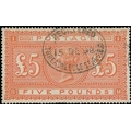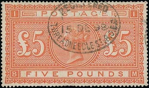 1882 £5 Orange, BM on white paper used with 1898 oval Registered Threadneedle St datestamp, tiny paper wrinkle to a couple of perfs at upper left, otherwise fine. S.G. 137, £3,600. Photo on Page 16.