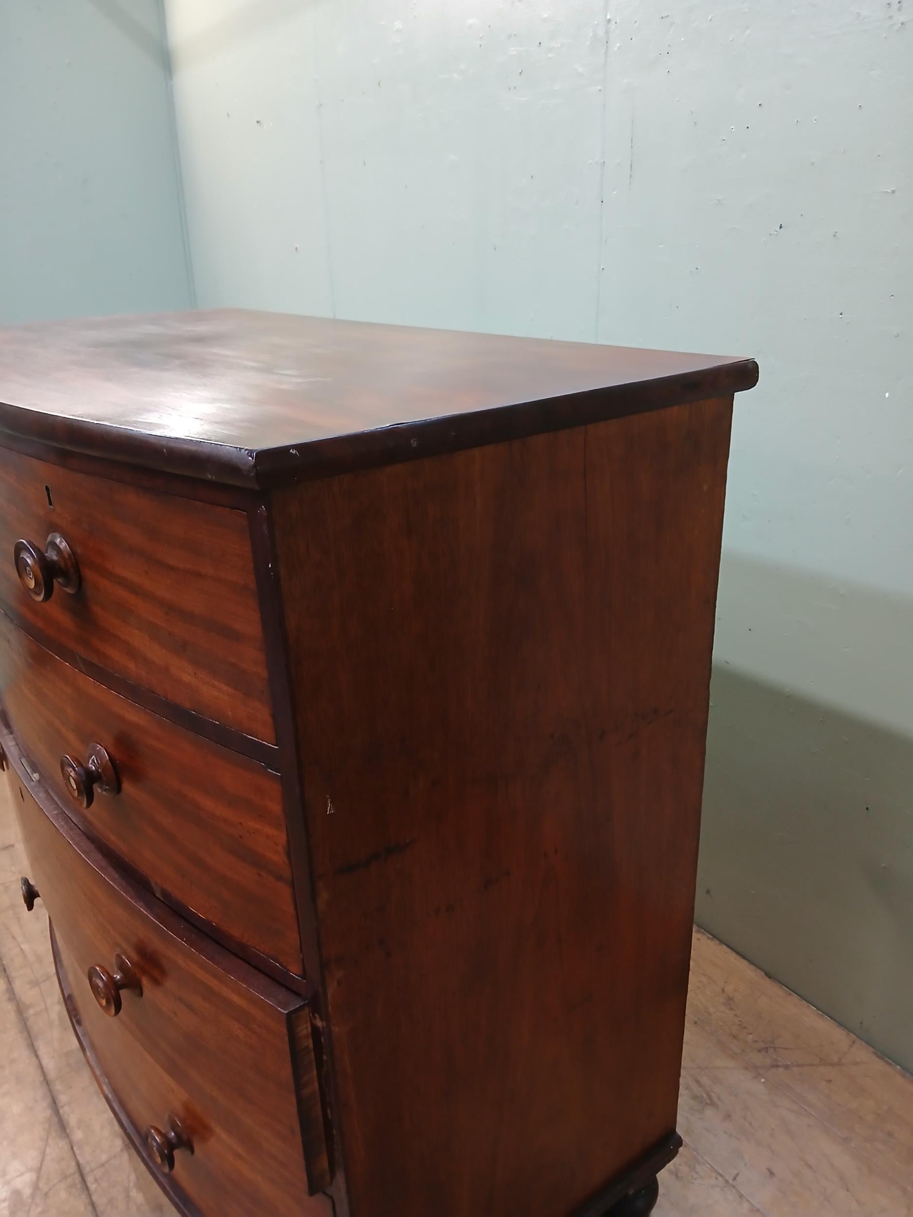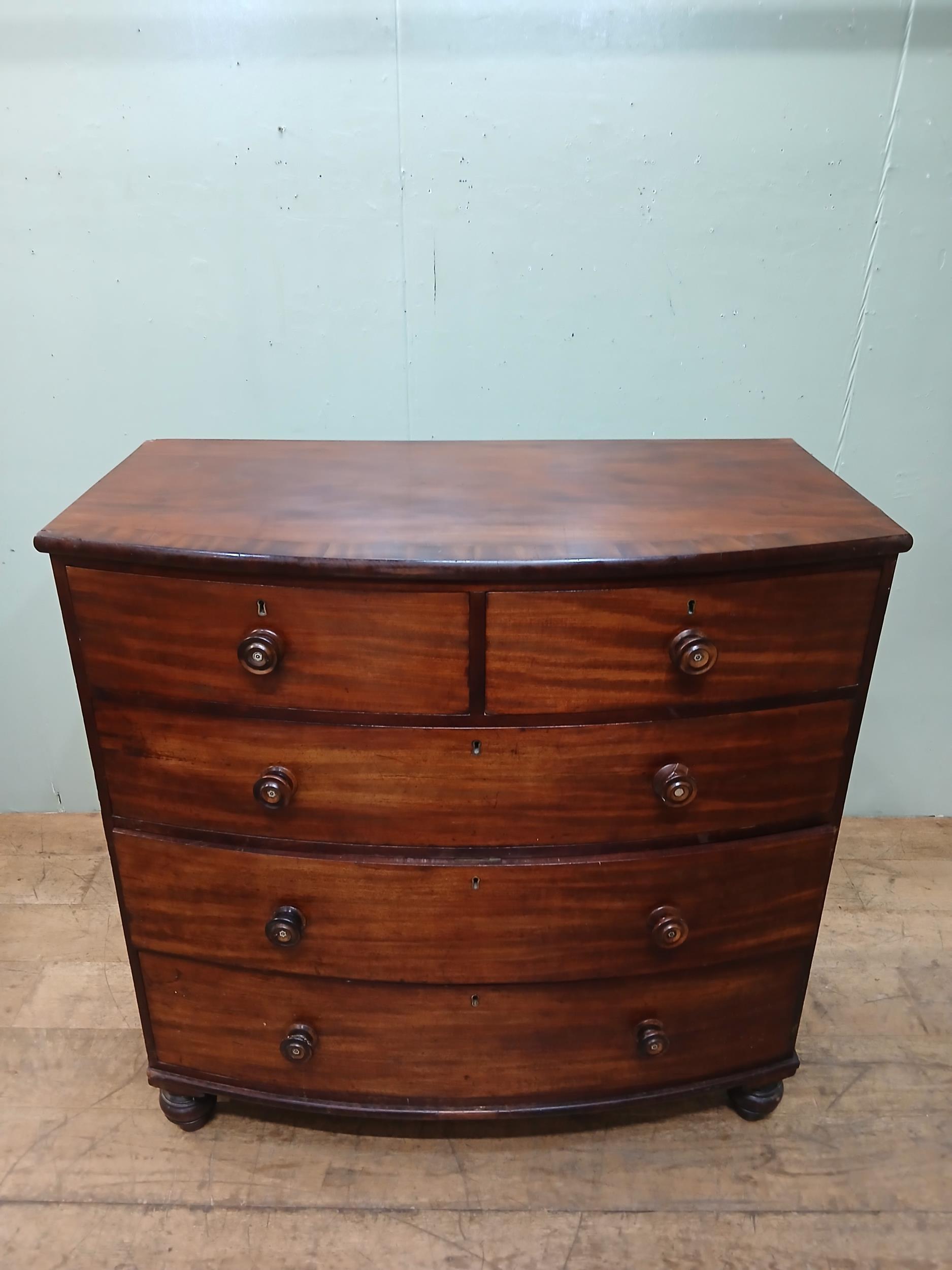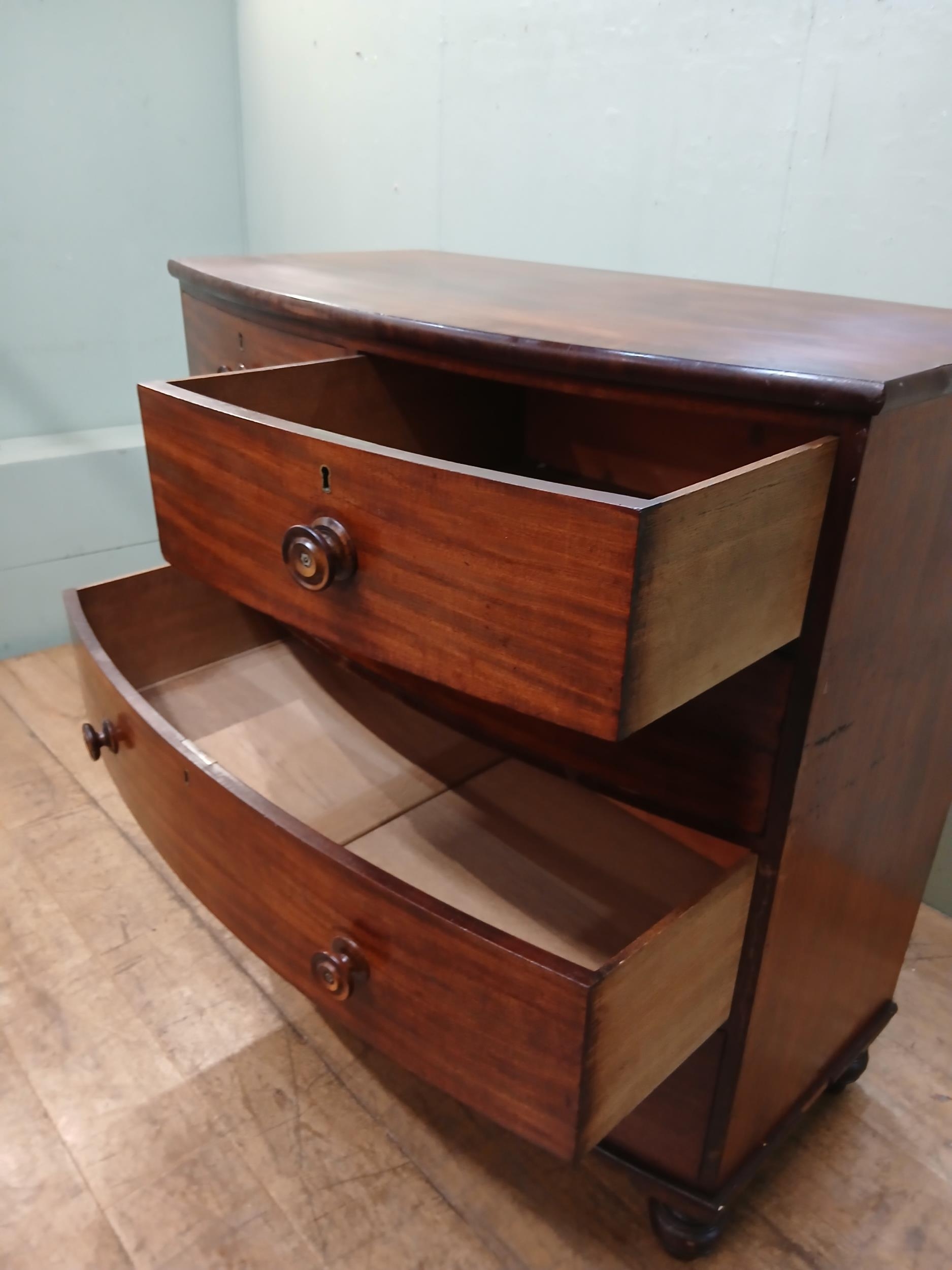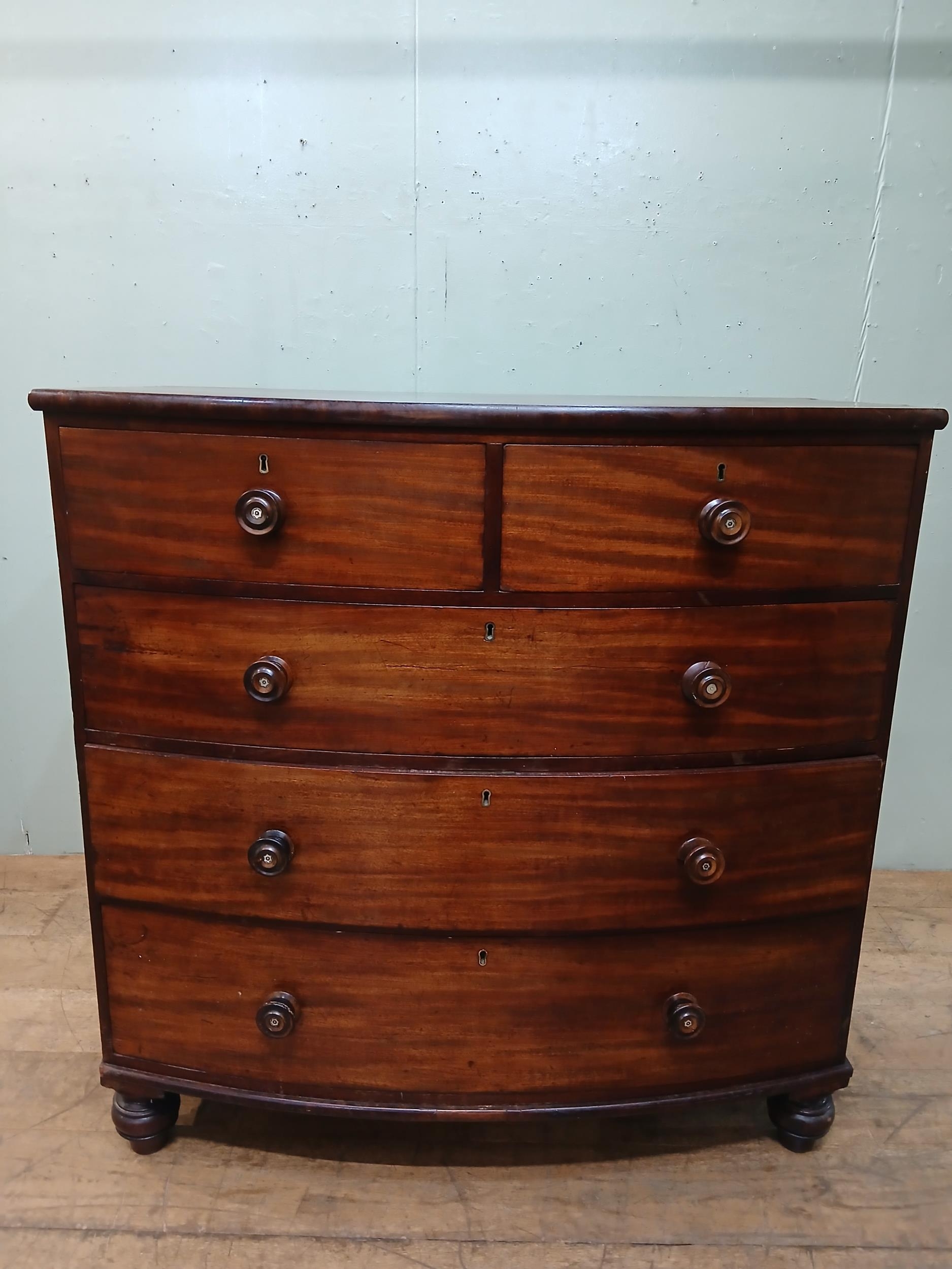 Georgian mahogany bowfronted chest of drawers with two short drawers over three long drawers on turned feet. {H 118cm x W 116cm x D 59cm }. NOT AVAILABLE TO VIEW IN PERSON.