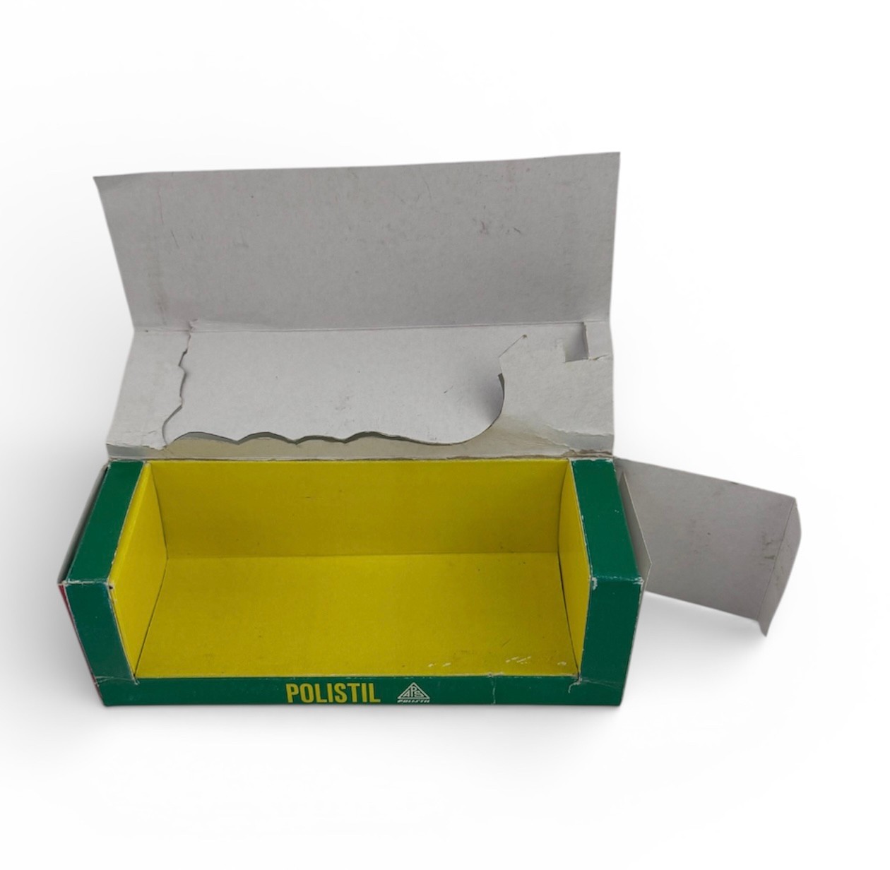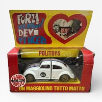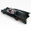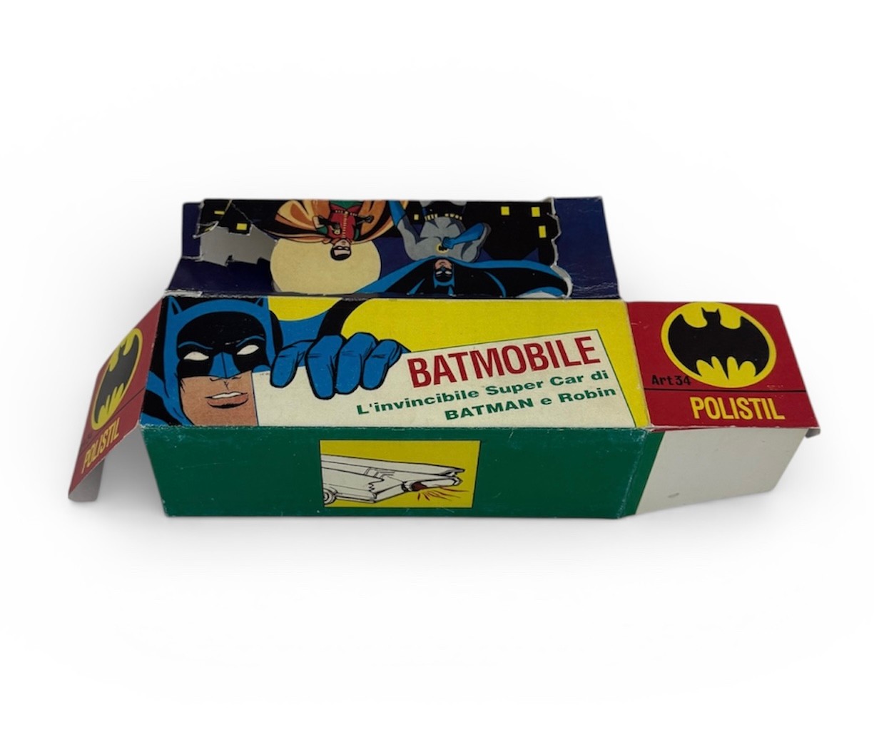 Polistil Batmobile No. 34, scarce and sought-after, very good (odd mark/pin-prick chip) in good plus pictorial box with folding display lid (creasing to cut-out display), black plastic upper and metal chassis, red plastic hubs with black tyres, silver detail to rocket launchers and roof frame, clear windows, Batman and Robin figures.