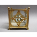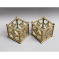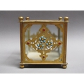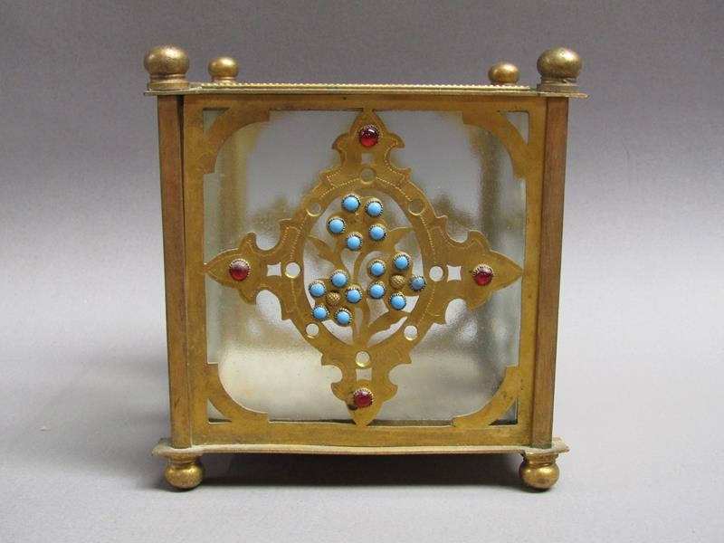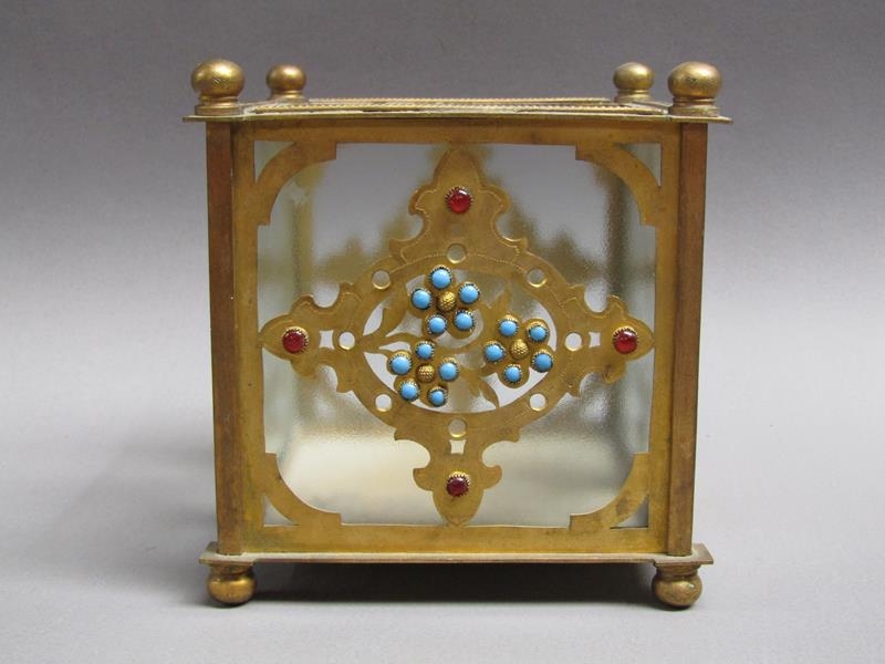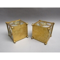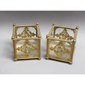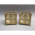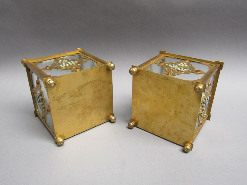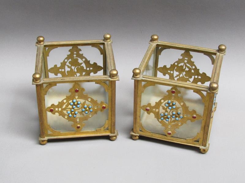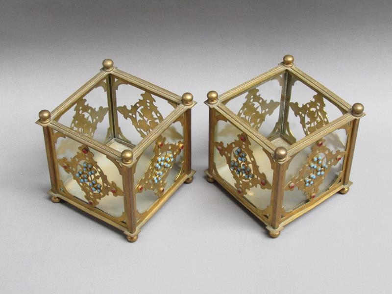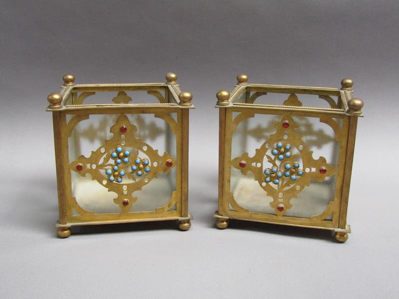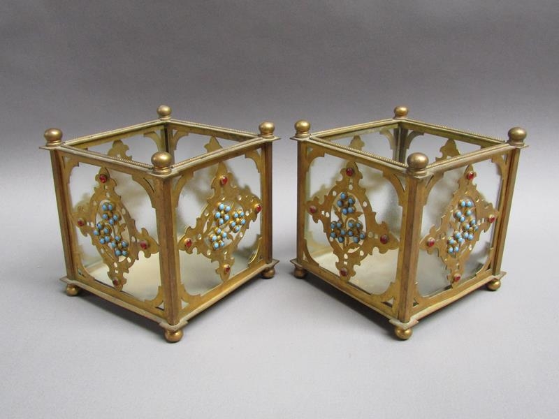 A pair of 19c gilt metal and glass panelled jardinière's decorated with cut brass panel motifs with turquoise and ruby coloured glass beads, 12.5cm w, 11.5cm h.