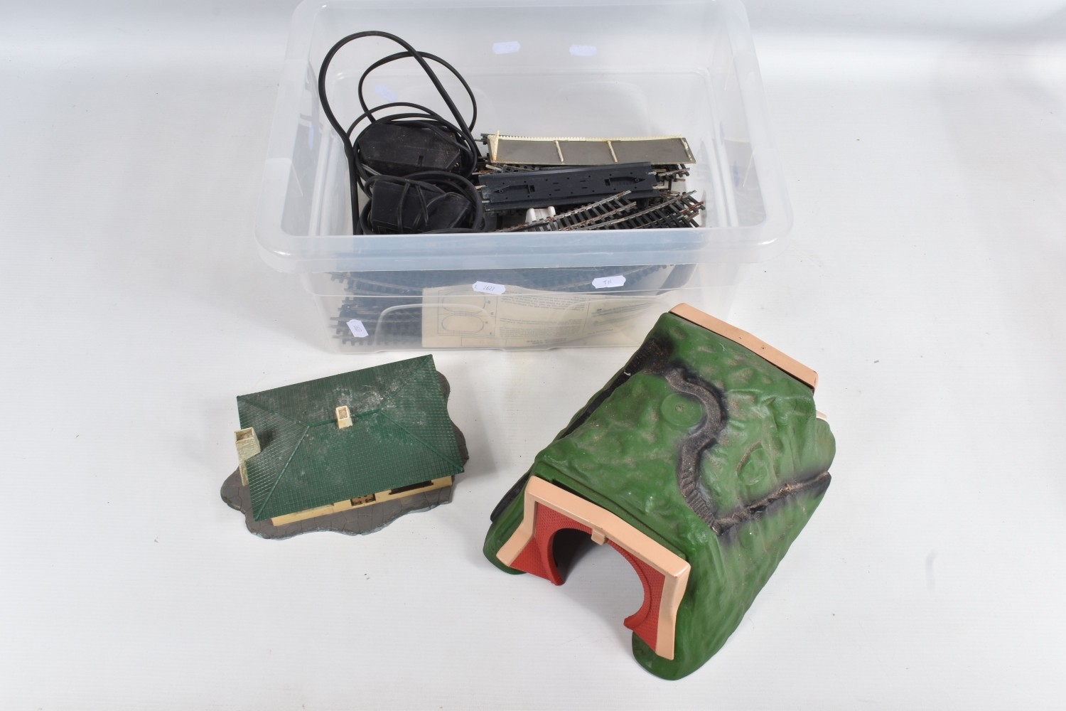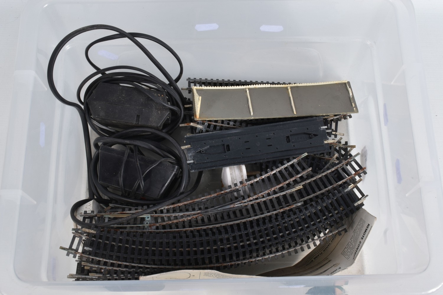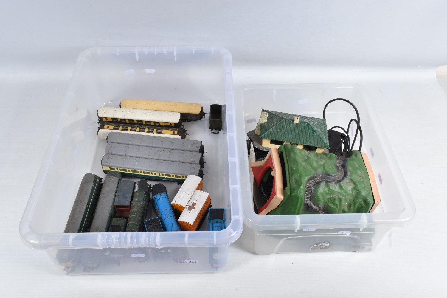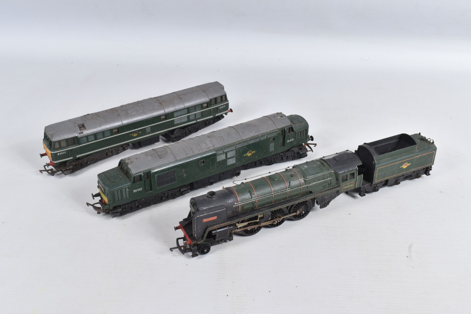 A QUANTITY OF UNBOXED ASSORTED TRI-ANG & HORNBY OO GAUGE MODEL RAILWAY ITEMS, to include Tri-ang class 31locomotive No.D5572 (R357), class 37 No.D6830, missing one buffer and has damage to one coupling (R751), damaged Tri-ang Britannia class locomotive and tender 'Britannia' No.70000, missing one nameplate (R259 &R35), all in B.R. green livery, Hornby Thomas the Tank Engine and Friends idamaged incomplete 'Gordon' No.4 locomotive and tender (R383), with three of his coaches, one missing end and one missing a buffer (R120, 2 x R121) Thomas No.1, missing one rear buffer and coupling hook (R351), with damaged 'Annie' & 'Clarabel' coaches and Van missing roof (R108), together with three Tri-ang Pullman coaches, quantity of assorted track, tunnel, controllers etc., all items in playworn condition and as noted above (2 boxes)