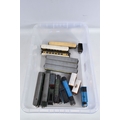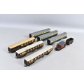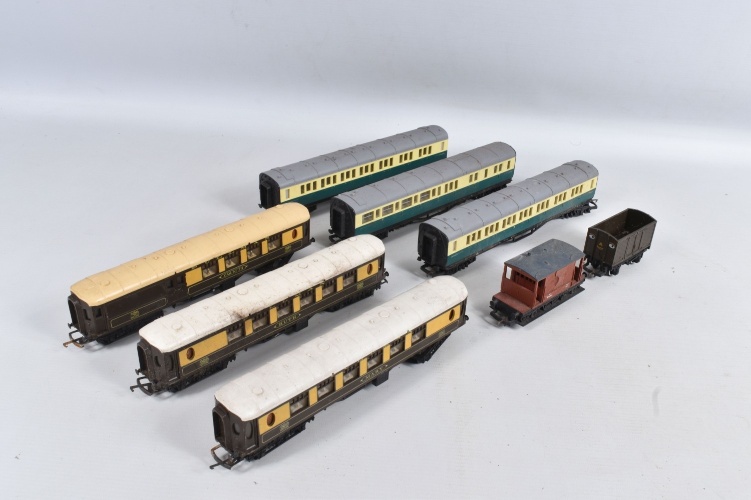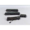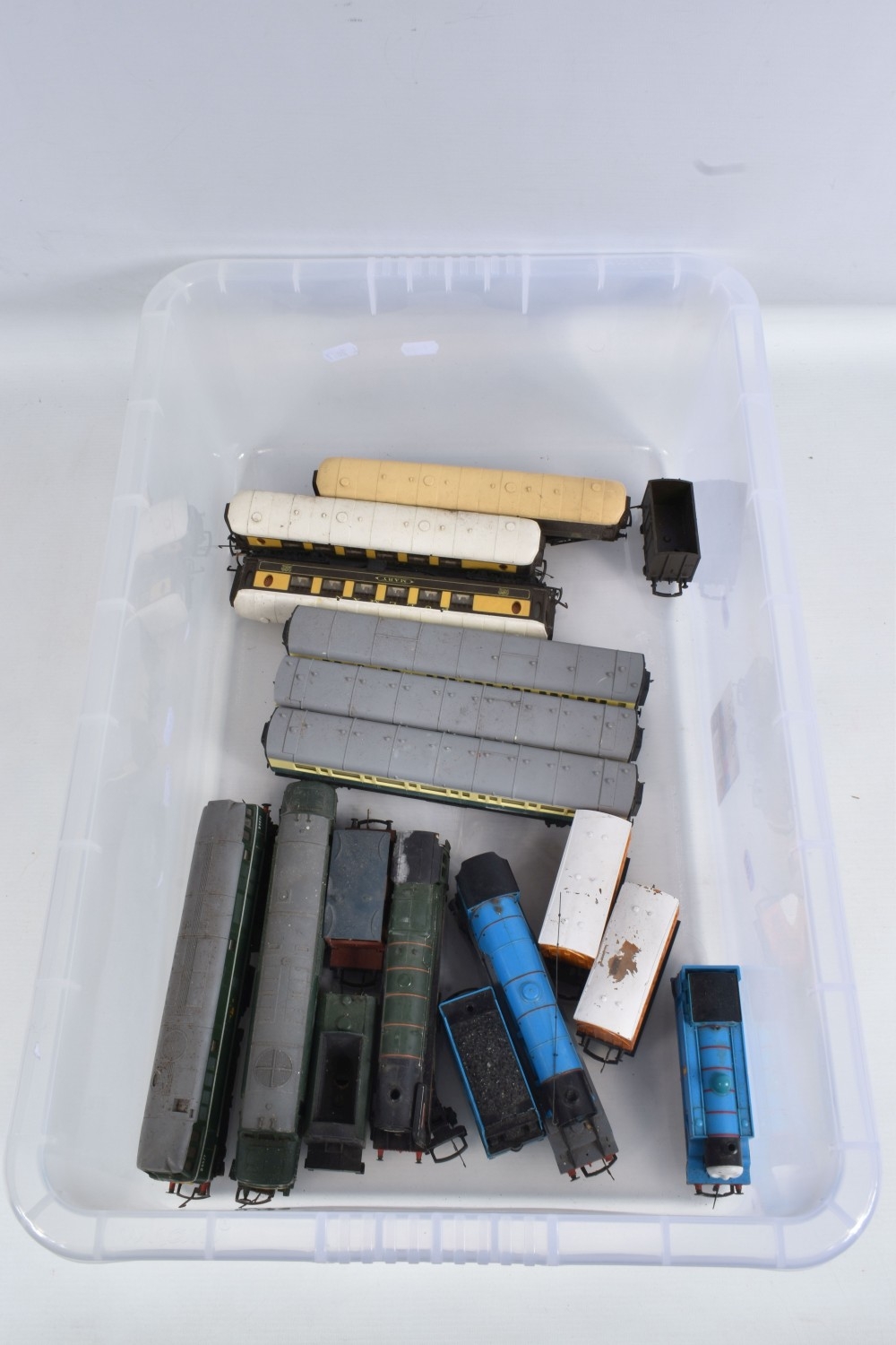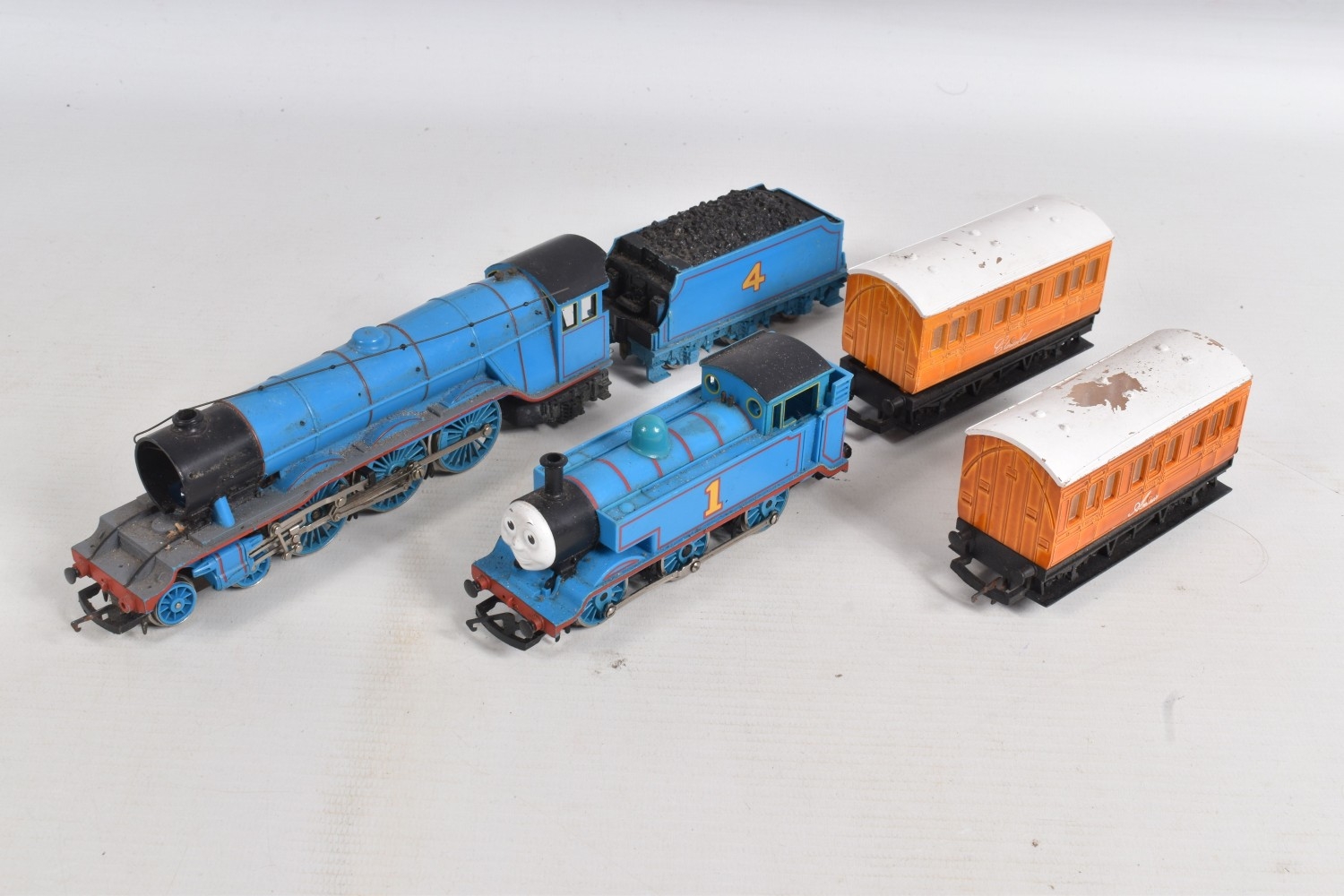 A QUANTITY OF UNBOXED ASSORTED TRI-ANG & HORNBY OO GAUGE MODEL RAILWAY ITEMS, to include Tri-ang class 31locomotive No.D5572 (R357), class 37 No.D6830, missing one buffer and has damage to one coupling (R751), damaged Tri-ang Britannia class locomotive and tender 'Britannia' No.70000, missing one nameplate (R259 &R35), all in B.R. green livery, Hornby Thomas the Tank Engine and Friends idamaged incomplete 'Gordon' No.4 locomotive and tender (R383), with three of his coaches, one missing end and one missing a buffer (R120, 2 x R121) Thomas No.1, missing one rear buffer and coupling hook (R351), with damaged 'Annie' & 'Clarabel' coaches and Van missing roof (R108), together with three Tri-ang Pullman coaches, quantity of assorted track, tunnel, controllers etc., all items in playworn condition and as noted above (2 boxes)