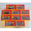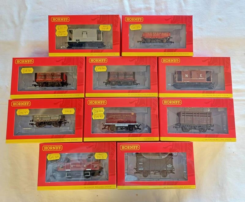 SELECTION OF HORNBY OO GAUGE ROLLING STOCK INCLUDING R6851 - EWS ZVA SHARK WAGON NO DB 993902, R6805 - 3 PLANK WAGON GRANDMAC NO 337, R6950 - 6 PLANK WAGON T HARRISON & SON NO 33 AND OTHERS. ALL BOXED