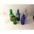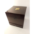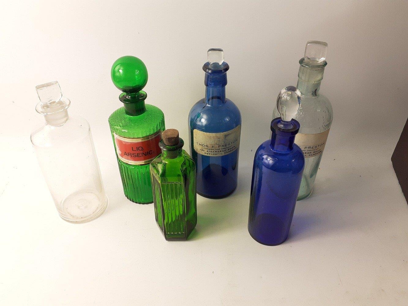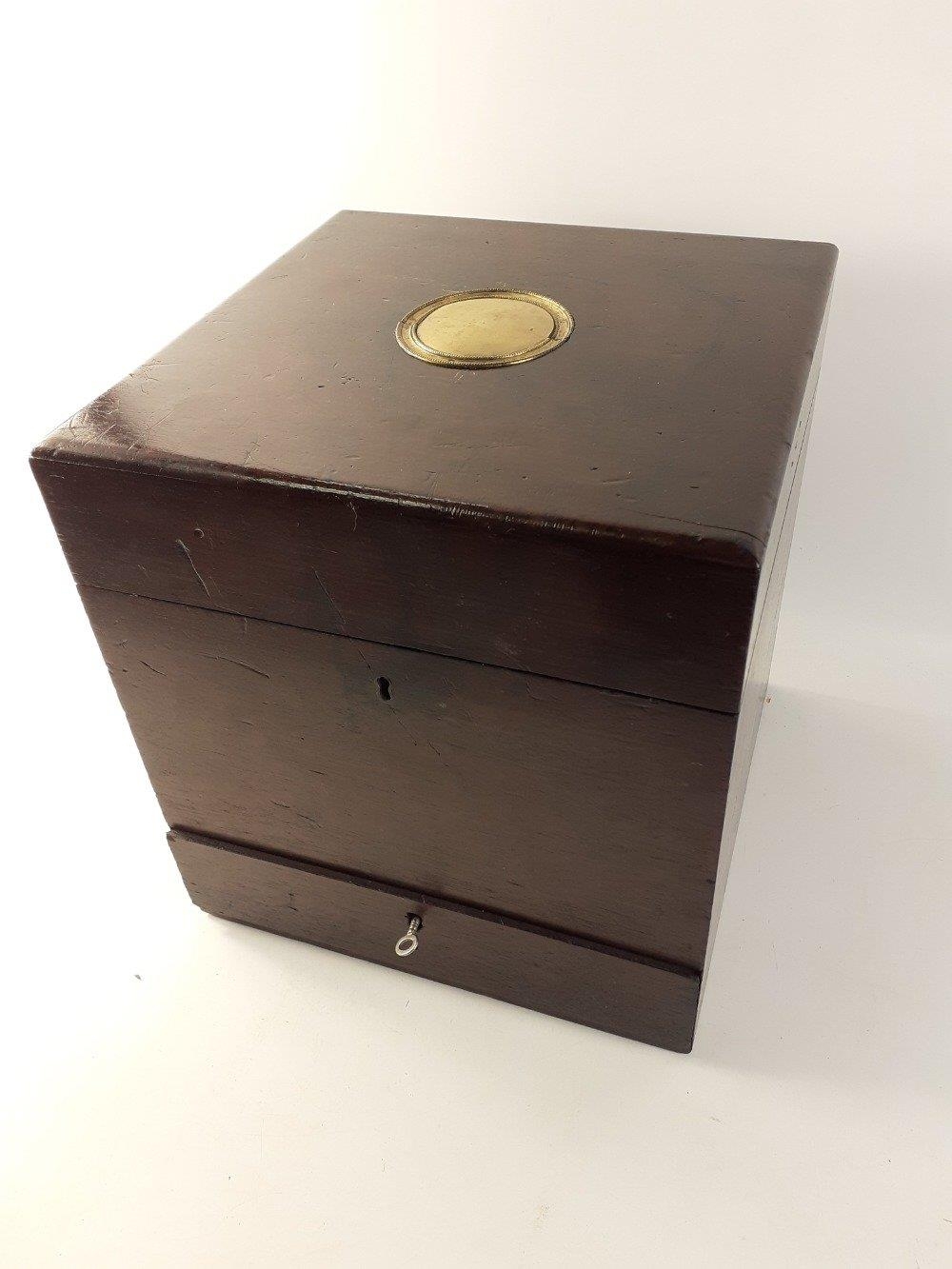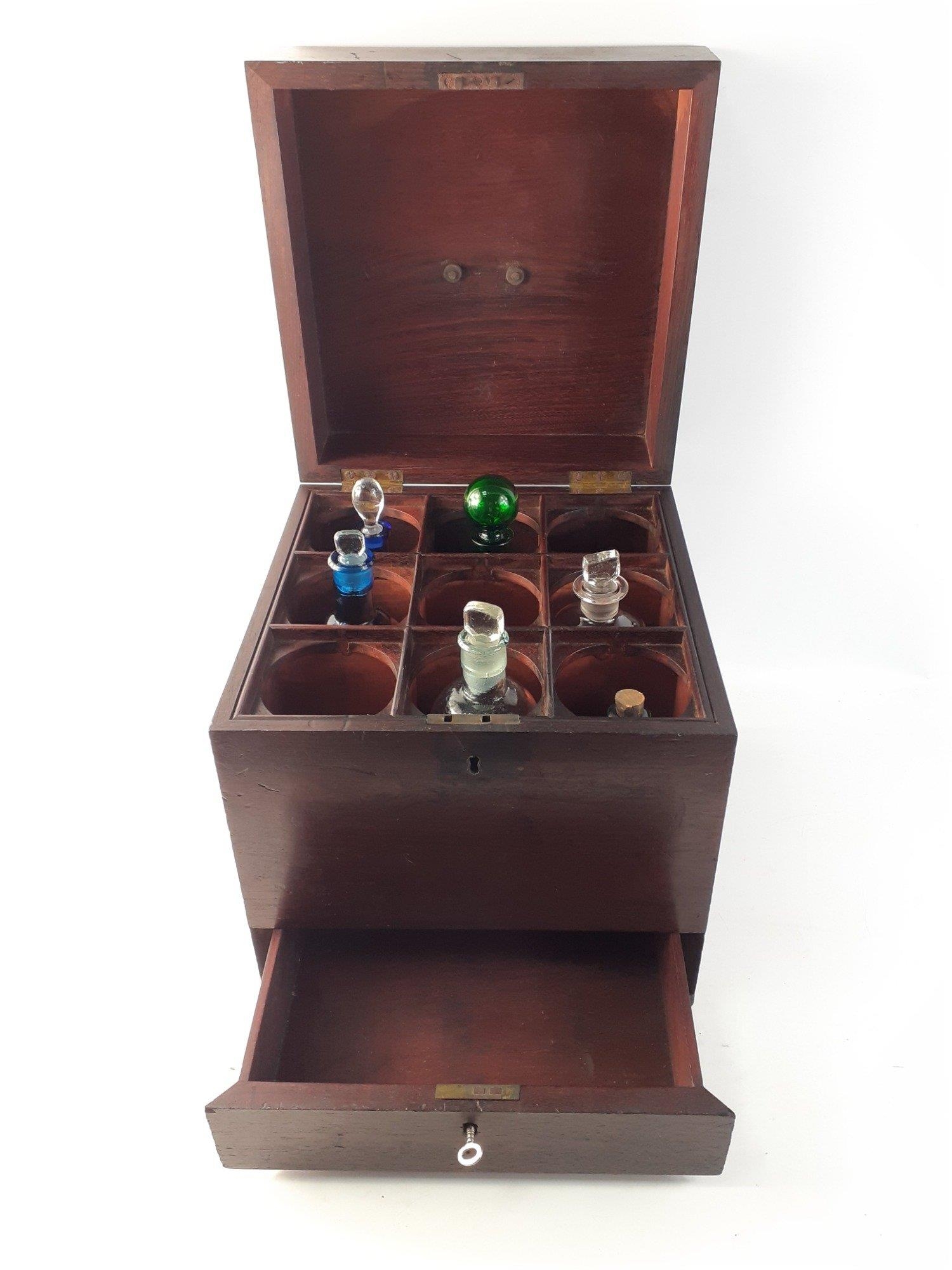 A lovely early 1800s travelling APOTHECARY case with some lovely old bottles with a gorgeous opening drawer beneath with beautifully champered angled edges. Uninscribed brass plate on top. A very high quality and desirable item. Crying out to be completed with more bottles and collectibles in the drawer below. 30cm tall, 28cm wide, 28cm deep. Includes a rare blue bottle with tear drop stopper, a lovely green ribbed ARSENIC bottle. Two other bottles carry Govanhill, Glasgow chemists lables. A beautiful original antique.