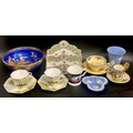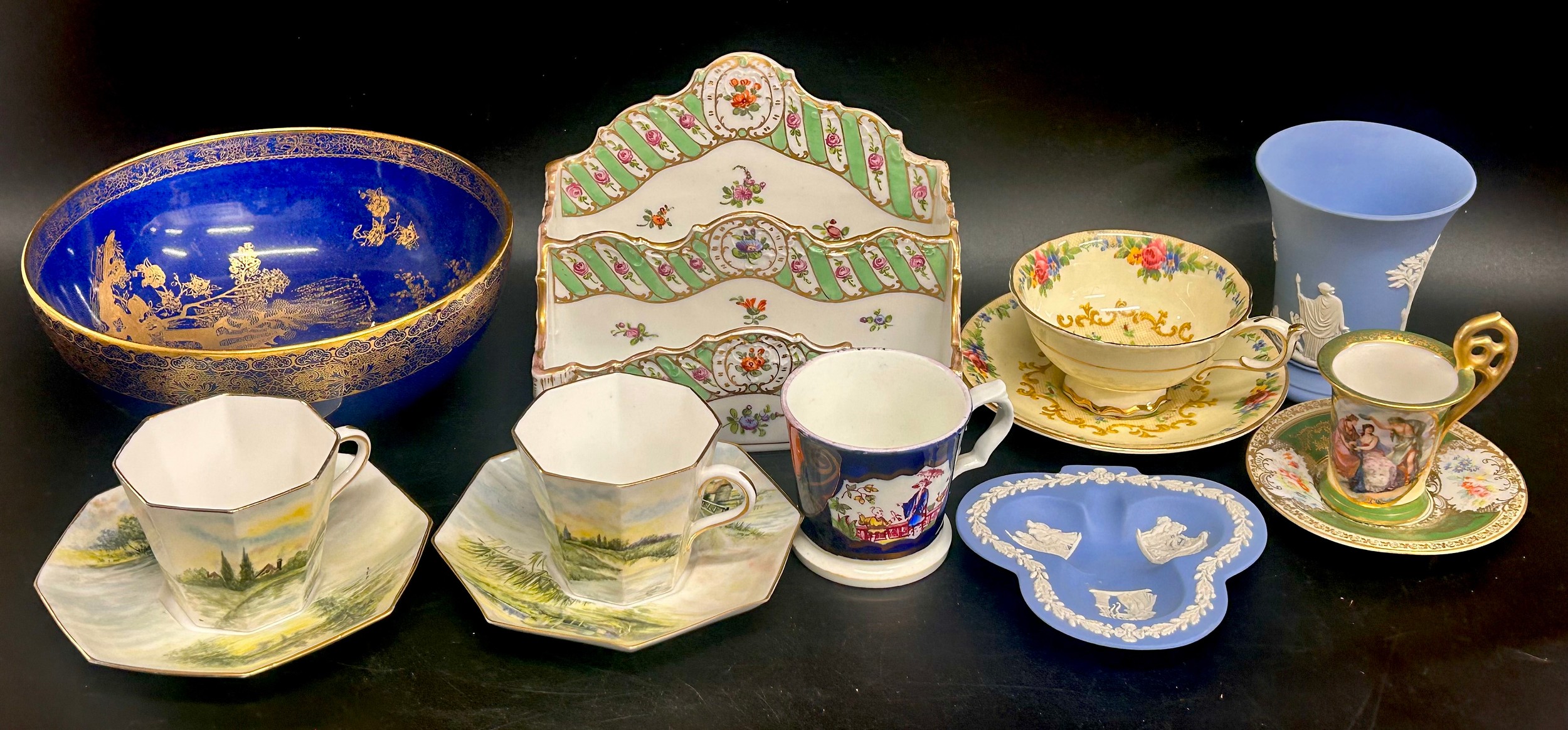 A collection of china to include a pair of Wedgwood cups and saucers, a Paragon cup and saucer, demi-tasse cup and saucer with beehive mark to base, Carlton Ware bowl, Wedgwood Jasperware