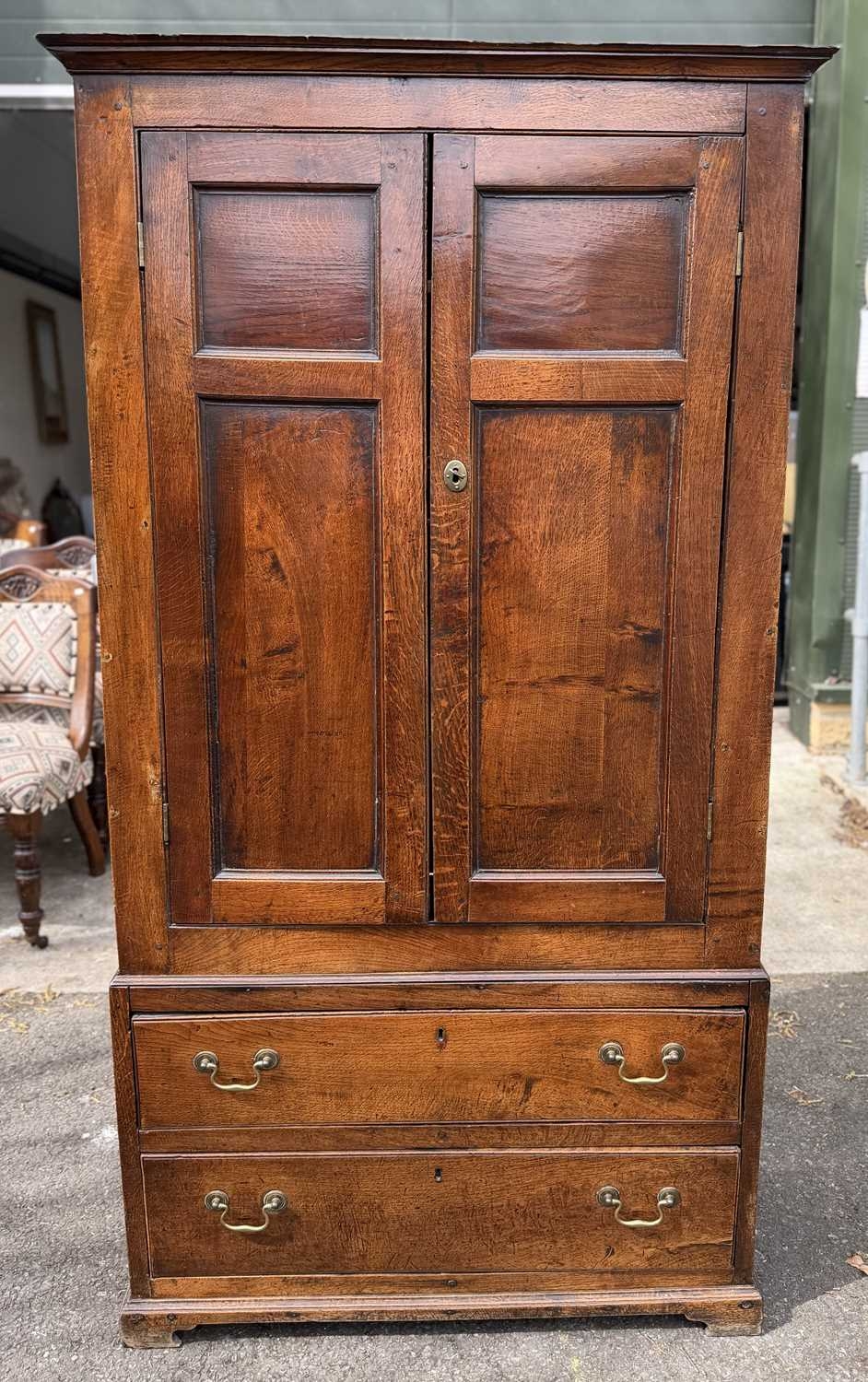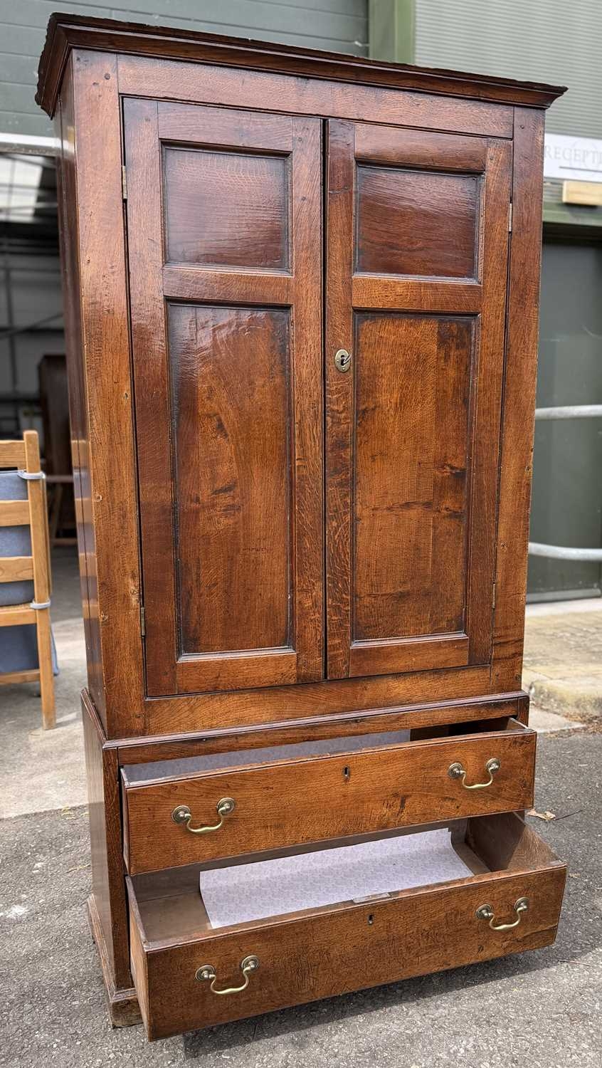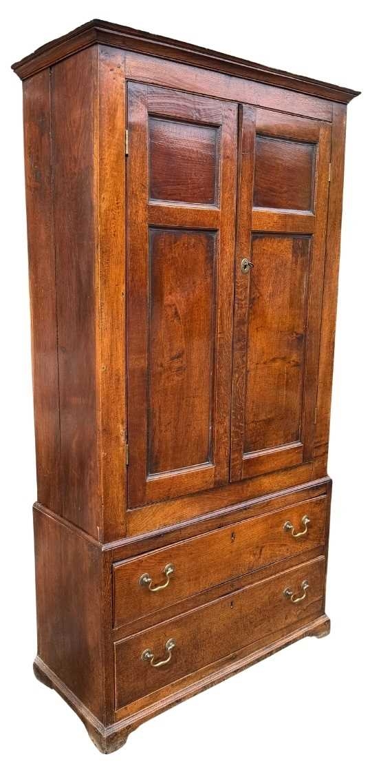 An 18th century oak livery cupboard or linen press arranged as two panelled doors above two drawers over shallow bracket feet, the cupboard is in two parts the cupboard section of oak with pine shelves and back boards and a brass escutcheon plate with key; the base drawer unit has drawers lined with oak and pine and four brass drop swan neck handles, h: 178cm, d: 40cm, w: 96cm, (1)
