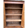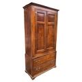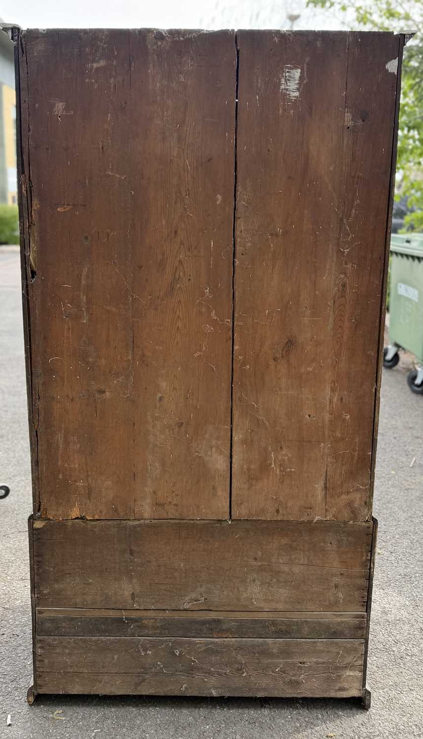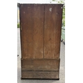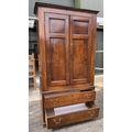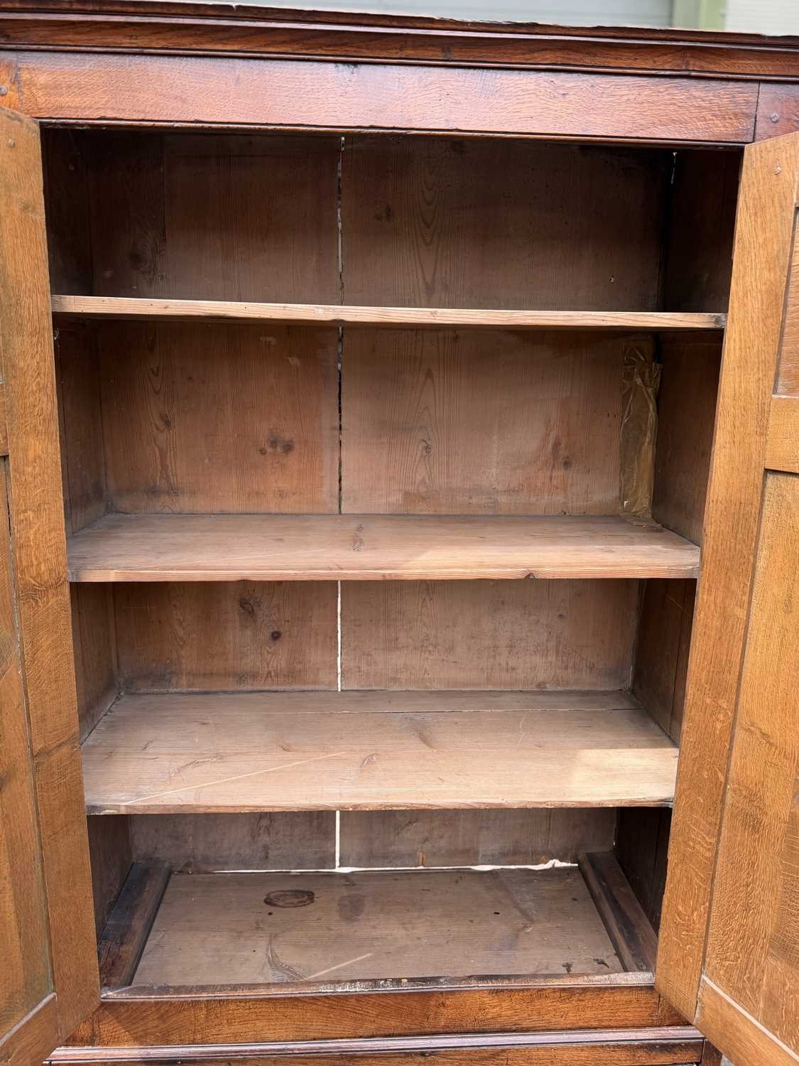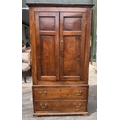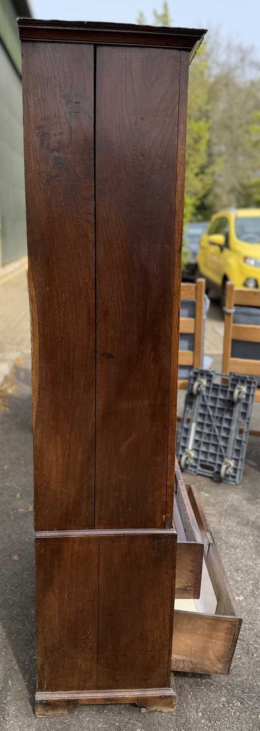 An 18th century oak livery cupboard or linen press arranged as two panelled doors above two drawers over shallow bracket feet, the cupboard is in two parts the cupboard section of oak with pine shelves and back boards and a brass escutcheon plate with key; the base drawer unit has drawers lined with oak and pine and four brass drop swan neck handles, h: 178cm, d: 40cm, w: 96cm, (1)