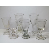Lot 87: Masonic tot glass with ground pontil, in good condition. Probably late 19th Century. One tumbler with some rim chips. One with two minute nicks to rim, 19th Century, goblet hollow stem & folded foot, in good condition, probably late 19th Century. Beakers with star cut bases