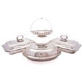 A mixed group of silver plate including; a pair of rounded rectangular Mappin and Webb Princess Plate entree dishes, covers and handles, a single oval entree dish and a swing handle basket, (4)
