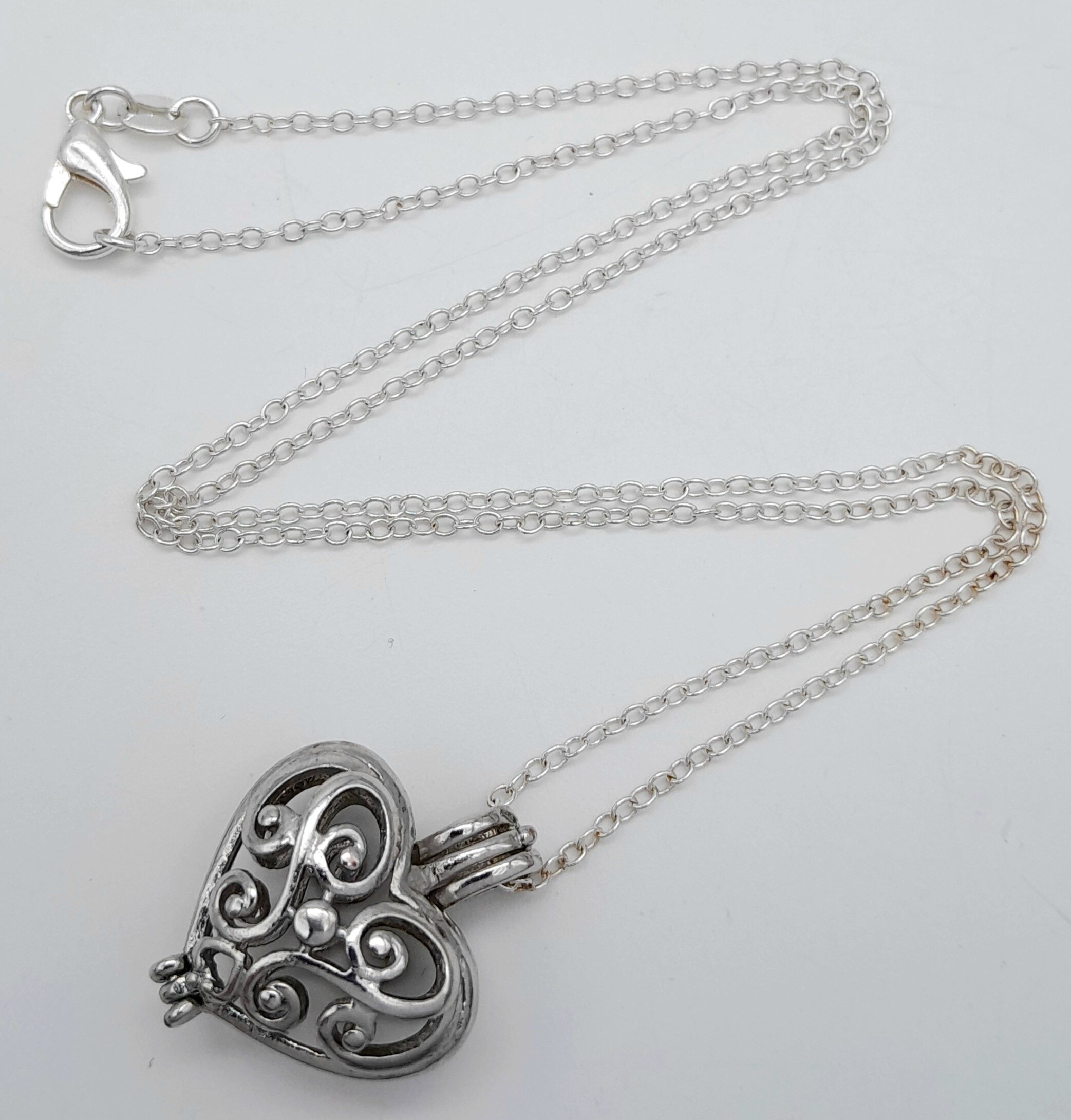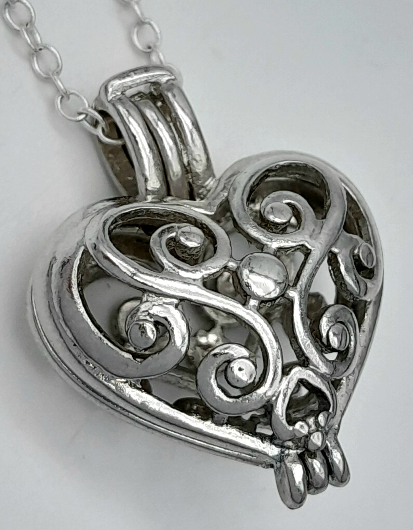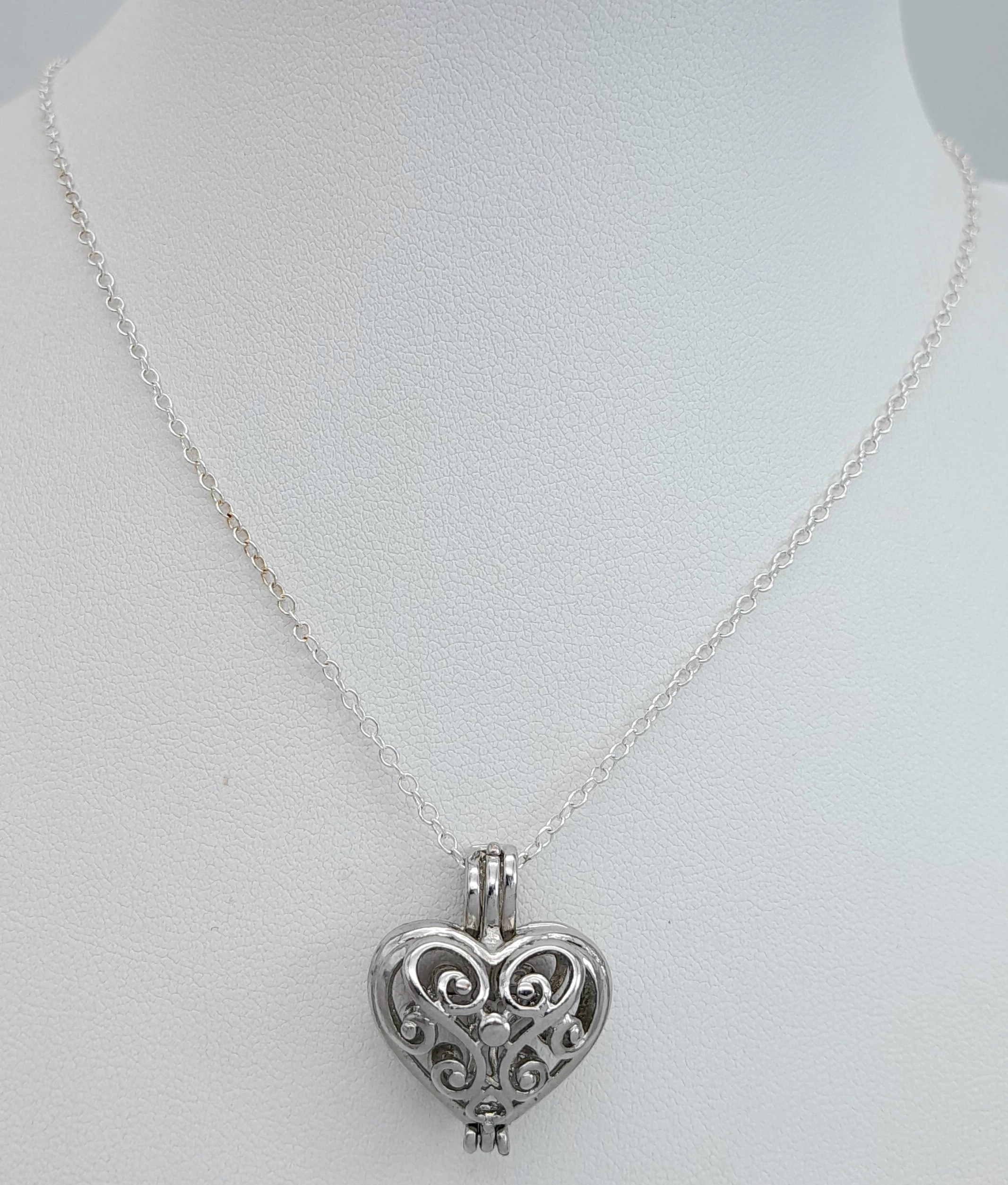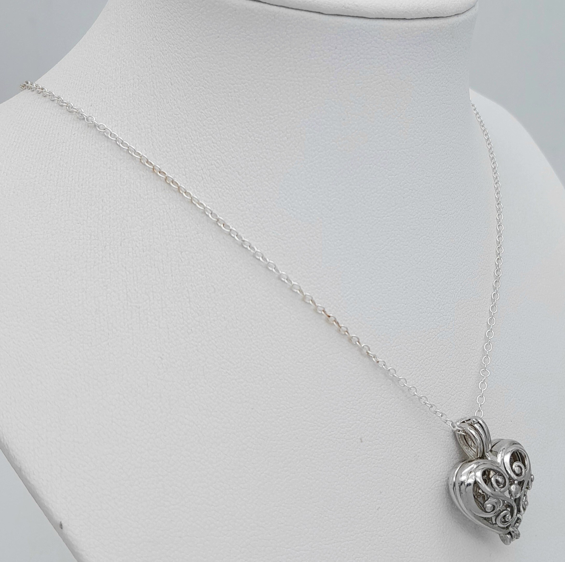 A 925 silver Filigree heart pendant, set on a silver chain necklace. Total weight 5.4G. Total length 44cm