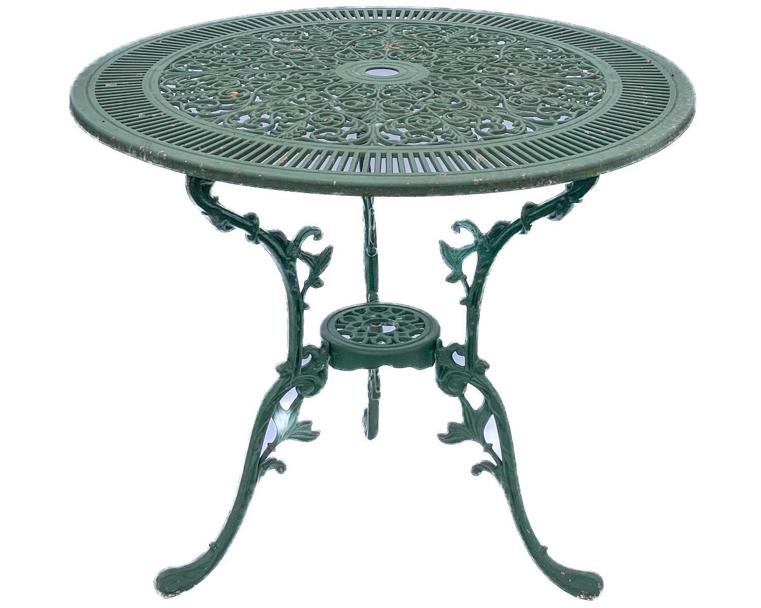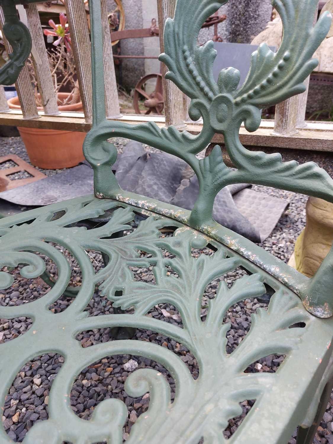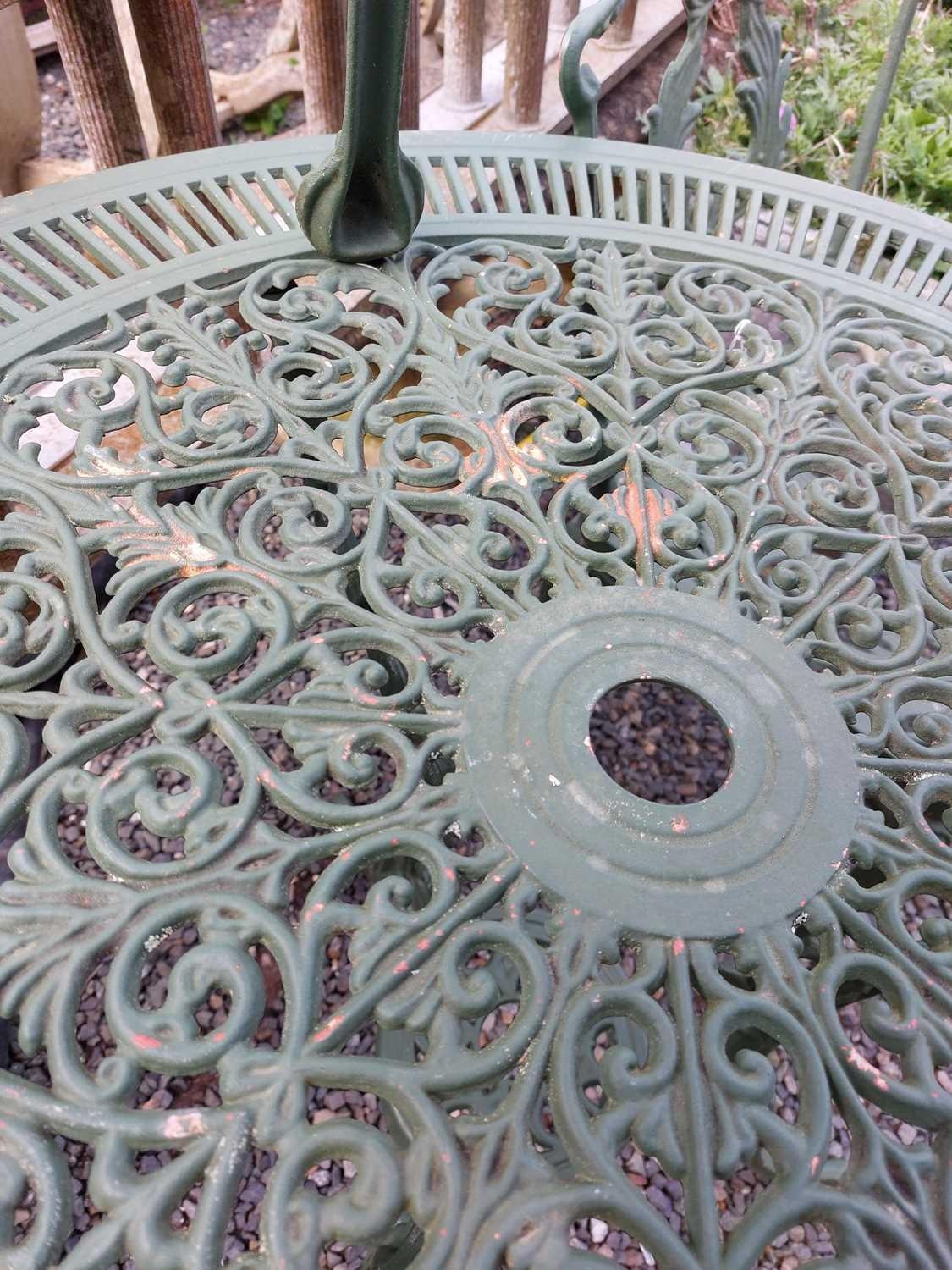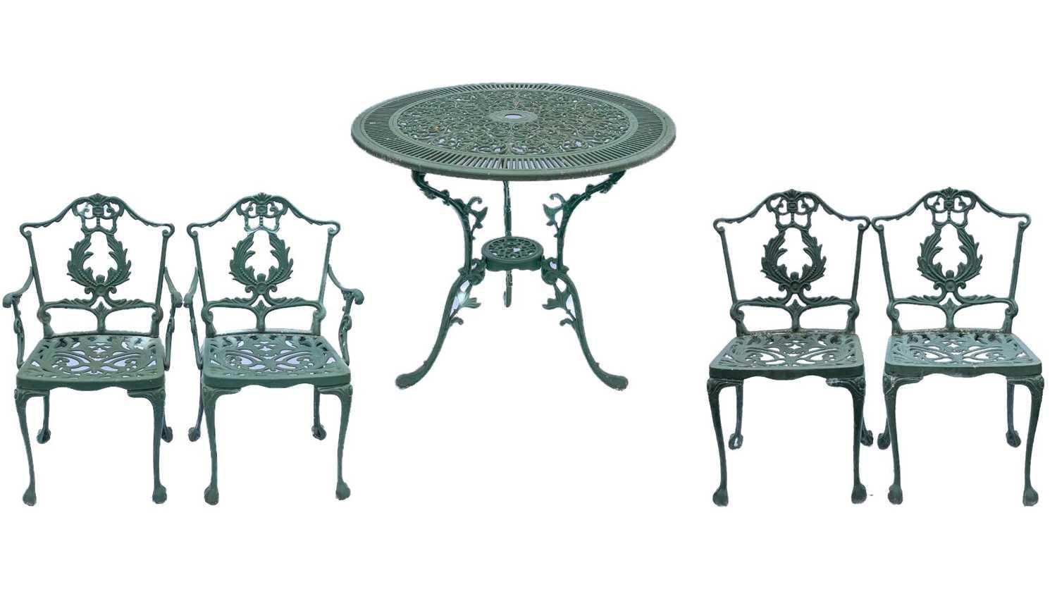 A green painted metal bistro set. Comprising a circular table, height 68.5cm, diameter 80cm, and four chairs (5).