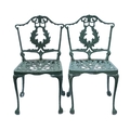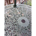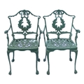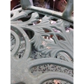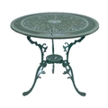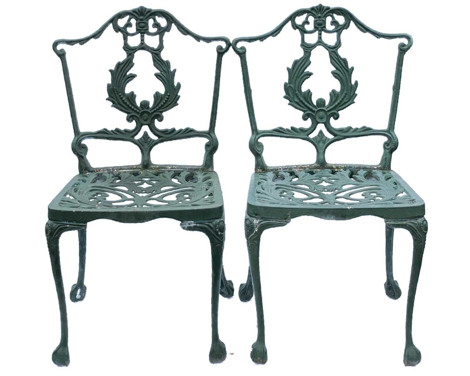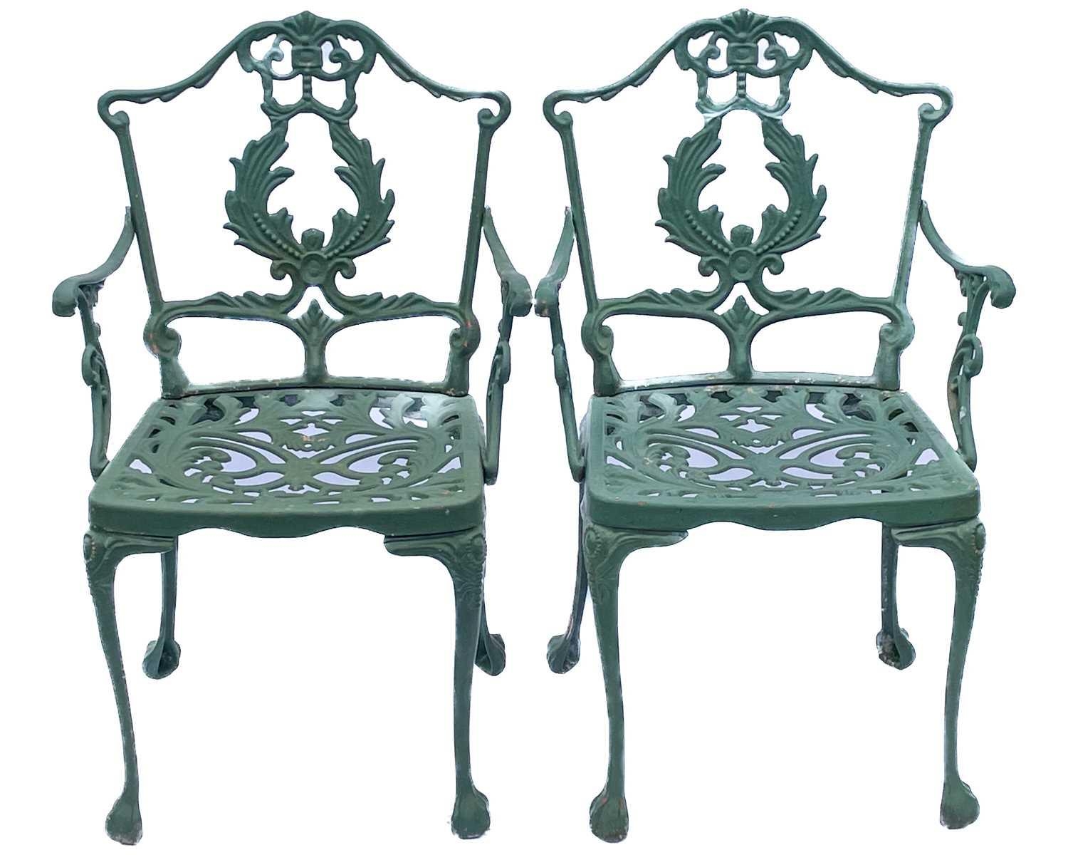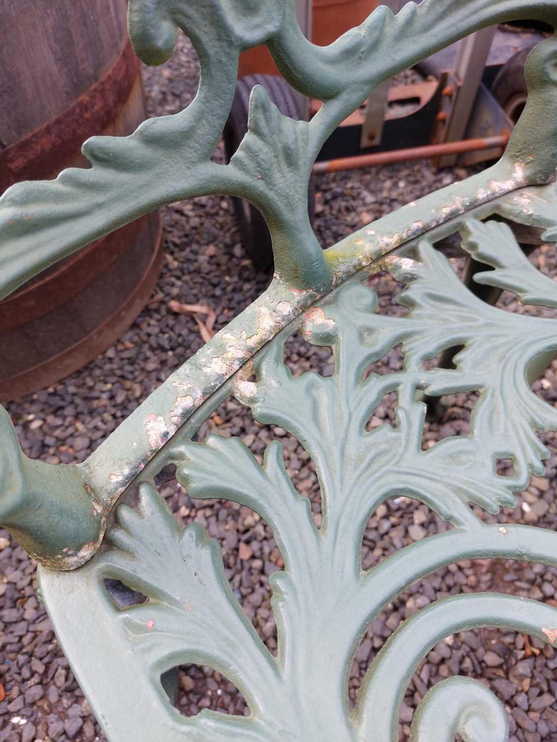 A green painted metal bistro set. Comprising a circular table, height 68.5cm, diameter 80cm, and four chairs (5).