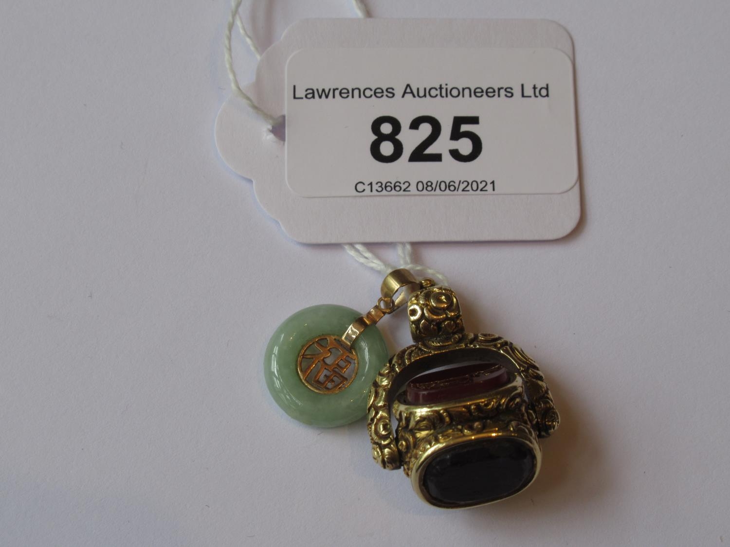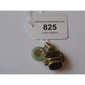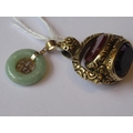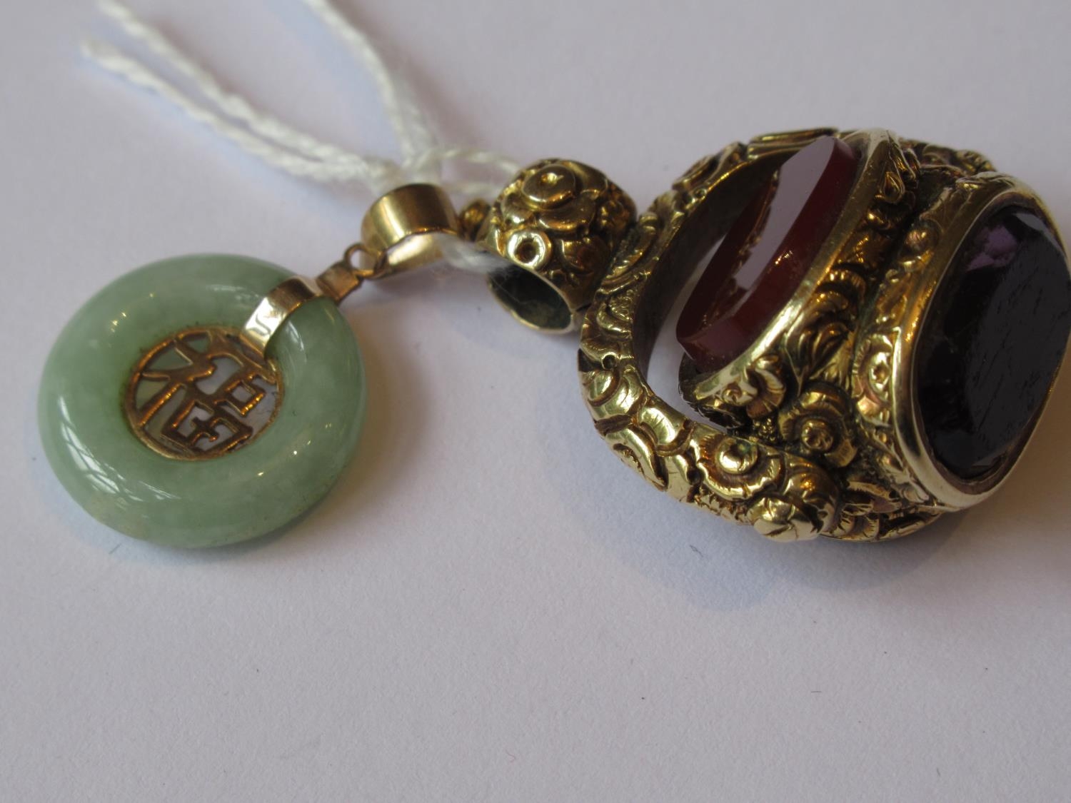 Yellow metal triple revolving fob together with a small Chinese 9ct gold mounted jade pendant