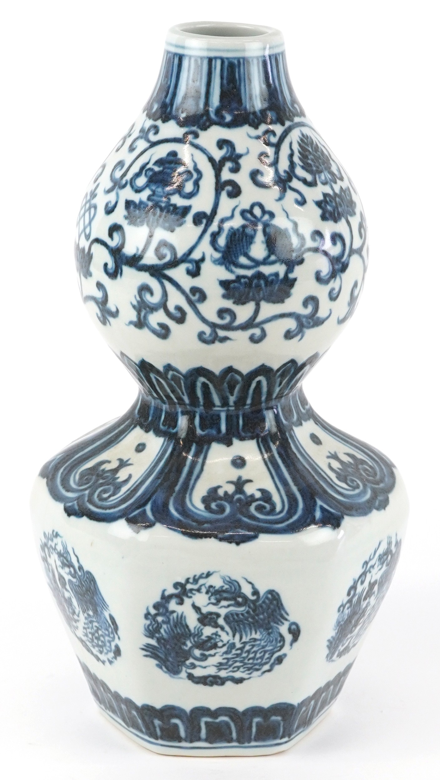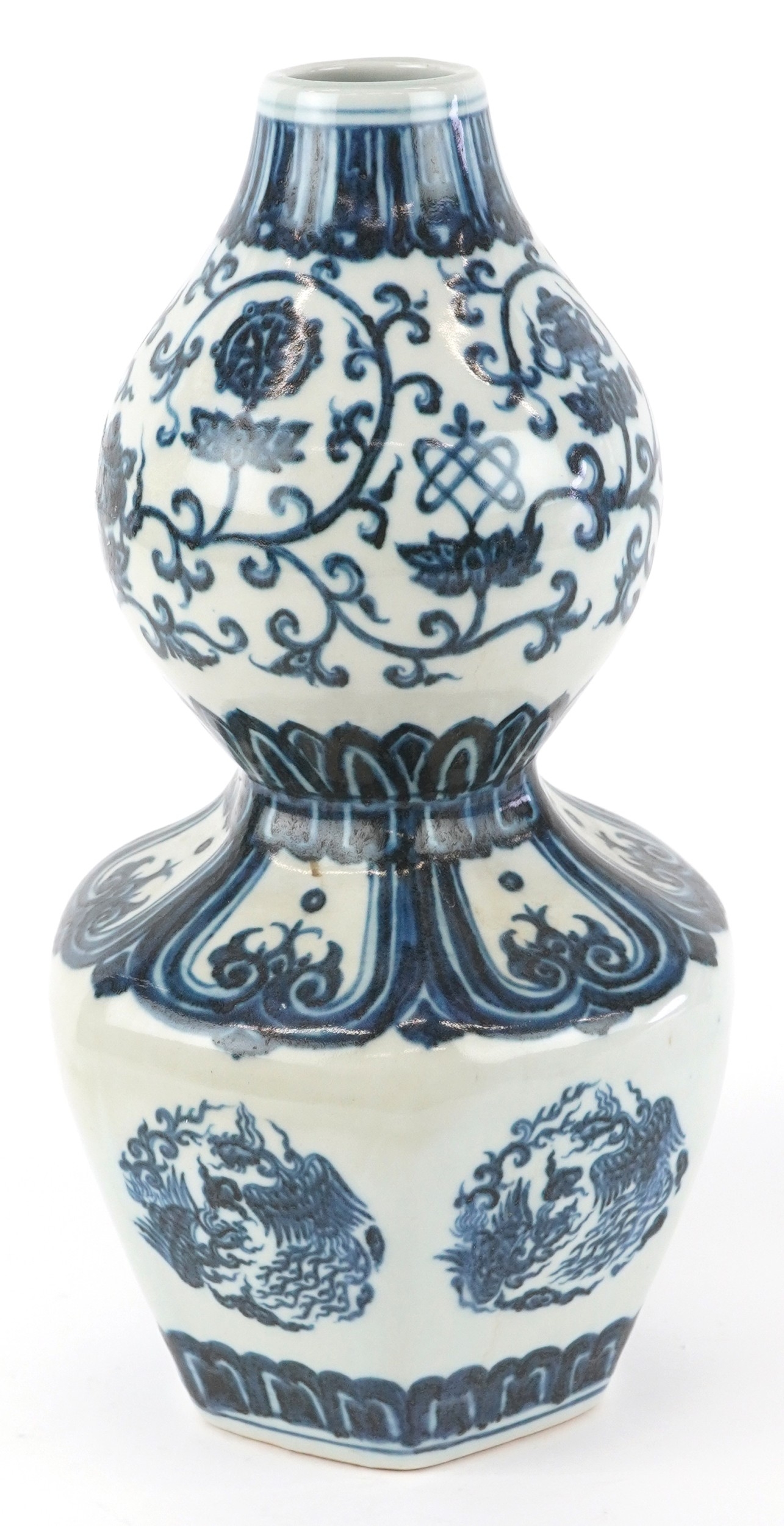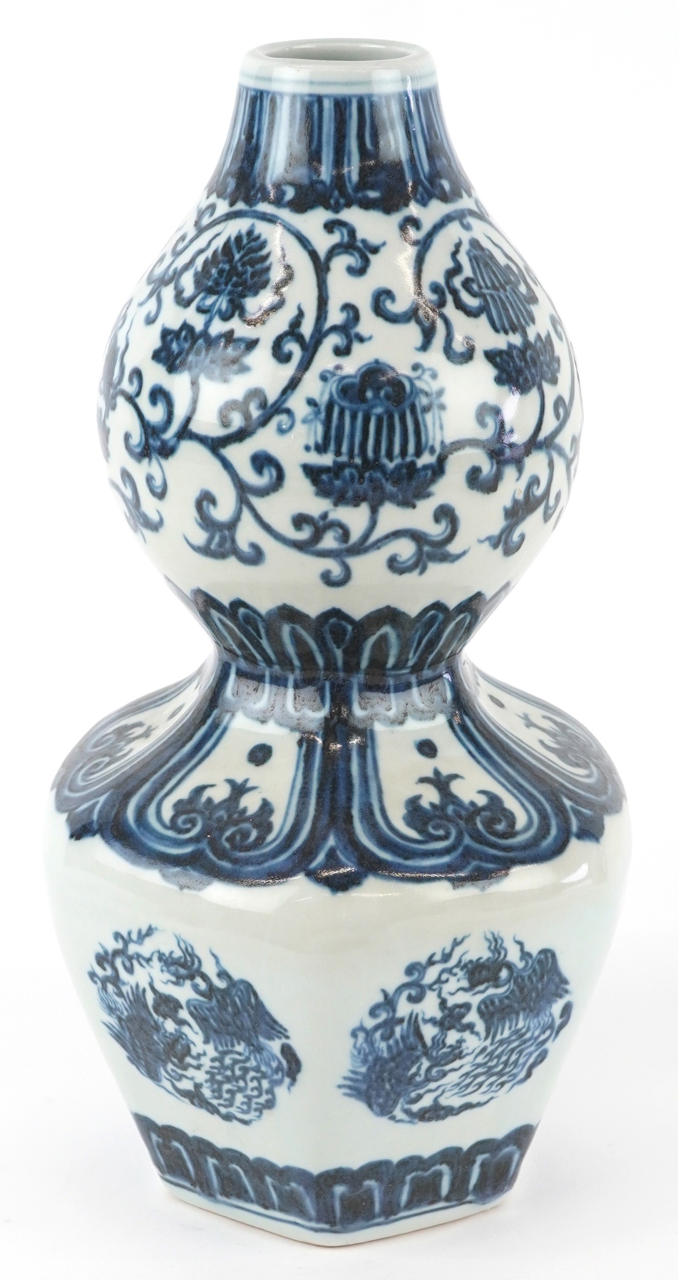 A Chinese blue and white porcelain double gourd vase hand painted with flower heads and mythical animals, six figure character marks to the base, 29cm high.
