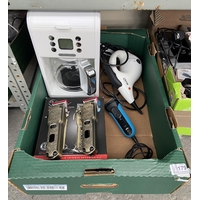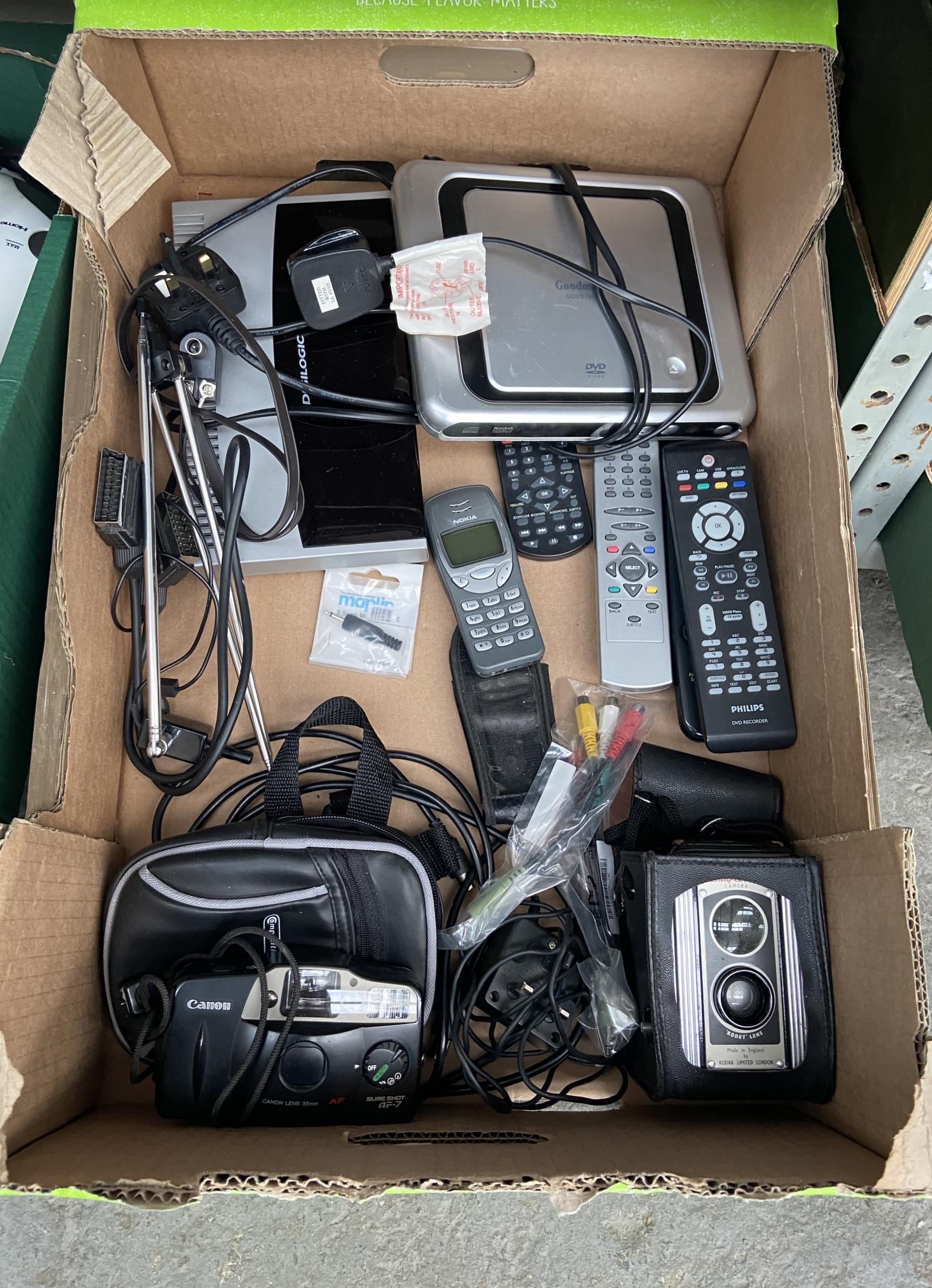 Box containing electronics including vintage cameras, mobile phones, remotes etc
