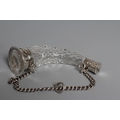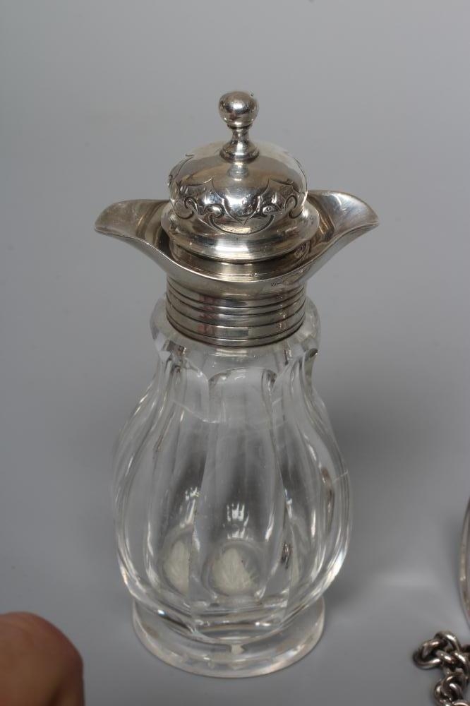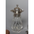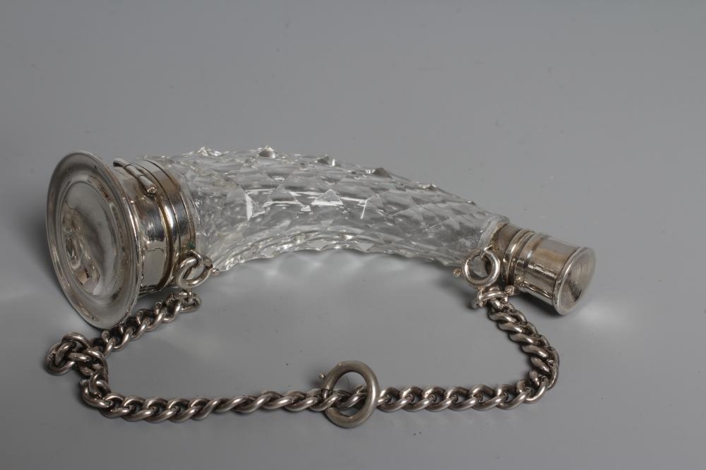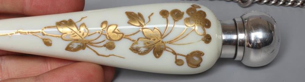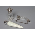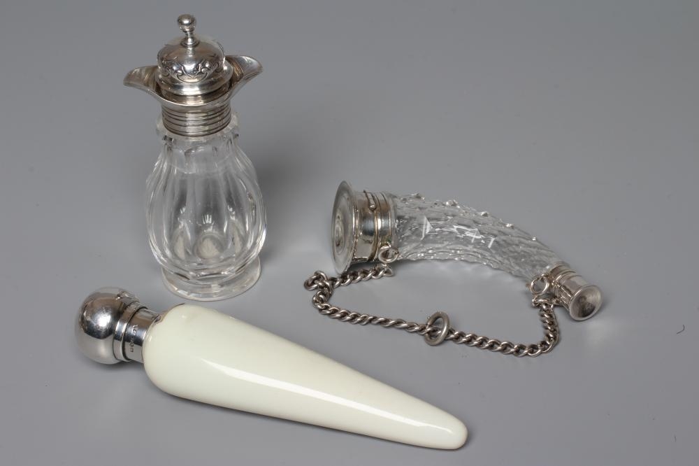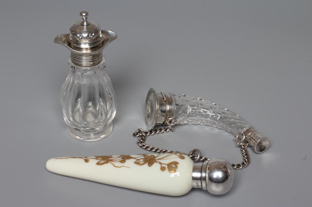 A THOMAS WEBB CREAM OPALINE GLASS SCENT FLASK of conical form with gilded flowers in the style of Jules Barbe, with silver mount and screw on cover, Birmingham 1884, 5" high, together with a diamond cut clear glass scent horn/vinaigrette with unmarked mounts to each end, 4" long, on a silver chain, and a clear glass baluster condiment by Urquhart & Hart, London 1876, 3 1/2" high (3)