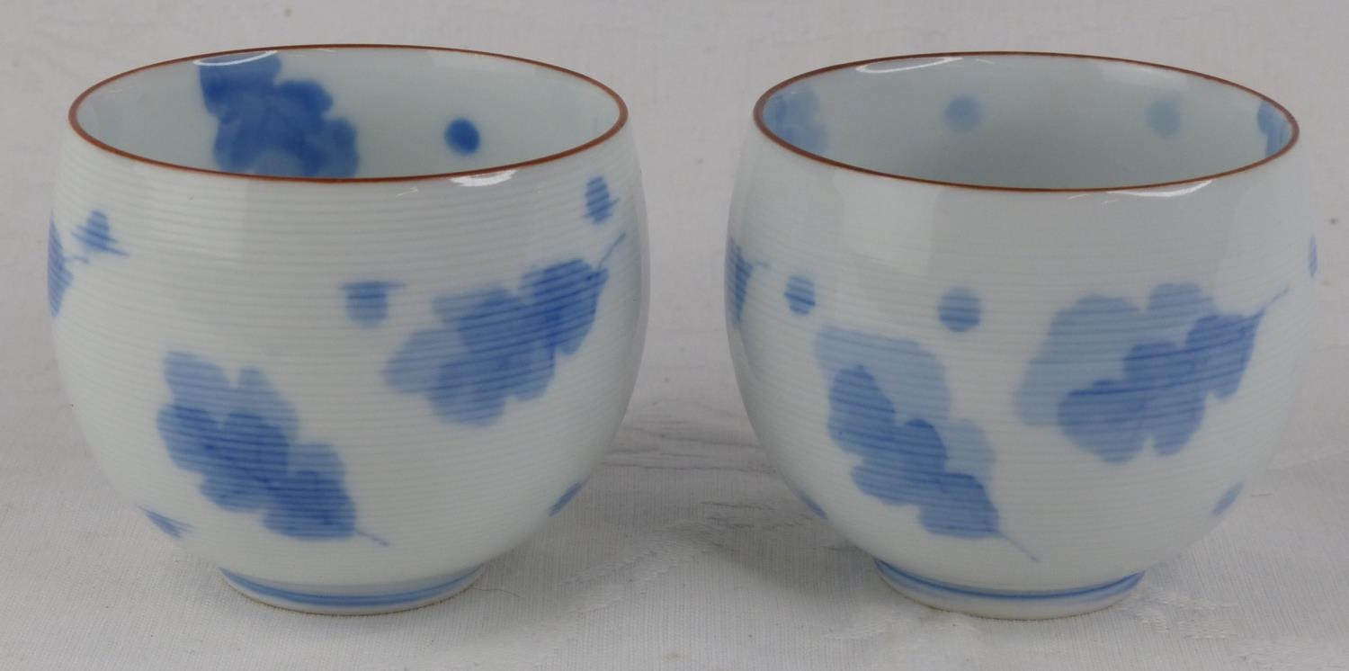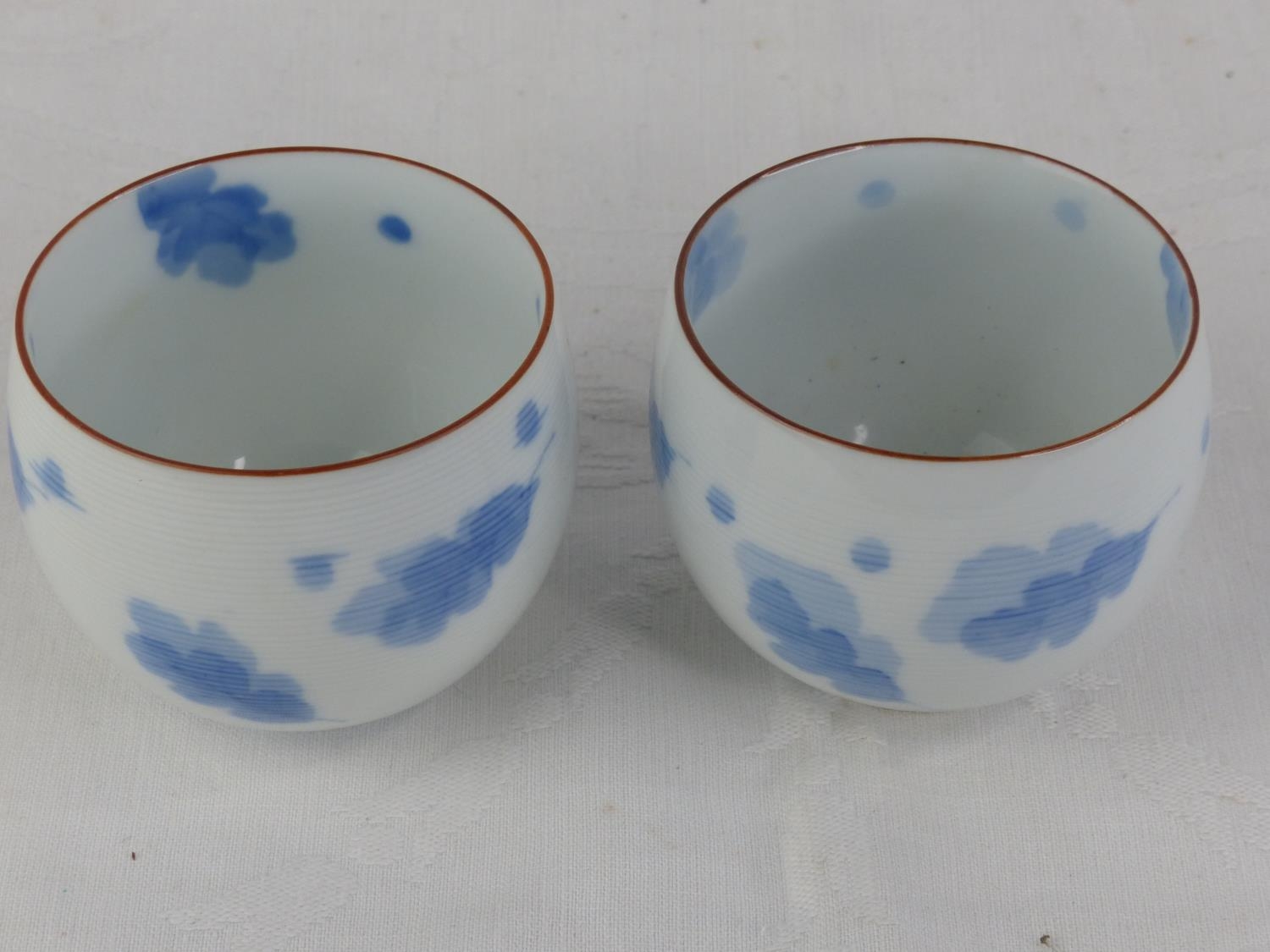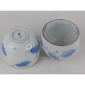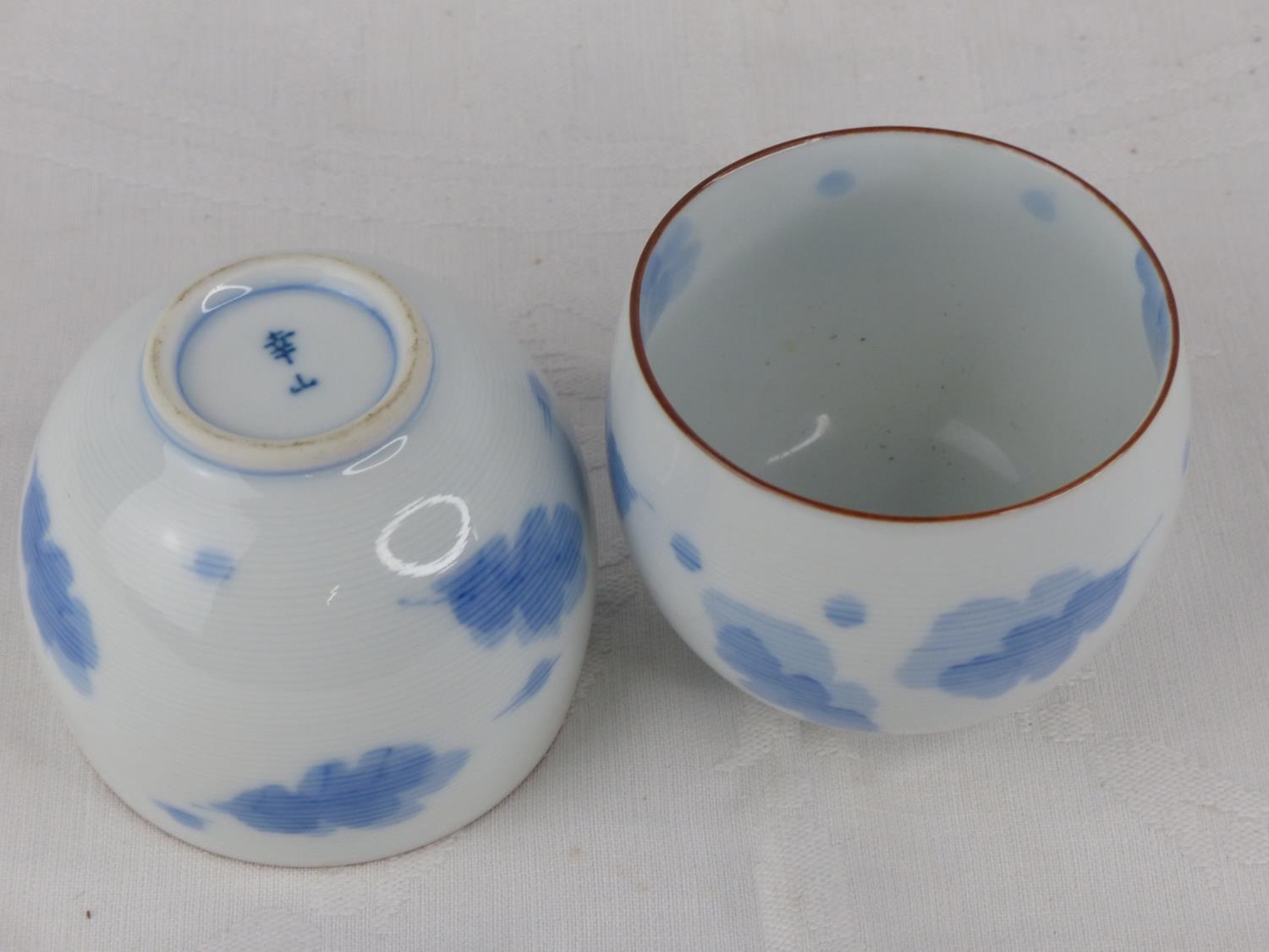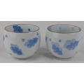 A pair of antique Chinese blue and white patterned tea bowls, each signed to base.