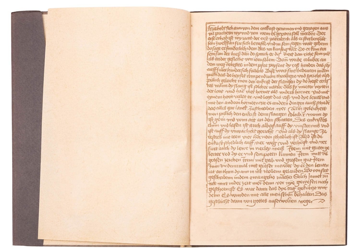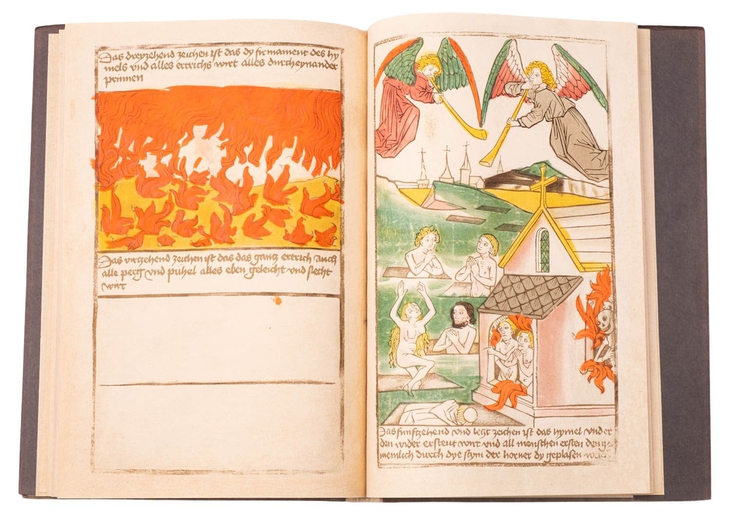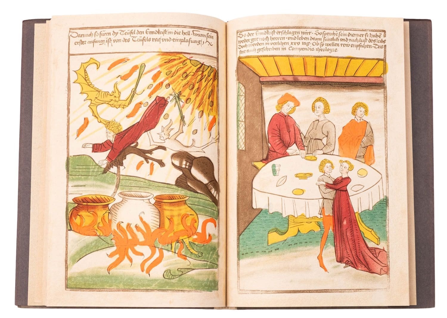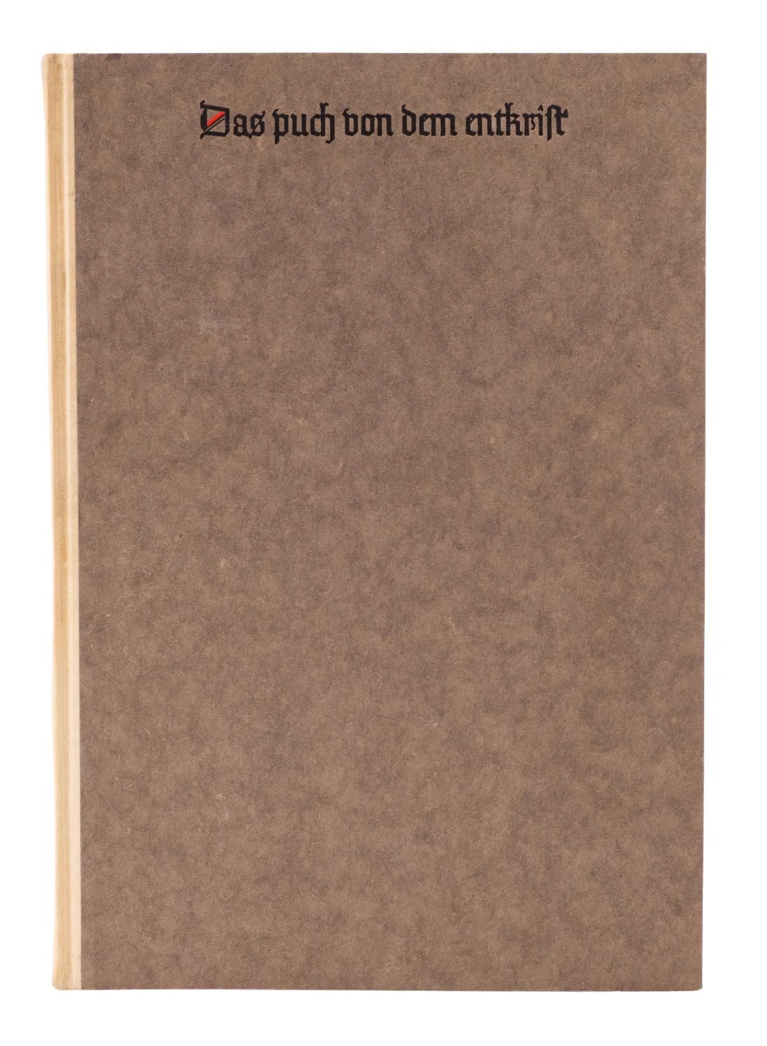DAS PUCH VON DEM ENTKRIST. [Blockbücher I, facsimile of the C15th block book], Leipzig: Insel-Verlag, 1925, numbered 369/500, 19 double feuillets with colour illustrations, orig. plain brown dustjacket, orig. vellum-backed boards, titled to upper cover, 4to. With accompanying 4.pp leaflet introduction by Kurt Pfister.