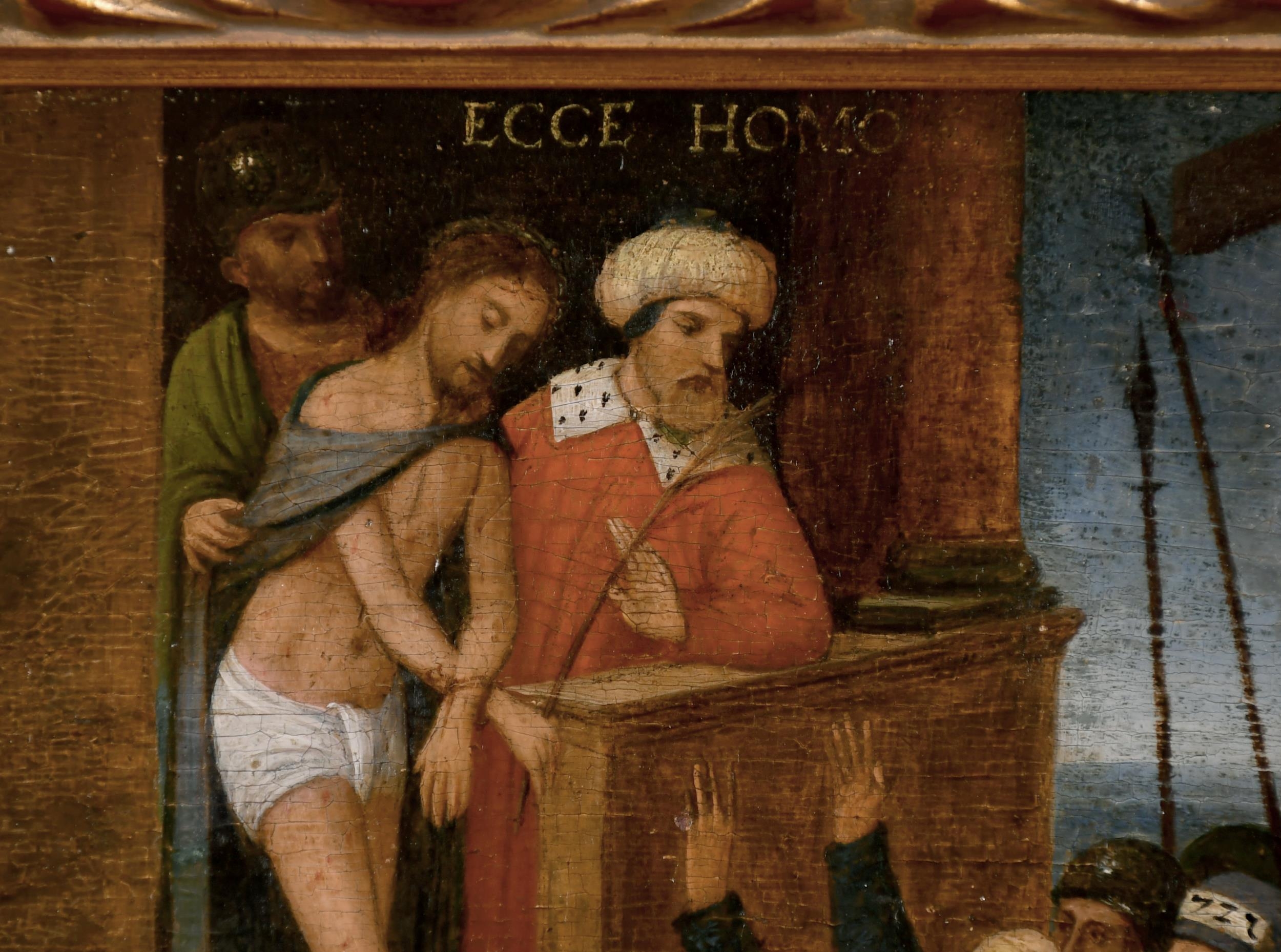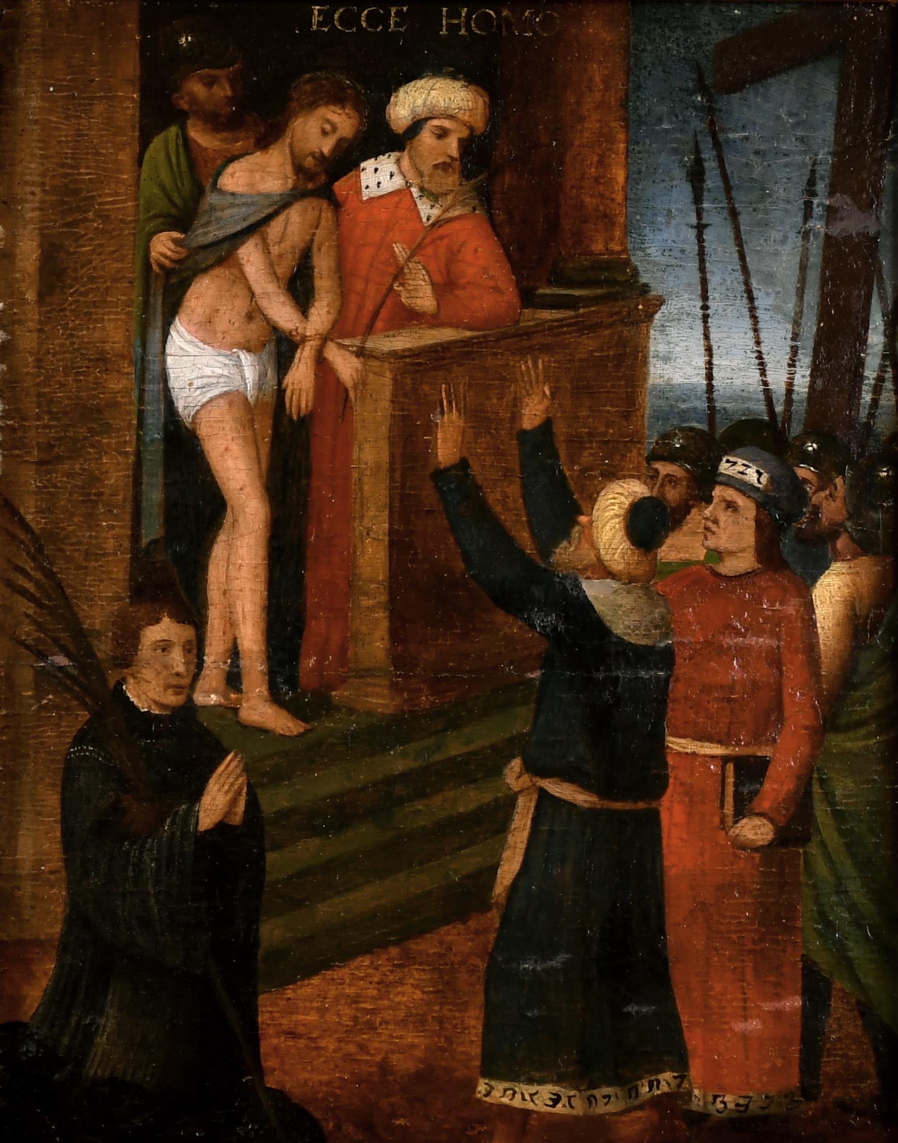 16th Century Northern European School. "Ecce Homo", Oil on Panel, Inscribed, 8.5" x 6.75" (21.6 x 17.2cm)