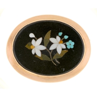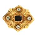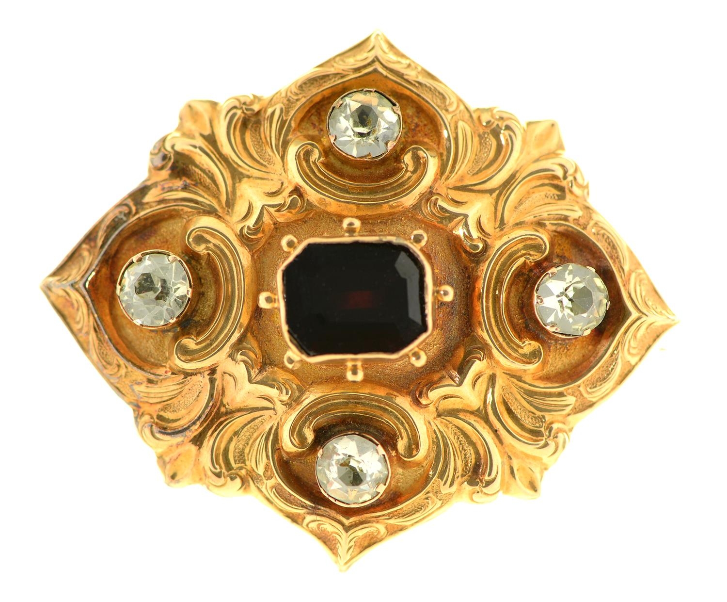 A Victorian garnet, green stone and gold brooch, mid 19th c, the back set with lock of hair, 40mm, 8g