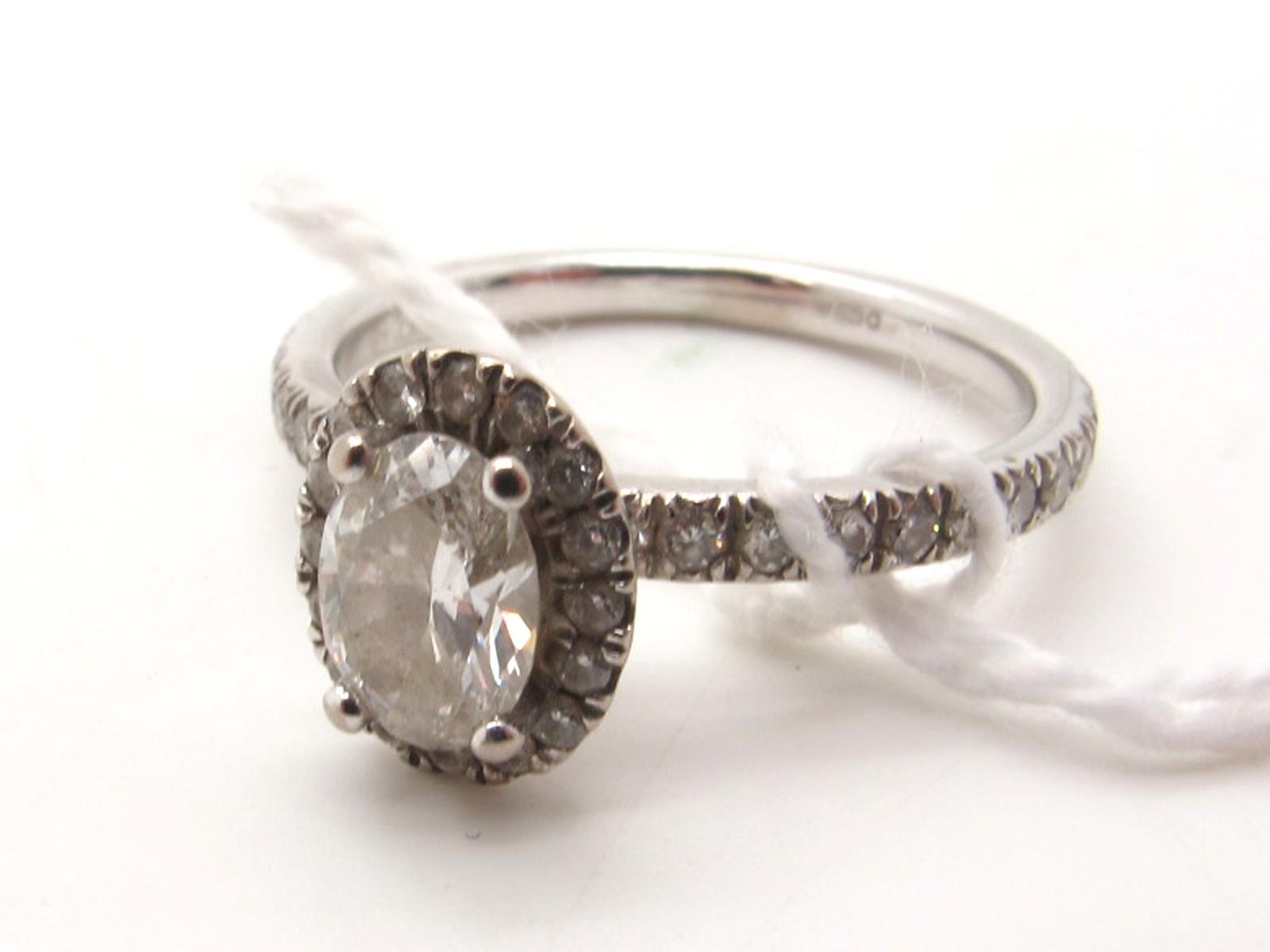 Beaverbrooks Maple Leaf Diamonds; A Modern 18ct White Gold Oval Cut Single Stone Diamond Halo Ring, oval four claw set within halo of uniform brilliant cut stones, between diamond set shoulders and band, stamped ".91" (finger size L), in original ring box, complete with Beaverbrooks Maple Leaf Diamond Certificate, stating total diamond content 0.91ct, clarity SI1, colour G.
