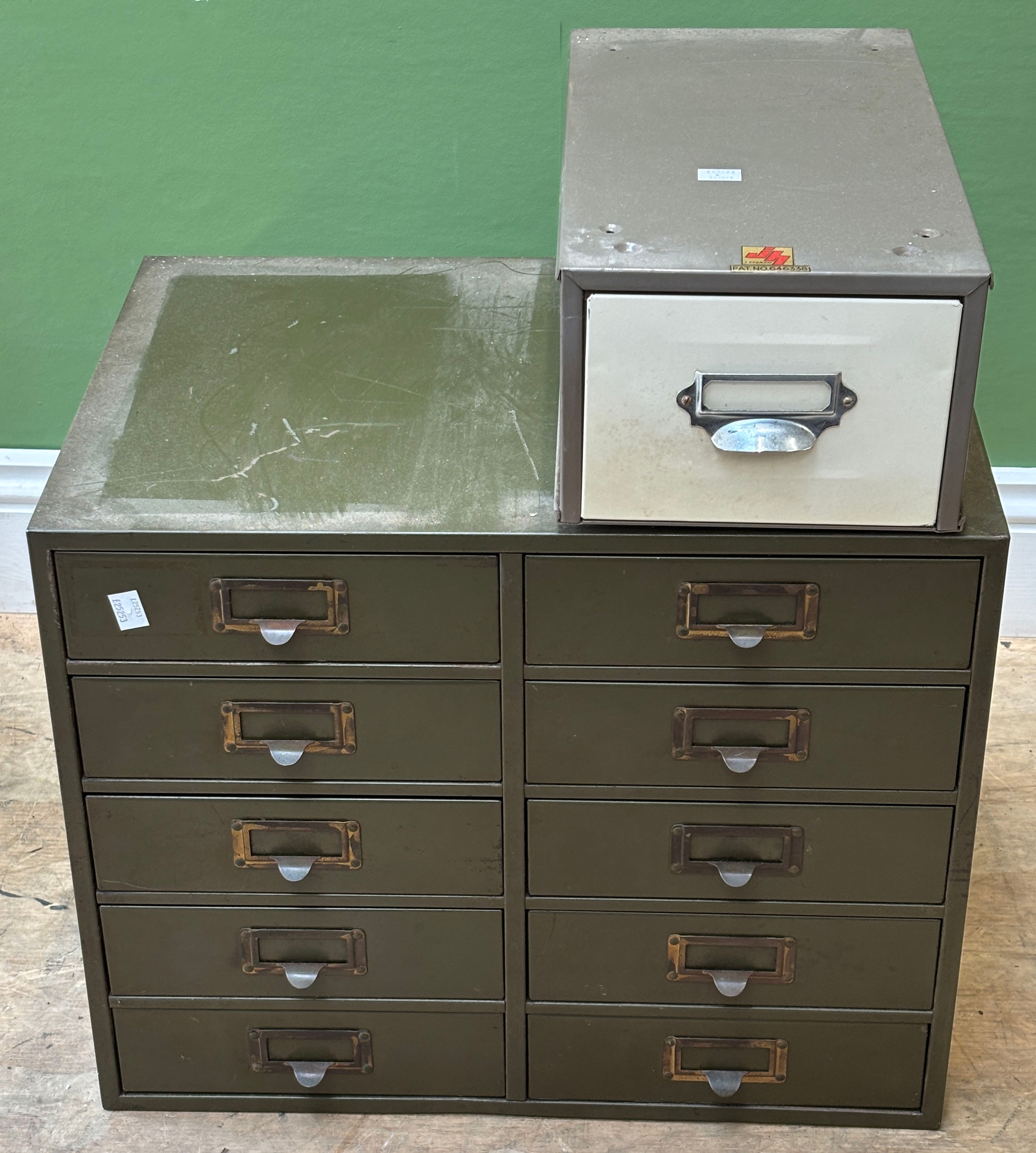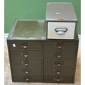 An industrial style filing cabinet of 10 drawers, 53x38x42cm; together with a further single filing drawer