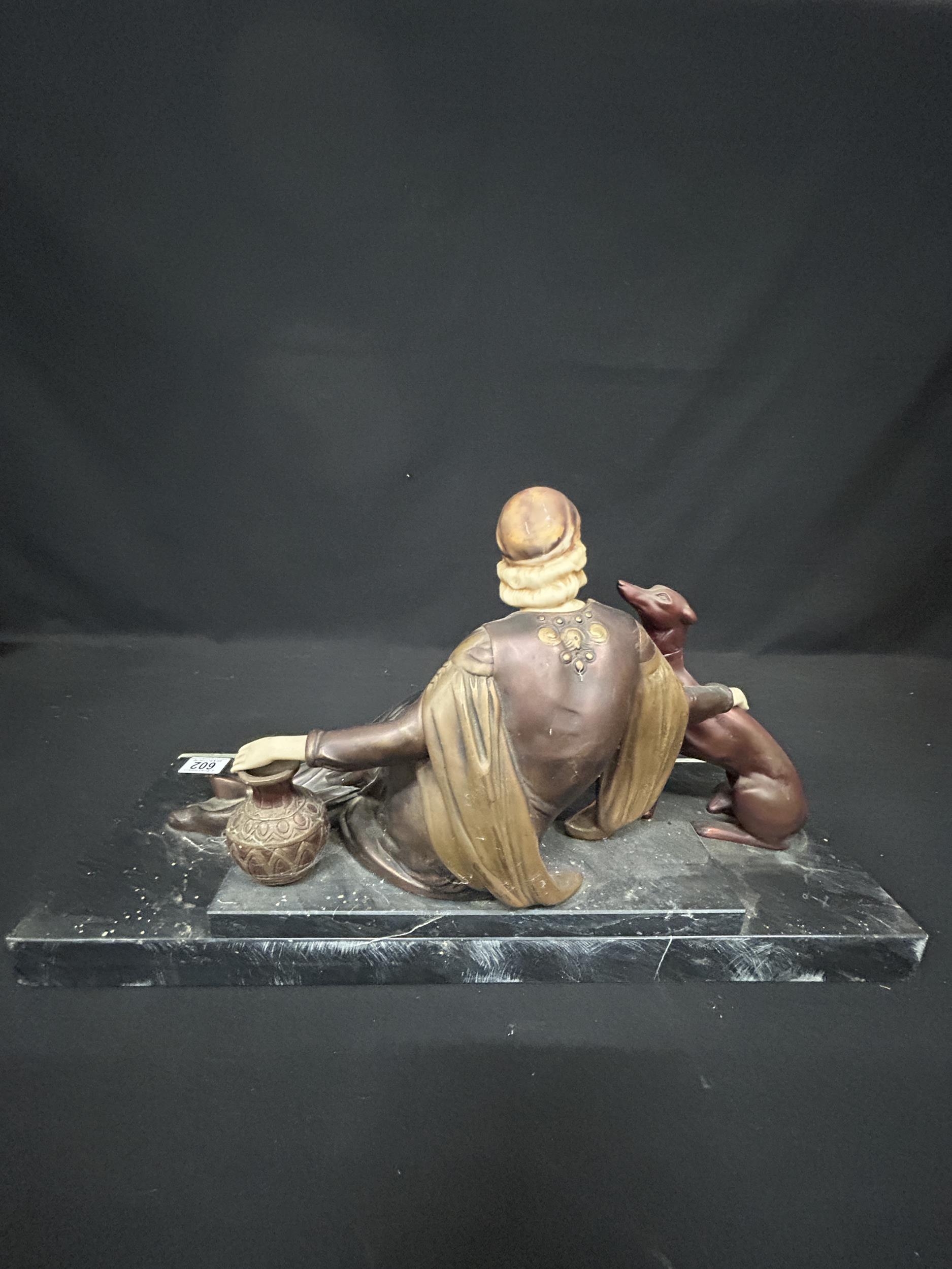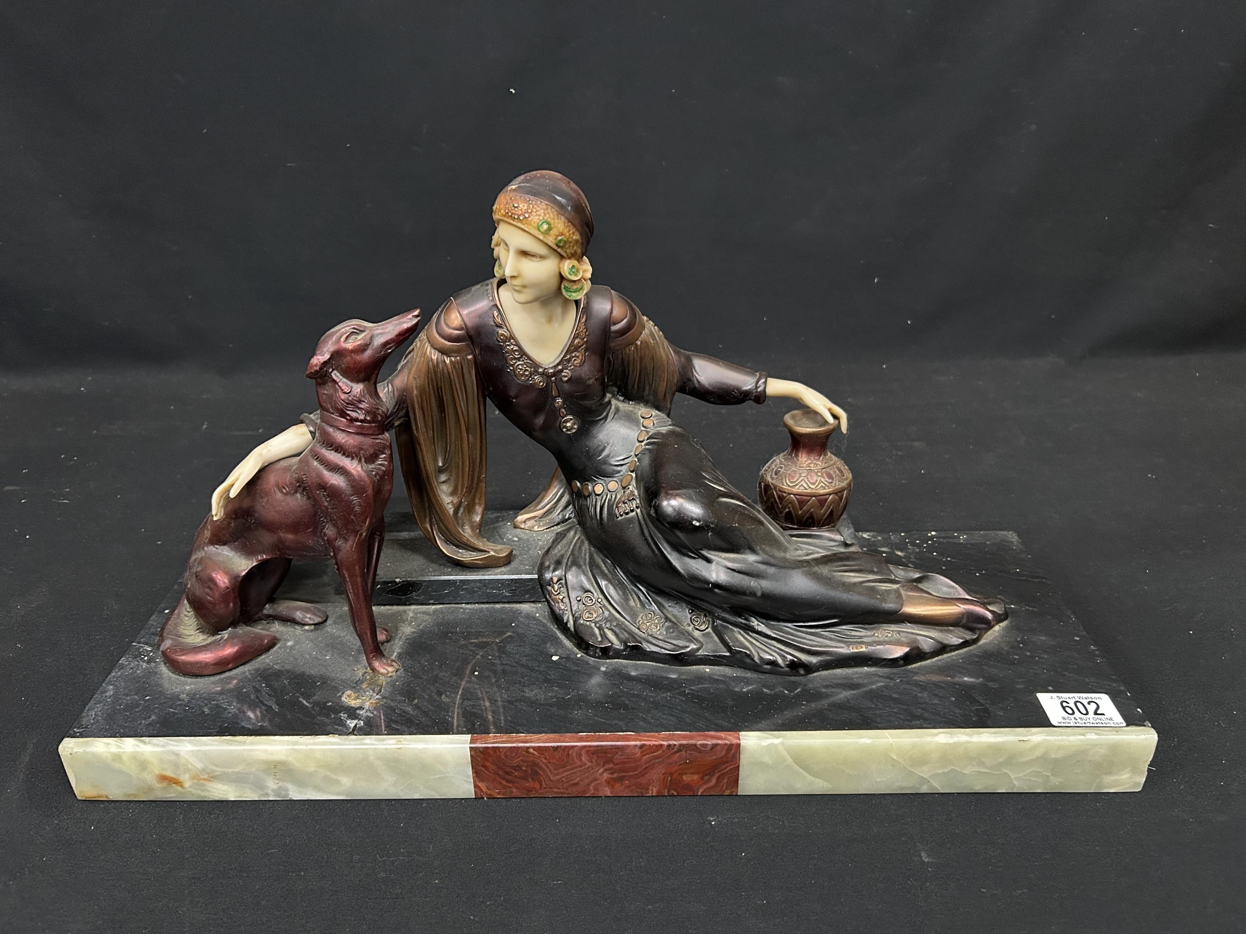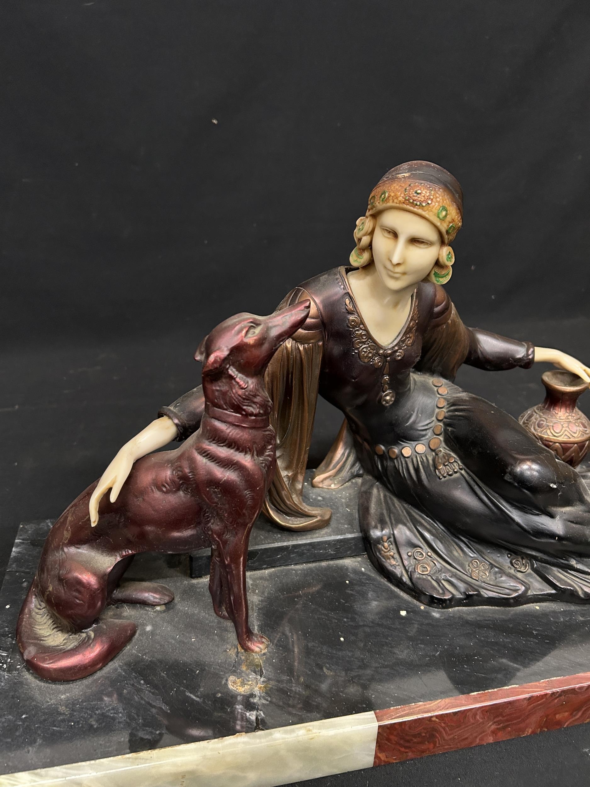 Art Deco Lady & Dog Figure, on heavy marble base, length 58 cms, width 21 cms