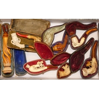 A collection of pipes, to include and Edwardian silver mounted Meerschaum Sherlock Holmes pipe, case and others by Falcon, Petersons and Stuart.