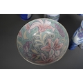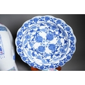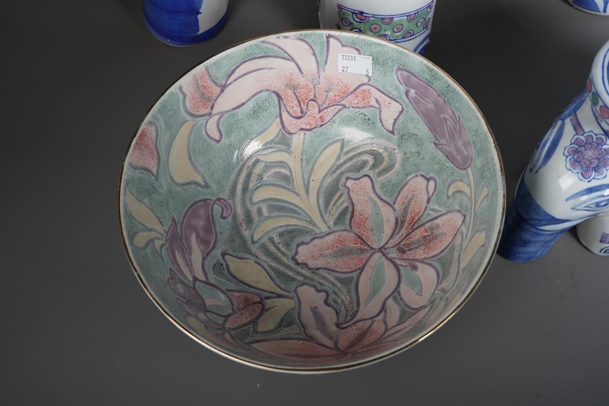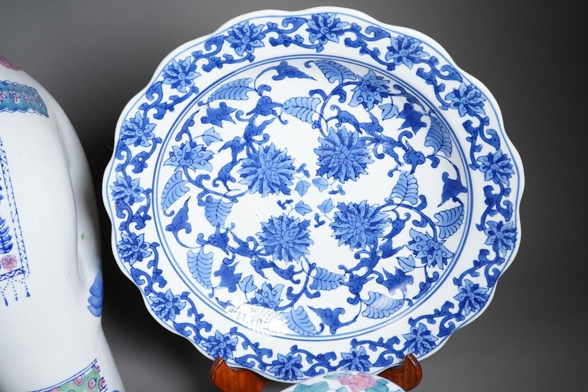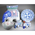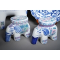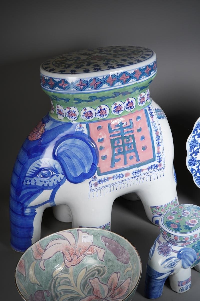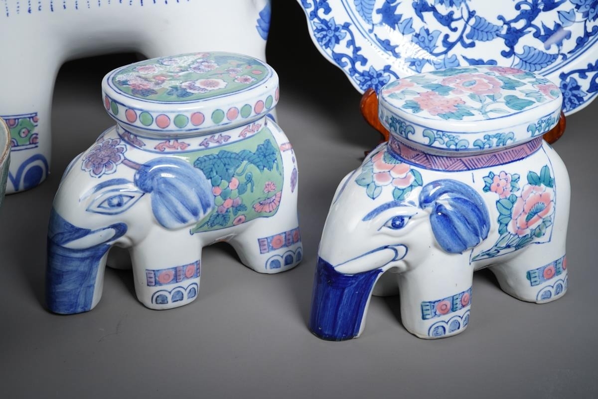 A small collection of modern Chinese ceramics, comprising a garden seat in the form of an elephant, height 46cm, together with two smaller elephant plant pot stands, a blue and white charger and a fruit bowl incised with floral decoration (5)