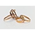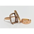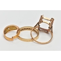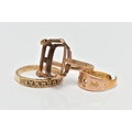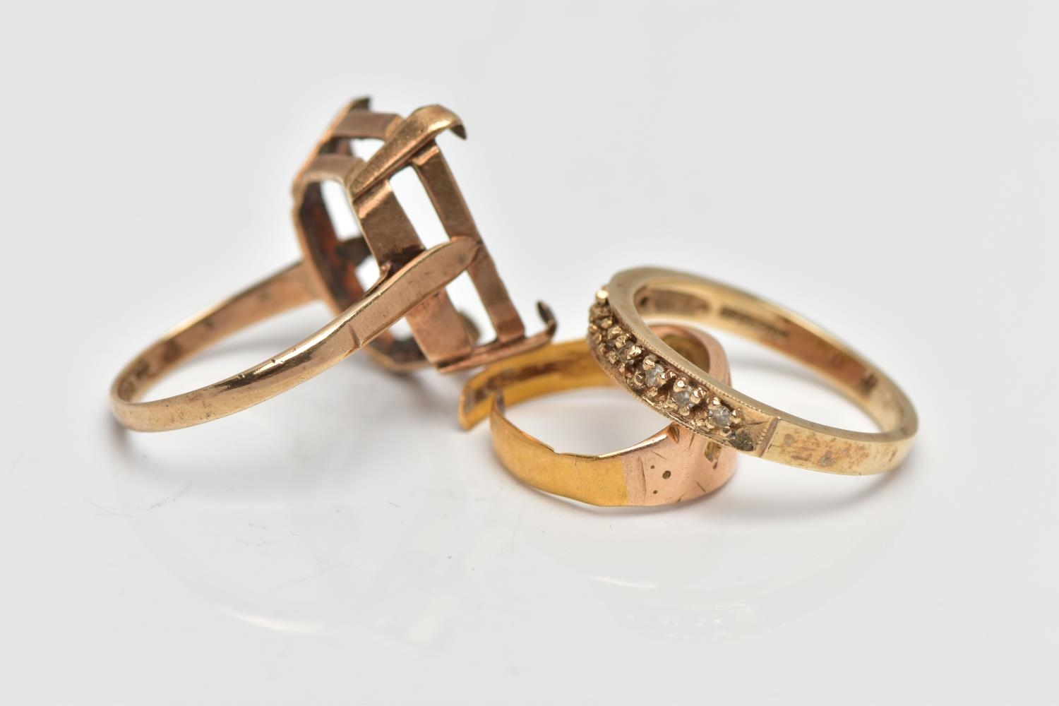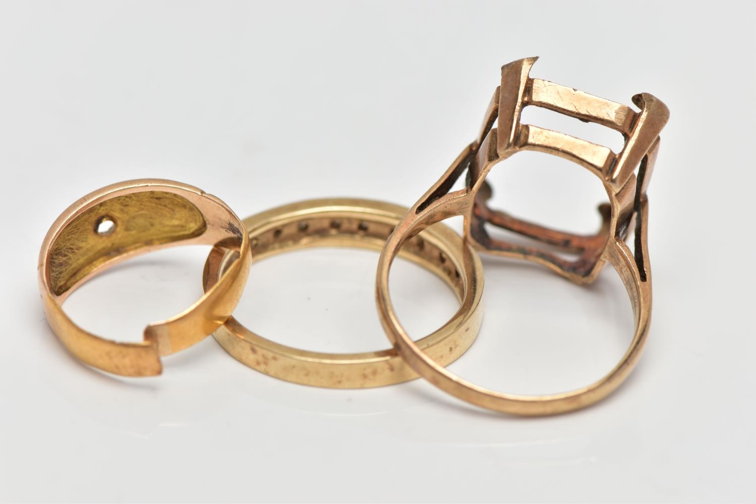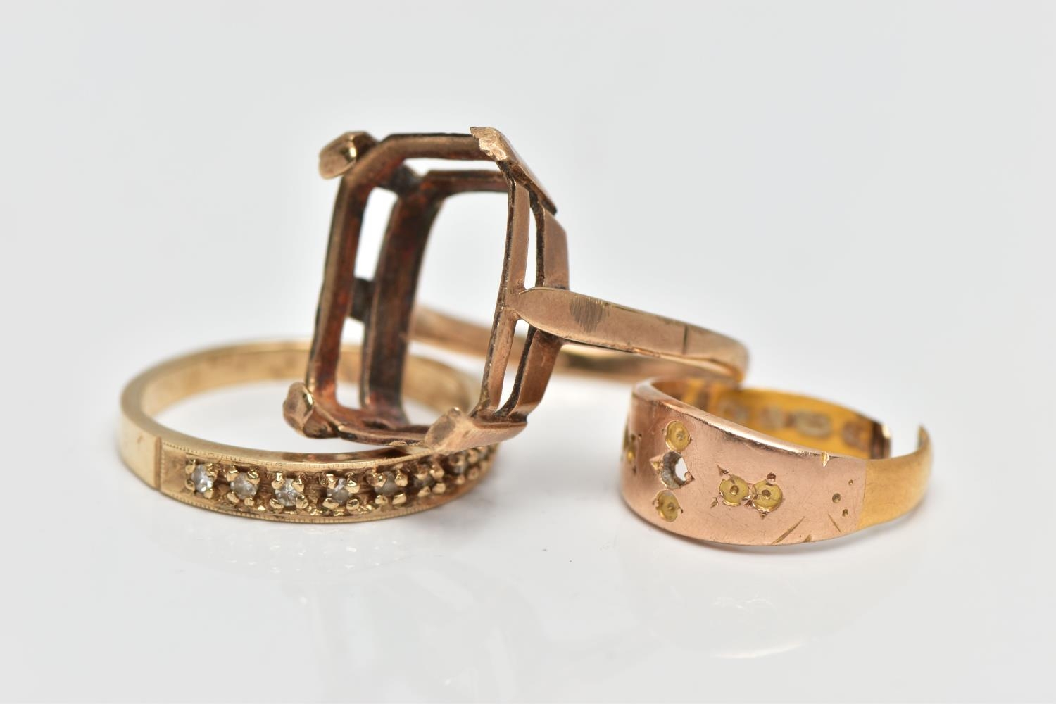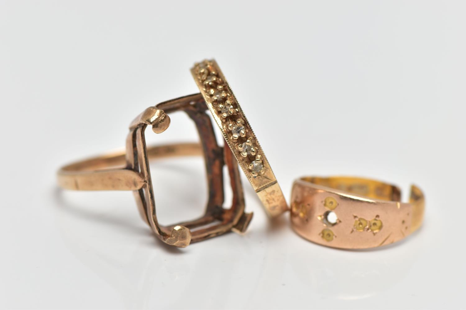 A 9CT GOLD DIAMOND ETERNITY BAND RING, AN AF RING AND AN AF 22CT GOLD RING, nine single cut diamonds grain set with milgrain edges, leading onto a polished yellow metal band, hallmarked 9ct Birmingham 1984, ring size P, together with a 9ct gold AF mount, designed for a large rectangular stone, hallmarked 9ct Birmingham 1966, ring size P, approximate gross weight 5.6 grams, an AF 22ct gold ring, stones removed and split shank, hallmarked 22ct Birmingham, approximate gross weight 2 grams (condition report: first ring general moderate wear, all stones currently intact, overall condition good, second ring stone absent, two prongs damaged, third ring AF scrap)
