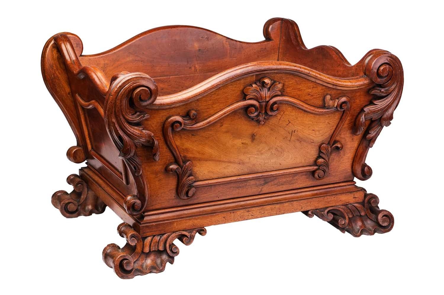 A large 19th-century mahogany wine cooler of shaped rectangular form, with scroll design on four feet, lead lining to the interior, 46 cm high x 71 cm x 55 cm.
