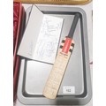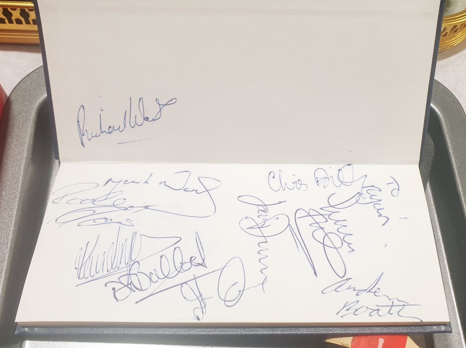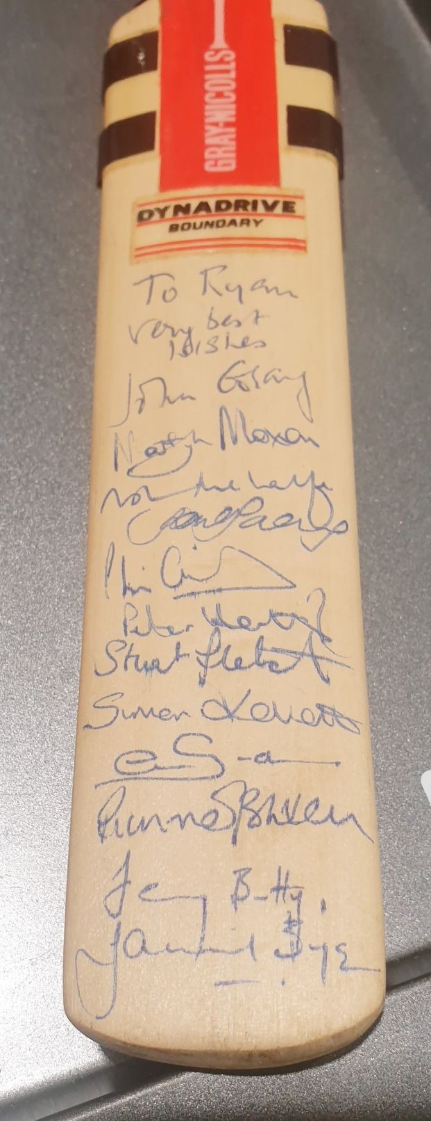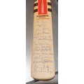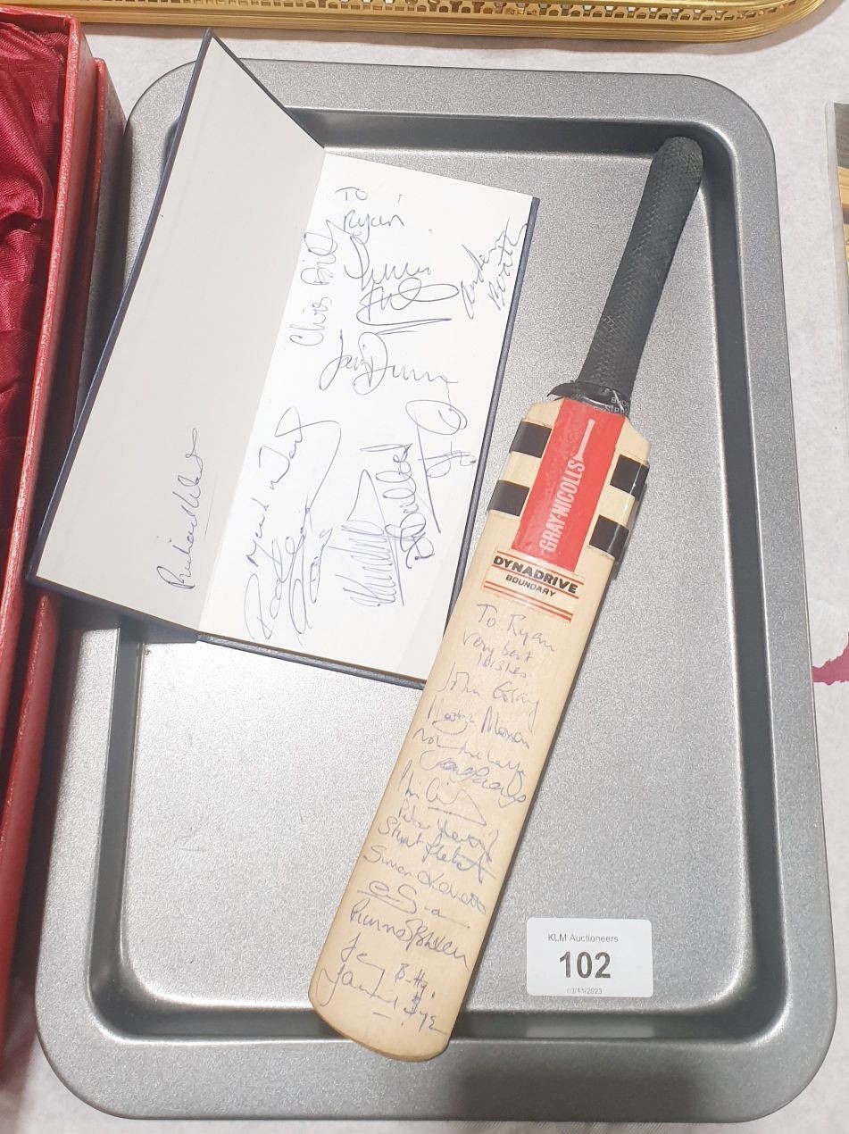 A miniature cricket bat signed by England players including Martyn Moxon, length 12" together with a Huddersfield Town diary which is signed by players including Andy Booth. UK shipping £14.