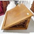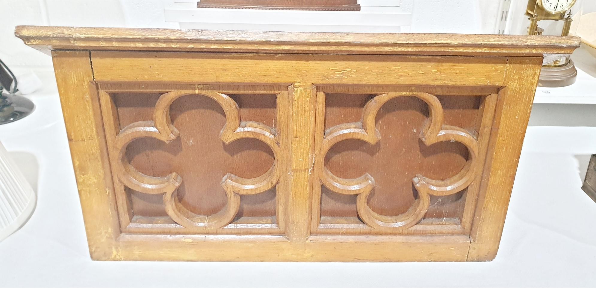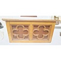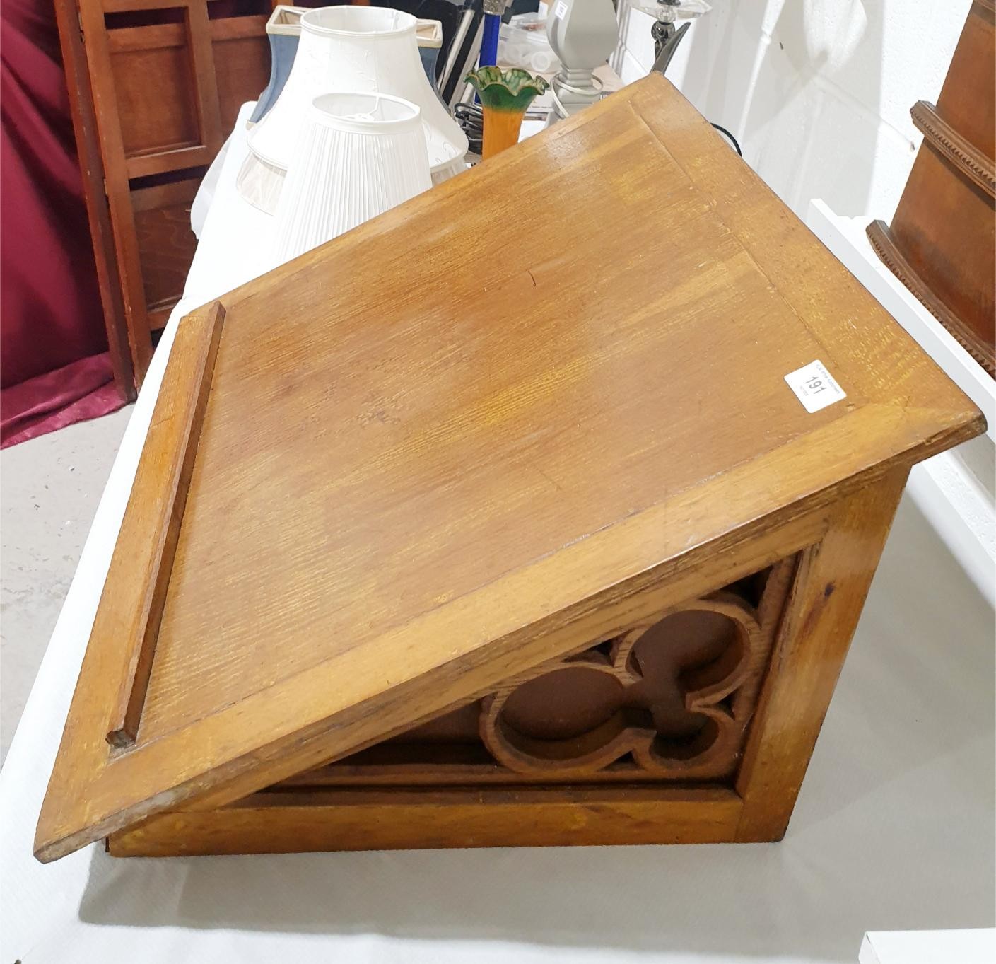 A vintage oak church lectern with trefoil and quatrefoil decoration, 62x54x34cm. No shipping. Arrange collection or your own packer and shipper, please. Electricals are sold as scrap.