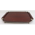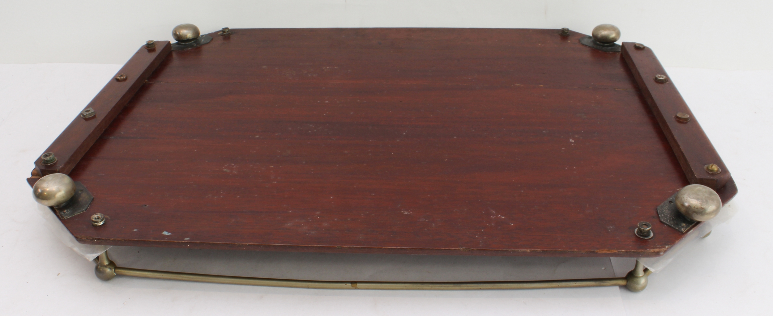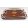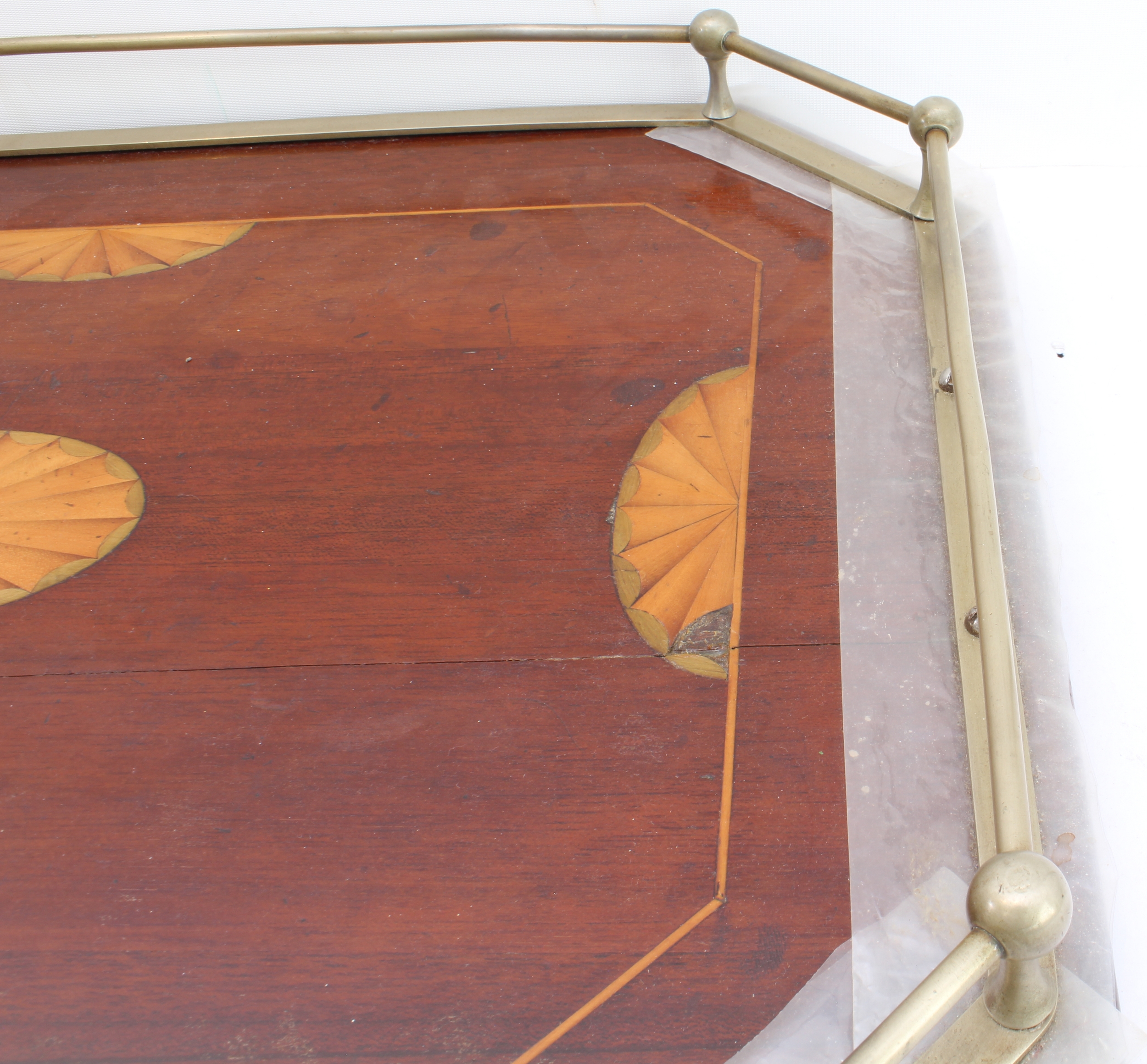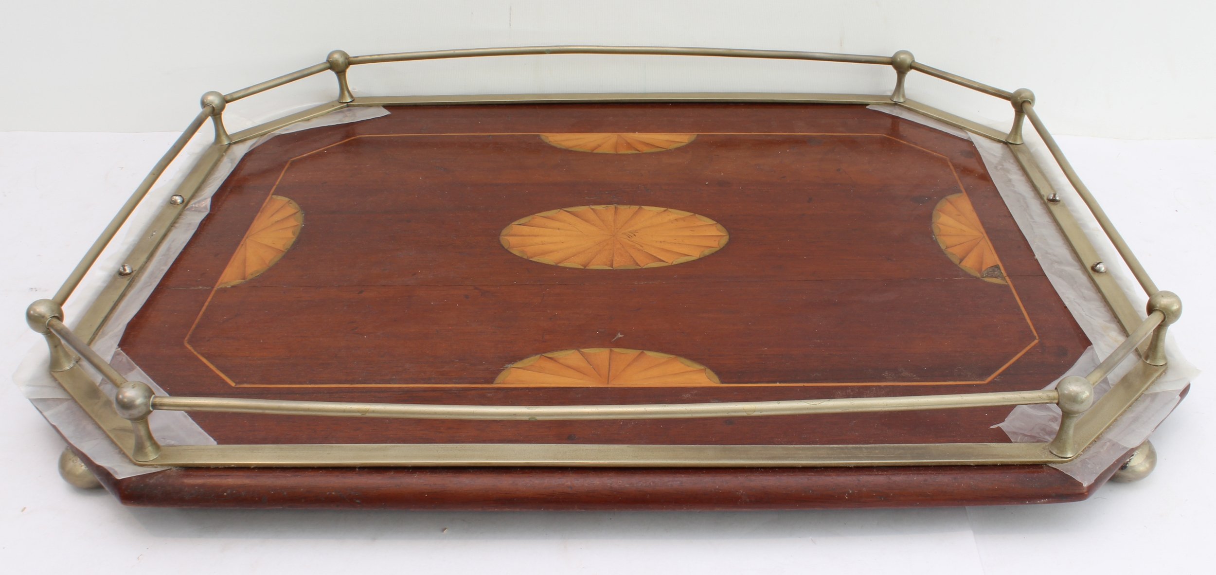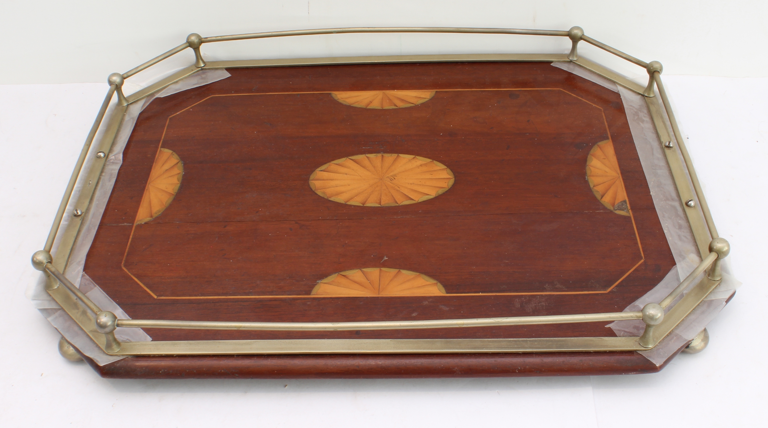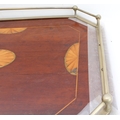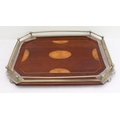An Edwardian octagonal mahogany serving tray: boxwood-strung and boxwood marquetry patera; silver-plated gallery (worn). (56 x 41.5 cm)