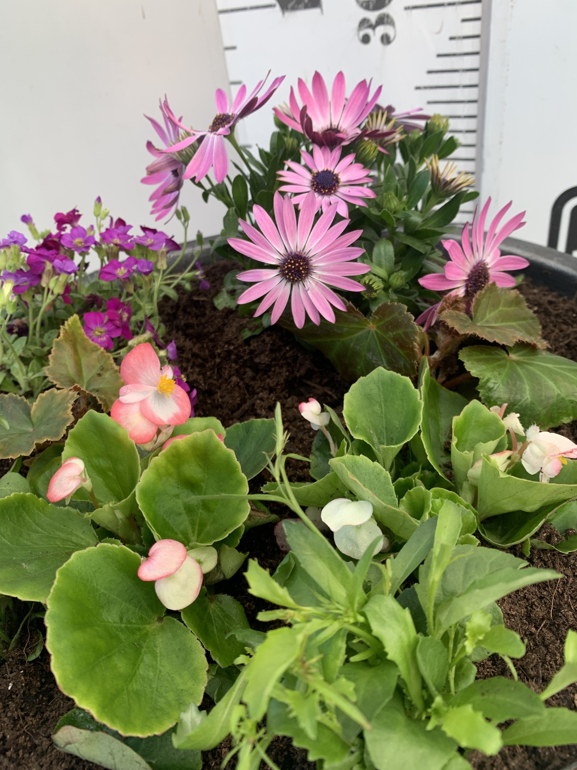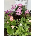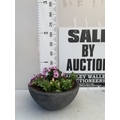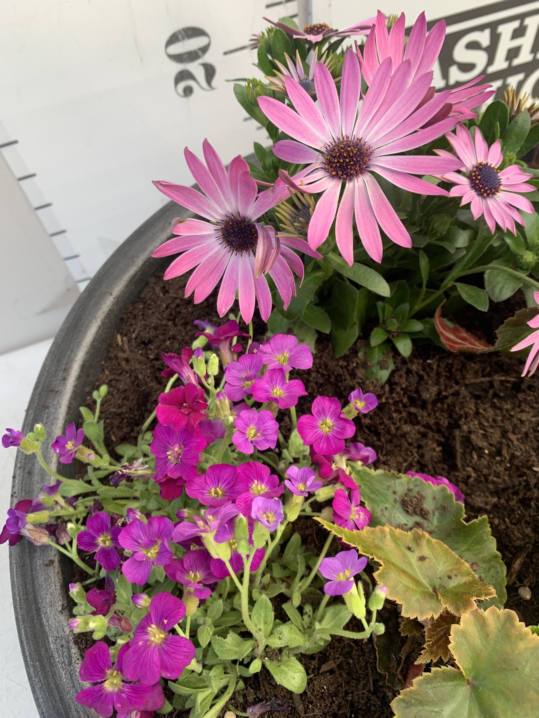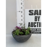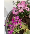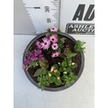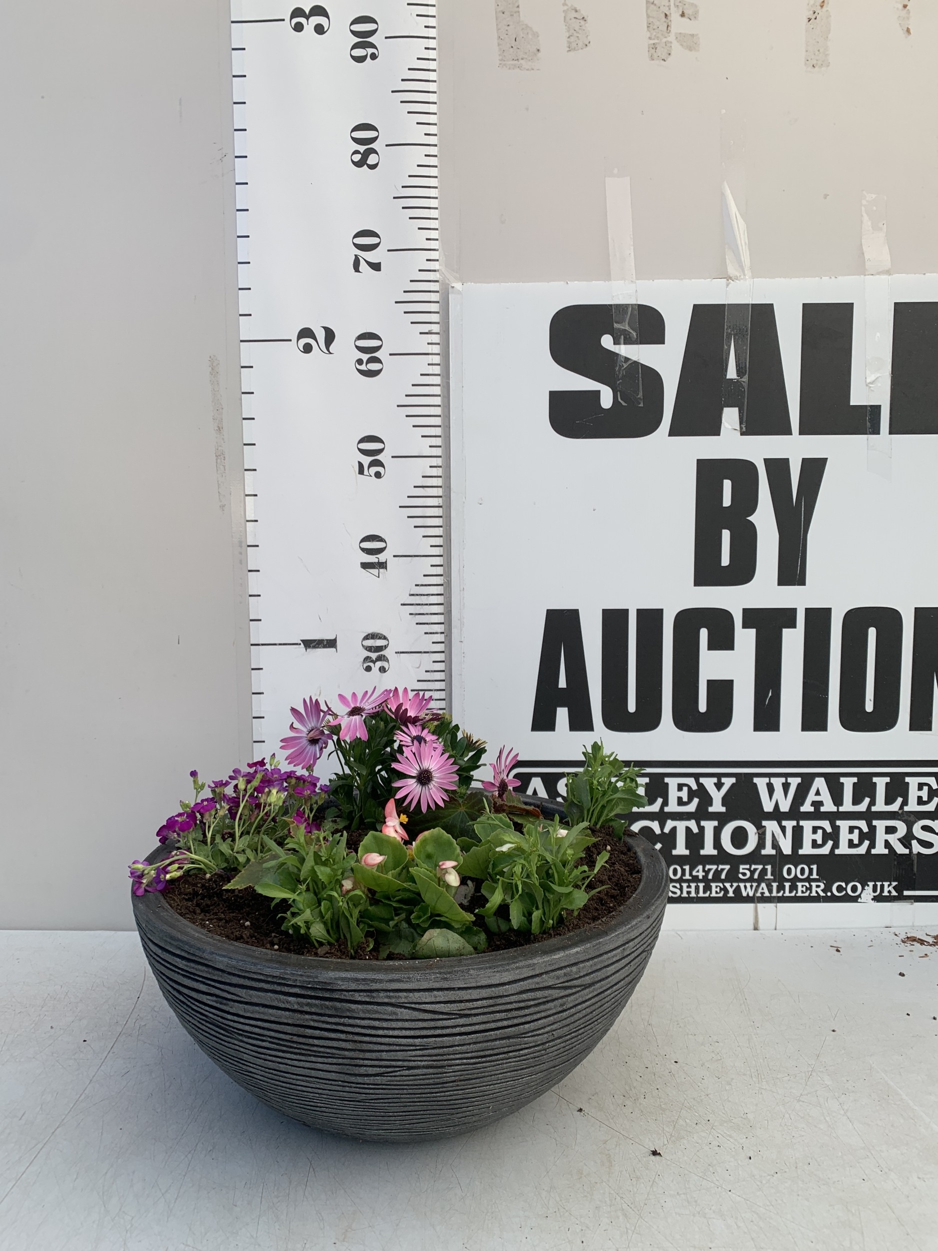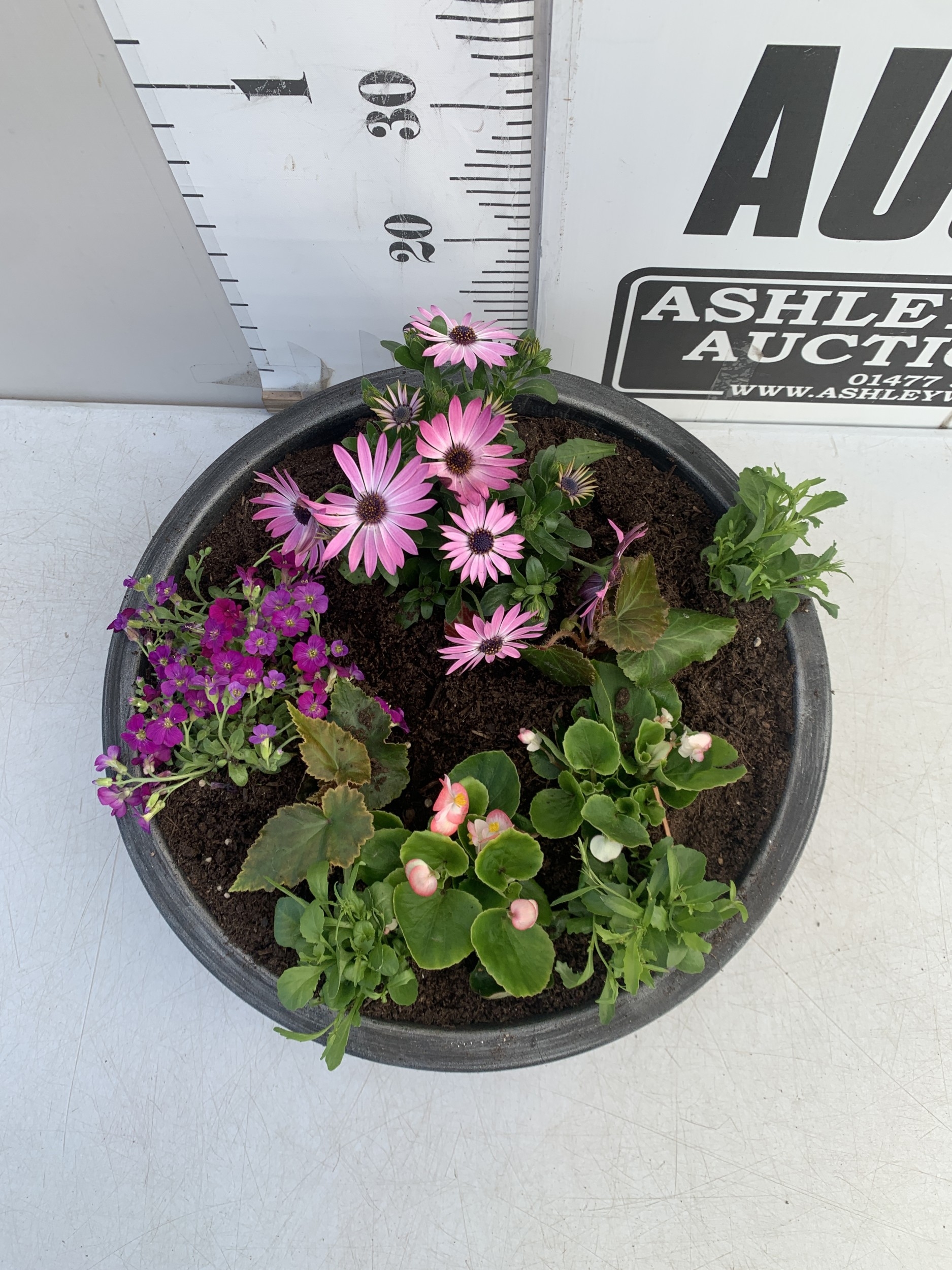 ONE LARGE PLANTER FILLED WITH VARIOUS BEDDING PLANTS TO INCLUDE OSTEOSPERMUM, AUBRIETA, SEMPS, LOBELIA ETC. PLANTER MEASURES 38CM IN DIAMETER
