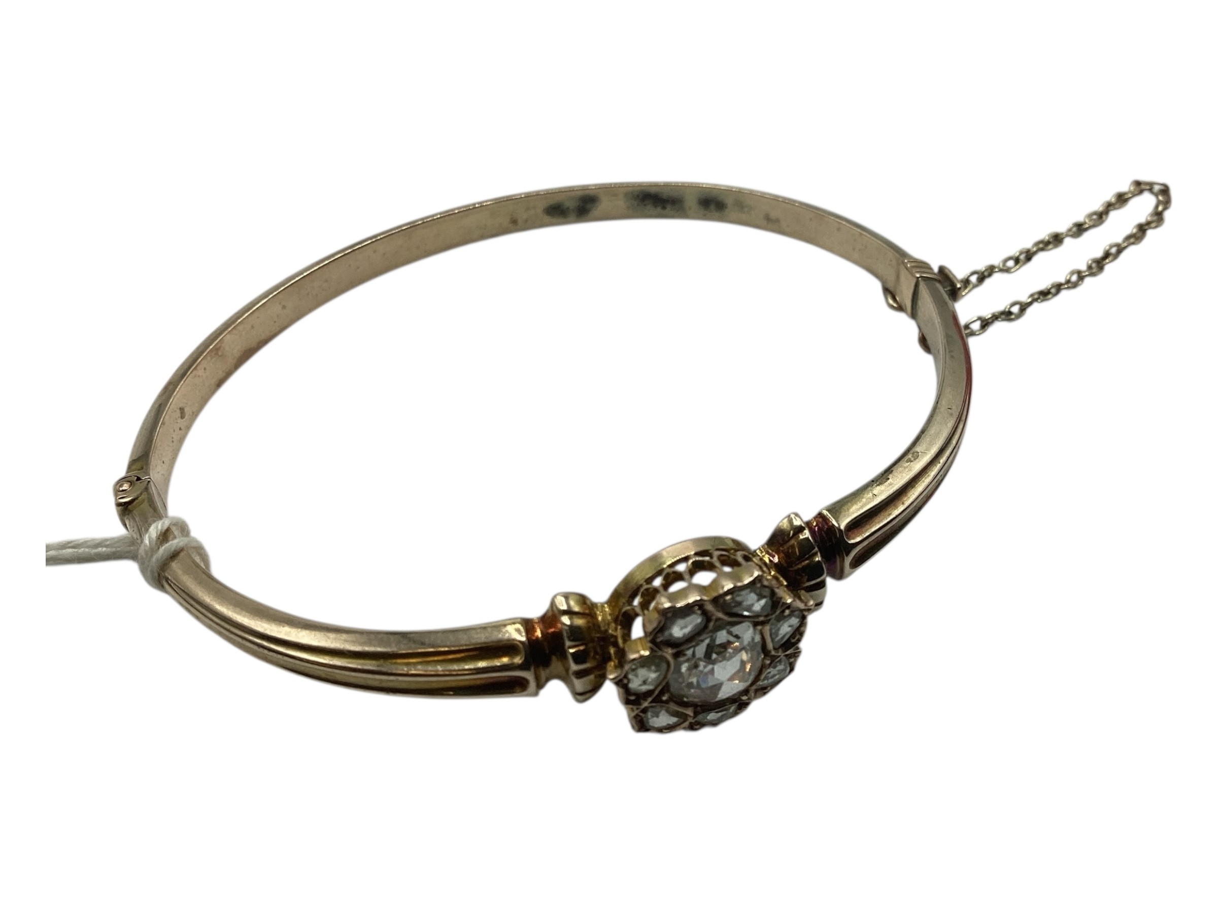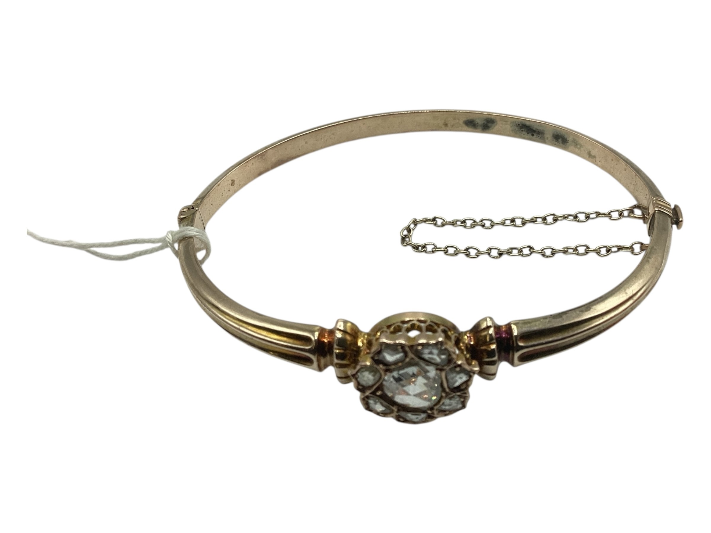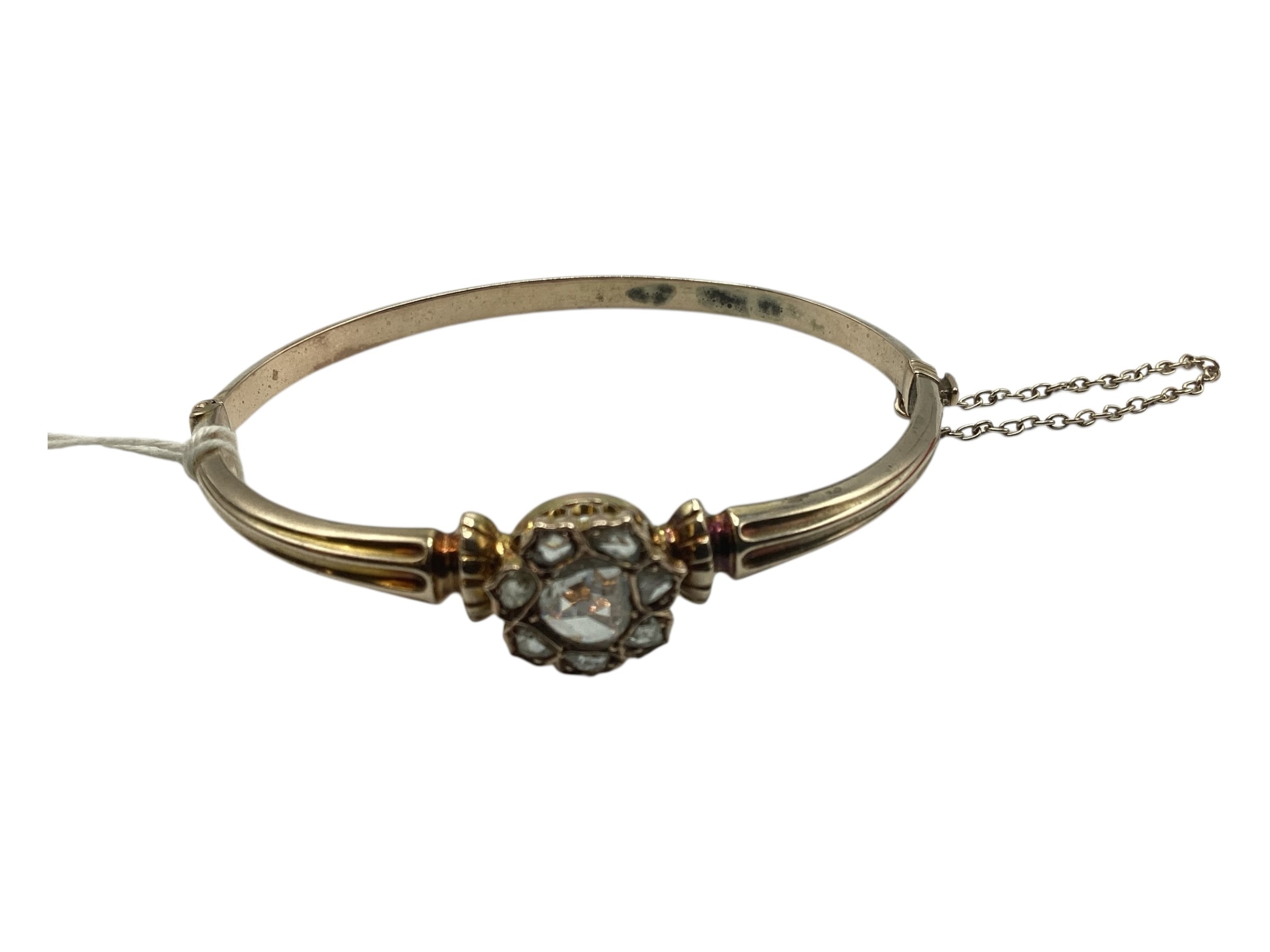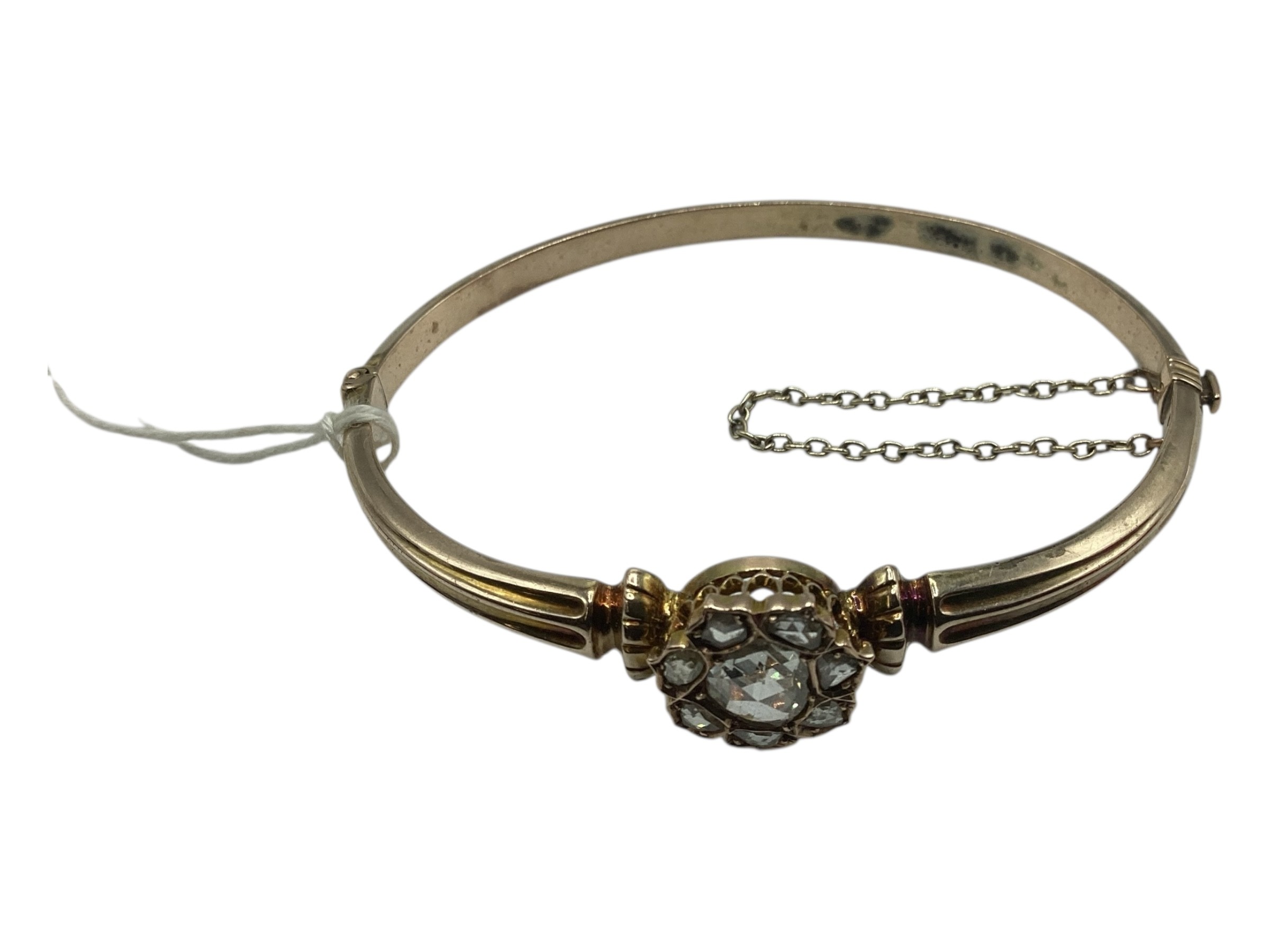 A 19th Century unmarked yellow metal and diamond set bangle bracelet, central rose cut 8mm diamond with a surround of 7 rose cut diamonds. 8 g