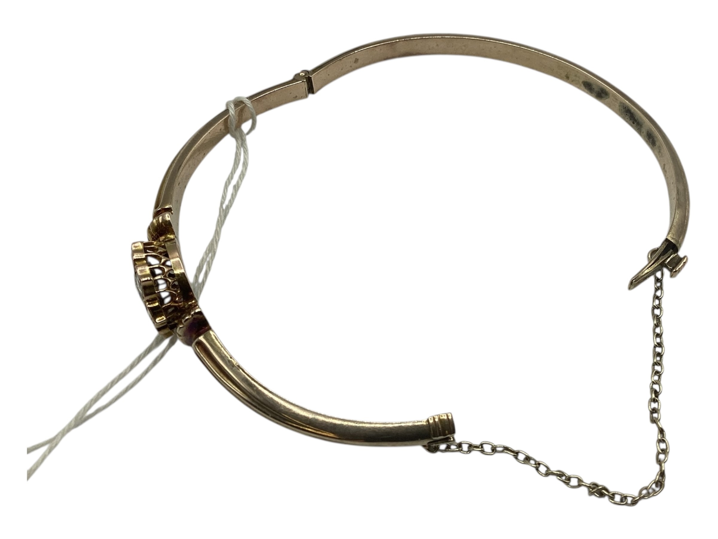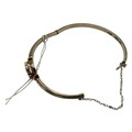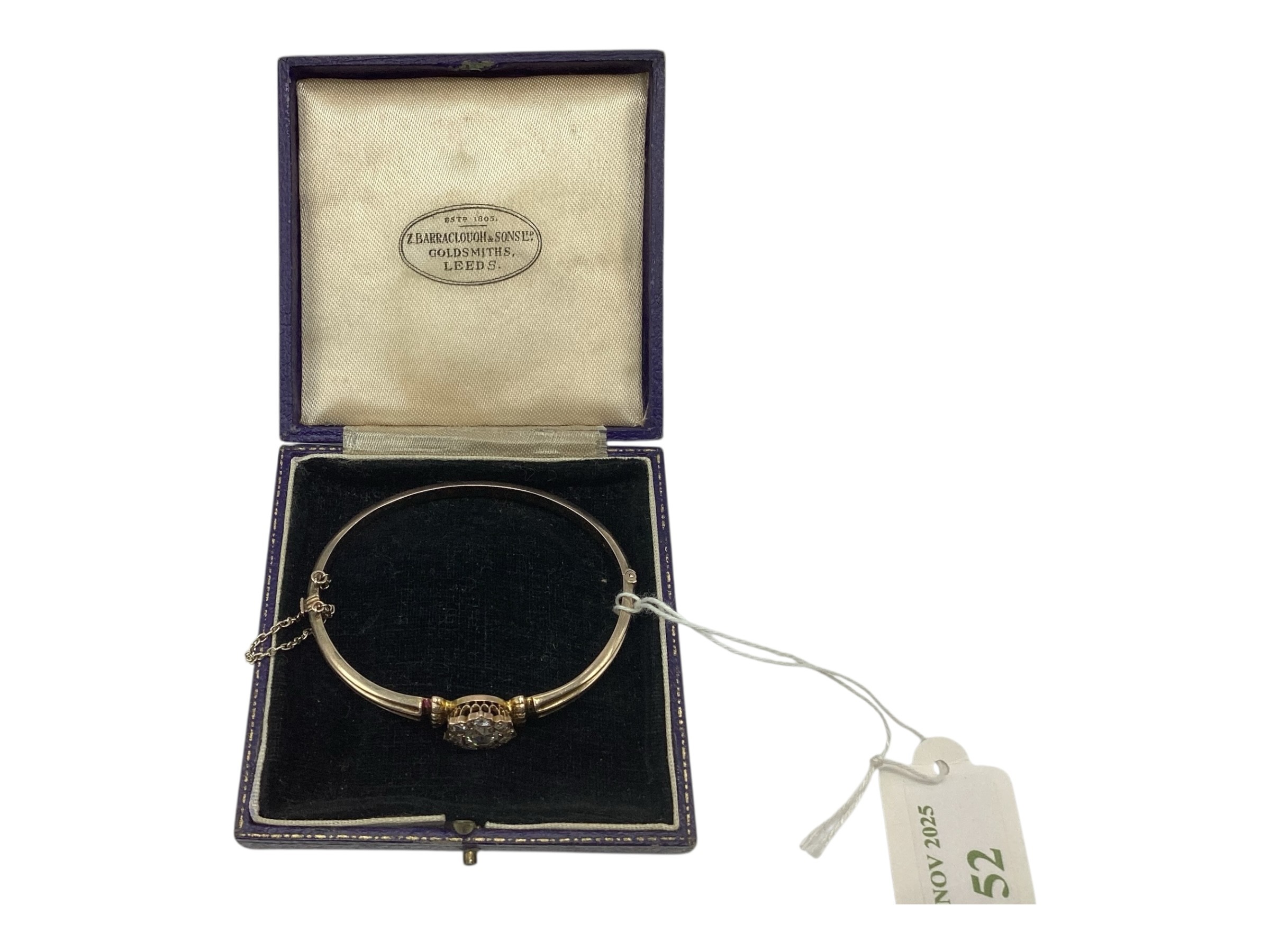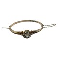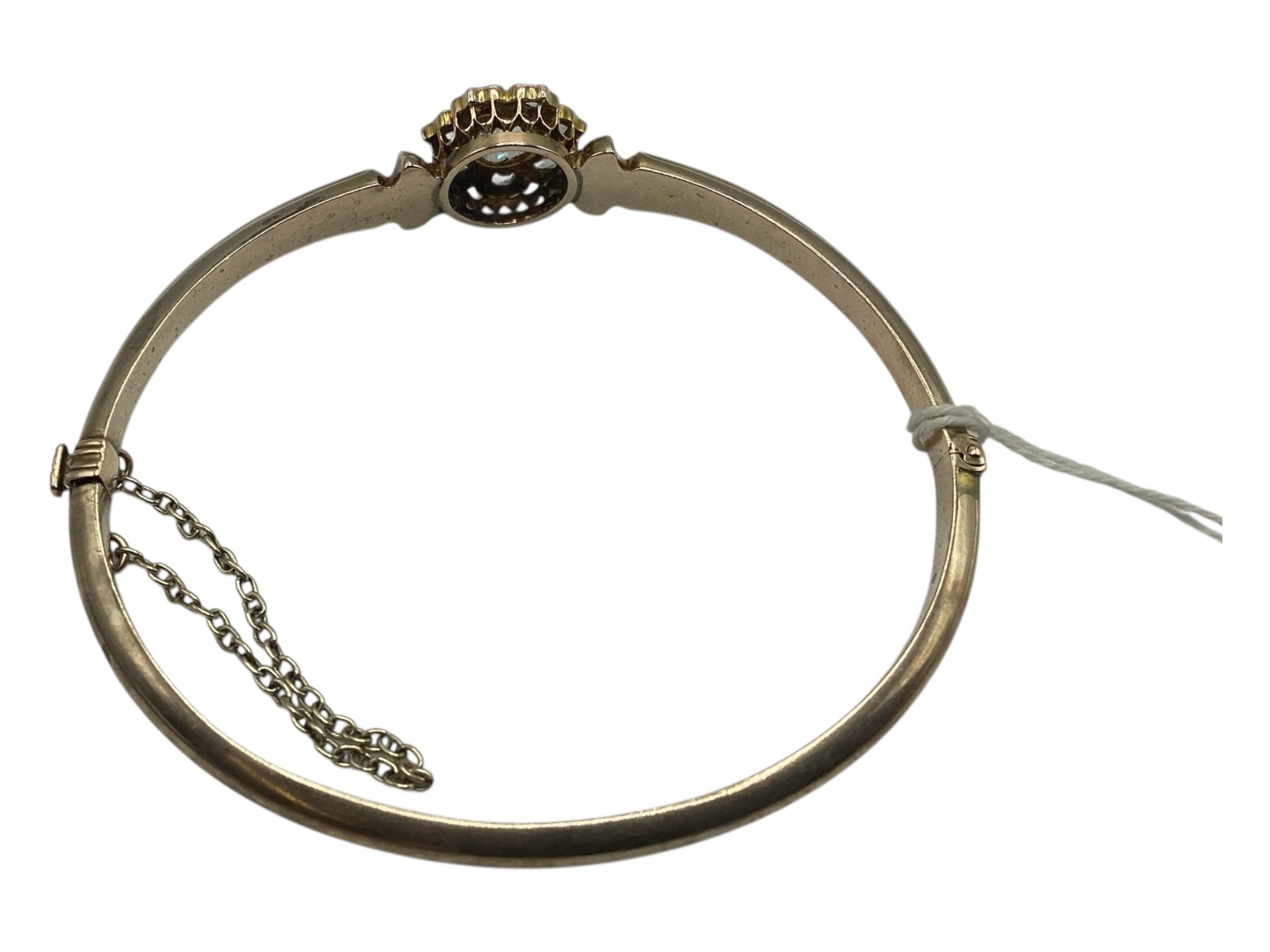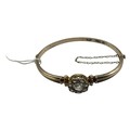 A 19th Century unmarked yellow metal and diamond set bangle bracelet, central rose cut 8mm diamond with a surround of 7 rose cut diamonds. 8 g