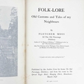 MOSS, Fletcher. 'Folk-Lore. Old Custom and Tales of my Neighbours,' First edition, original red cloth with pictorial gilt tooling to front board and spine, cloth split to head of backstrip, turned corners, some slight sporadic spotting to a generally good to very good textblock, frontis and illustrations, published by the author from his home The Old Parsonage, Didsbury; and from his room in The Spread Eagle Hotel. Hanging Ditch, Manchester, 1898.