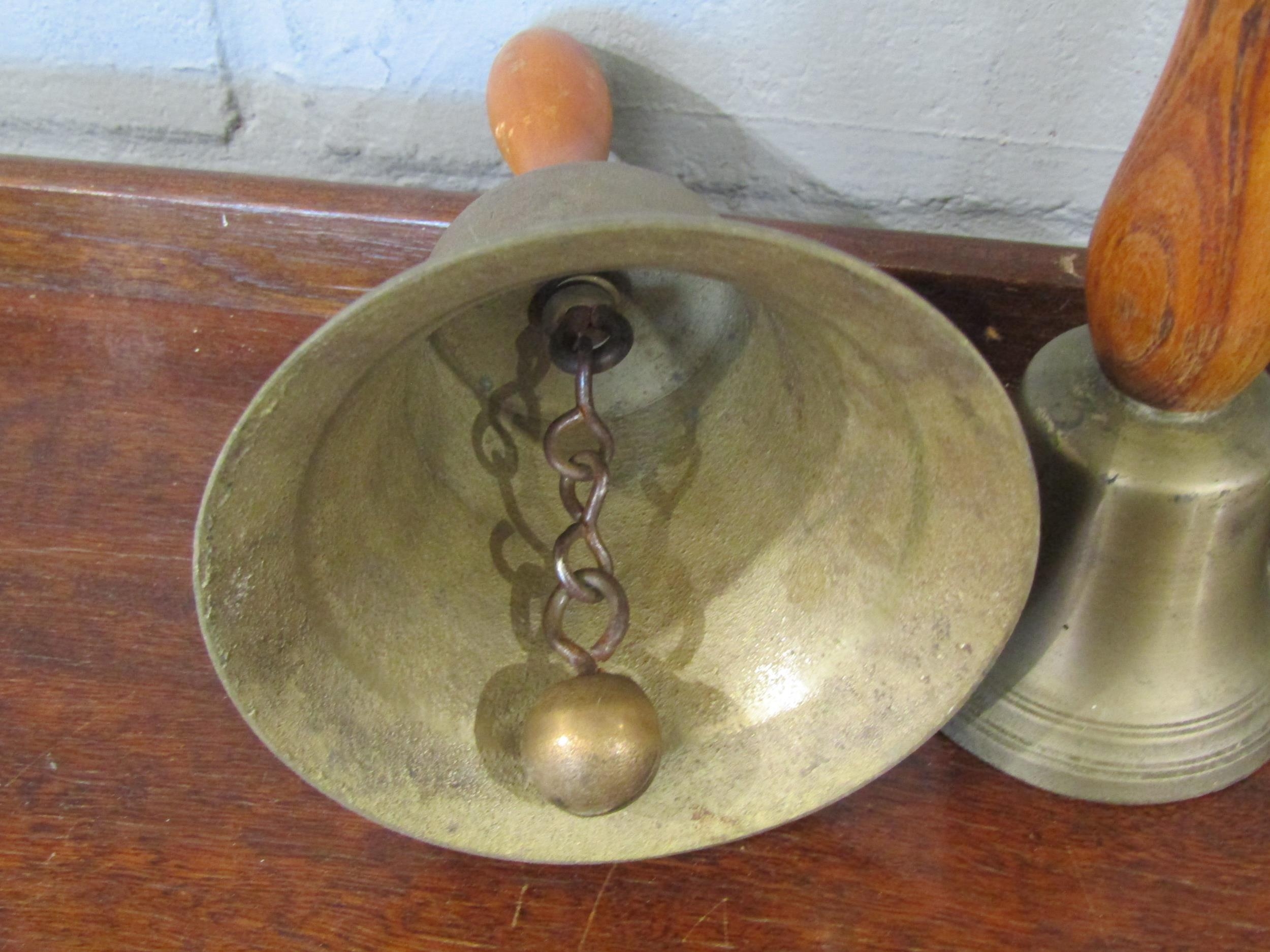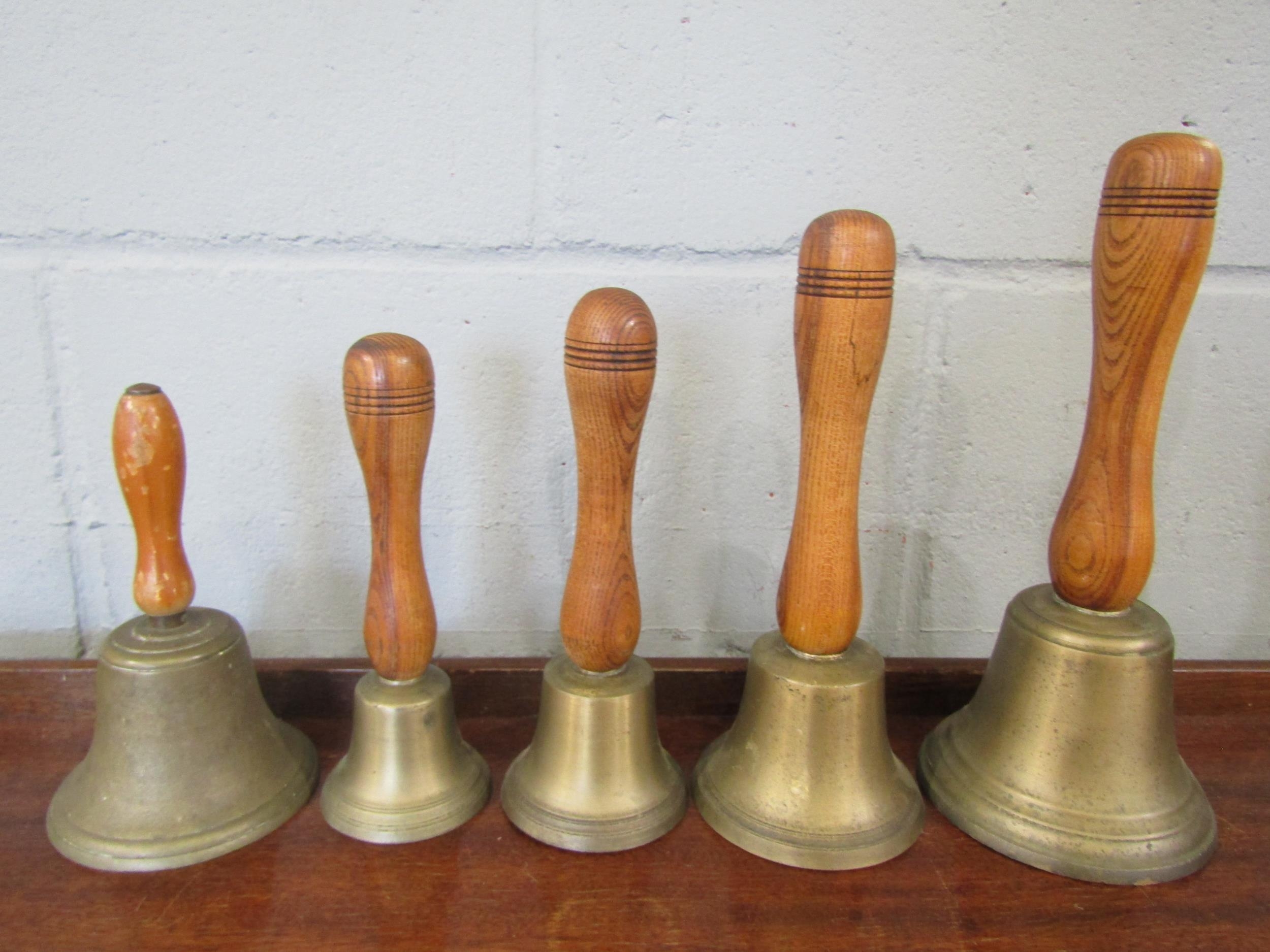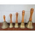 Five hand bells of various sizes, wooden handles