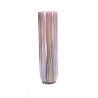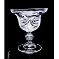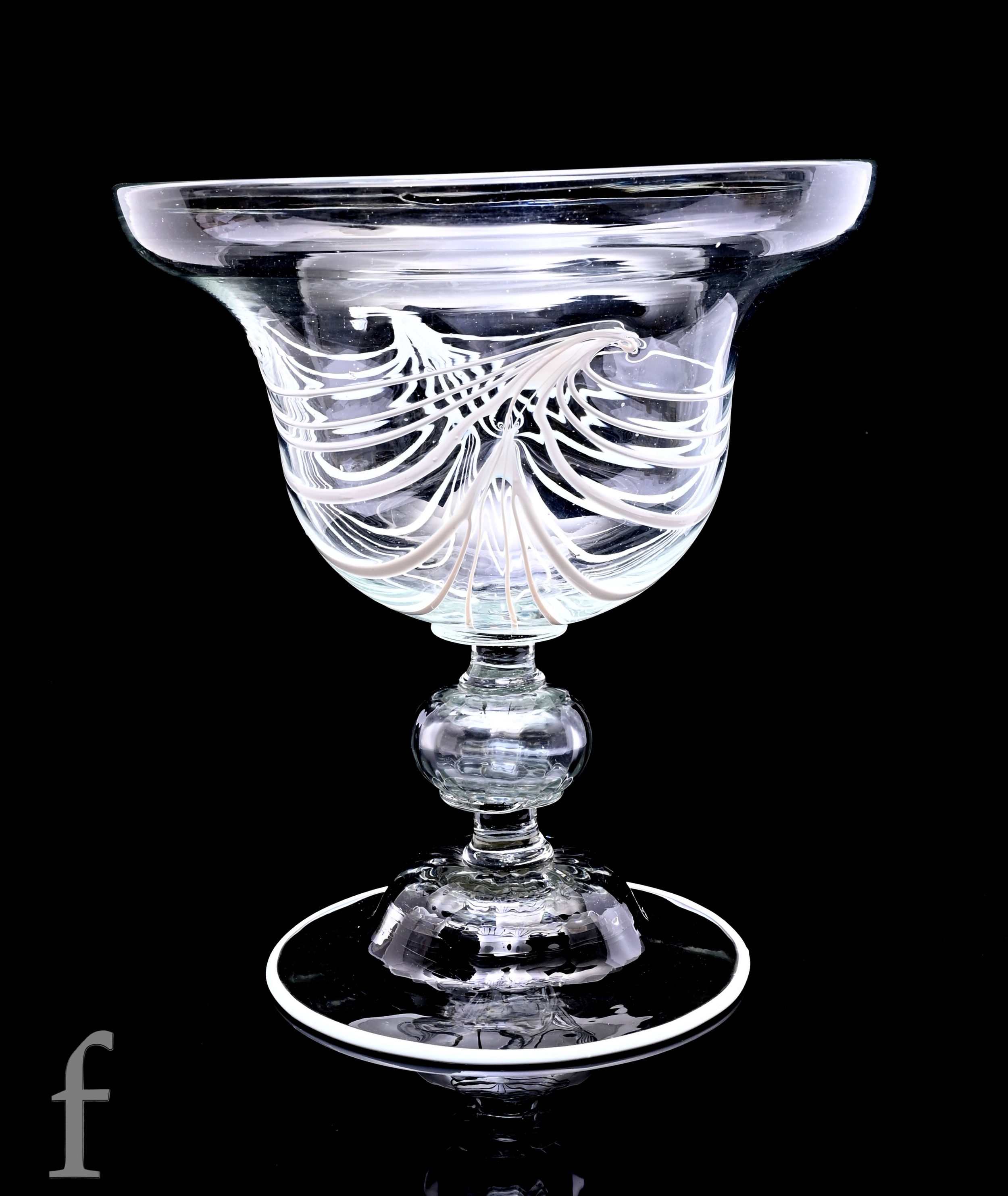 A large 1930s pedestal bowl by Elizabeth Graydon-Stannus for Graystan, of fluted cup form with everted rim, above a knopped step and raised to a fluted domed circular folded foot, decorated with pulled white lines over clear crystal ground, signed under foot, height 28cm.