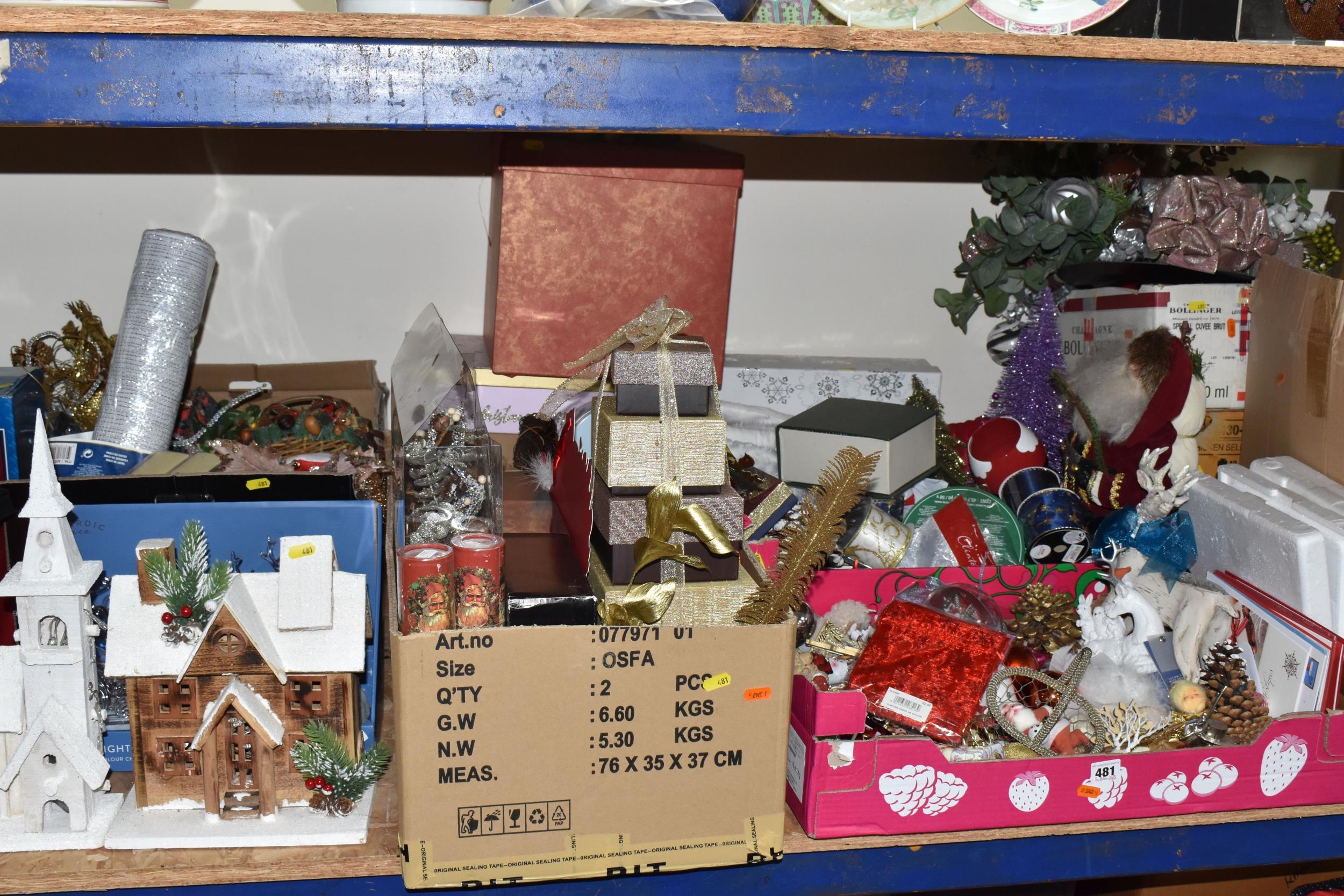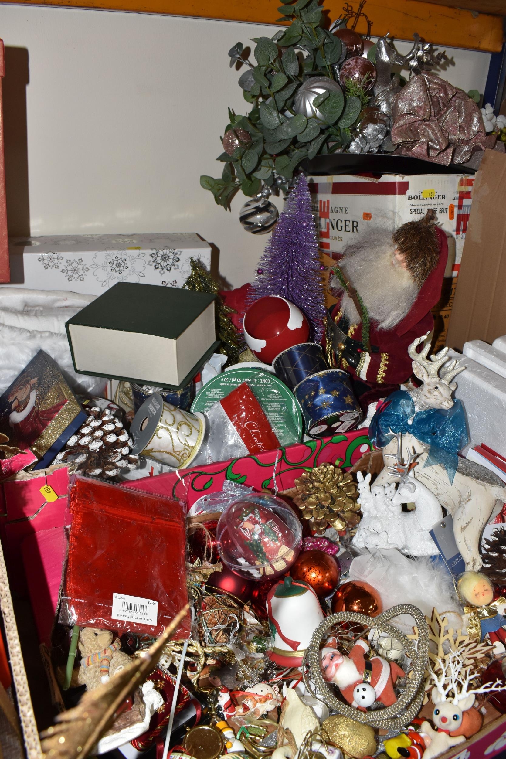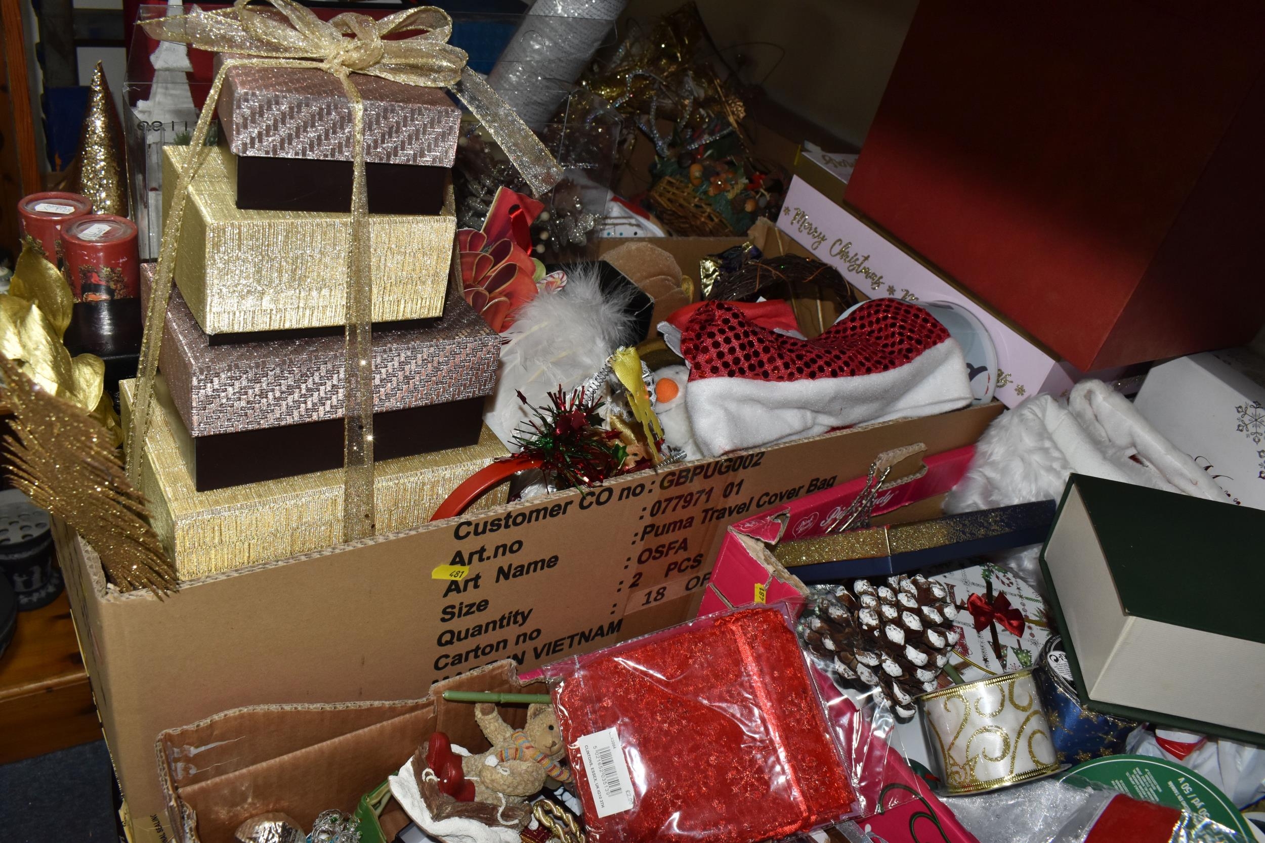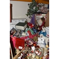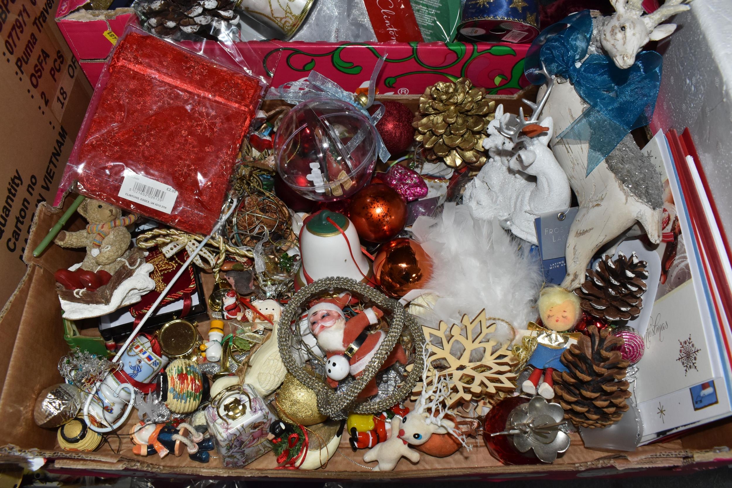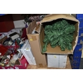 FIVE BOXES AND LOOSE CHRISTMAS-RELATED ITEMS to include a boxed 6ft artificial Christmas tree, another boxed Christmas tree, assorted wreaths, a large quantity of various tree decorations to include ceramic, glass, acrylic, etc, a large quantity of wrapping ribbons, boxes, lighting, and assorted ornaments, etc (5 boxes and loose) (s.d)