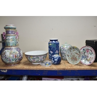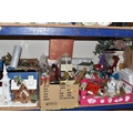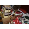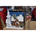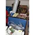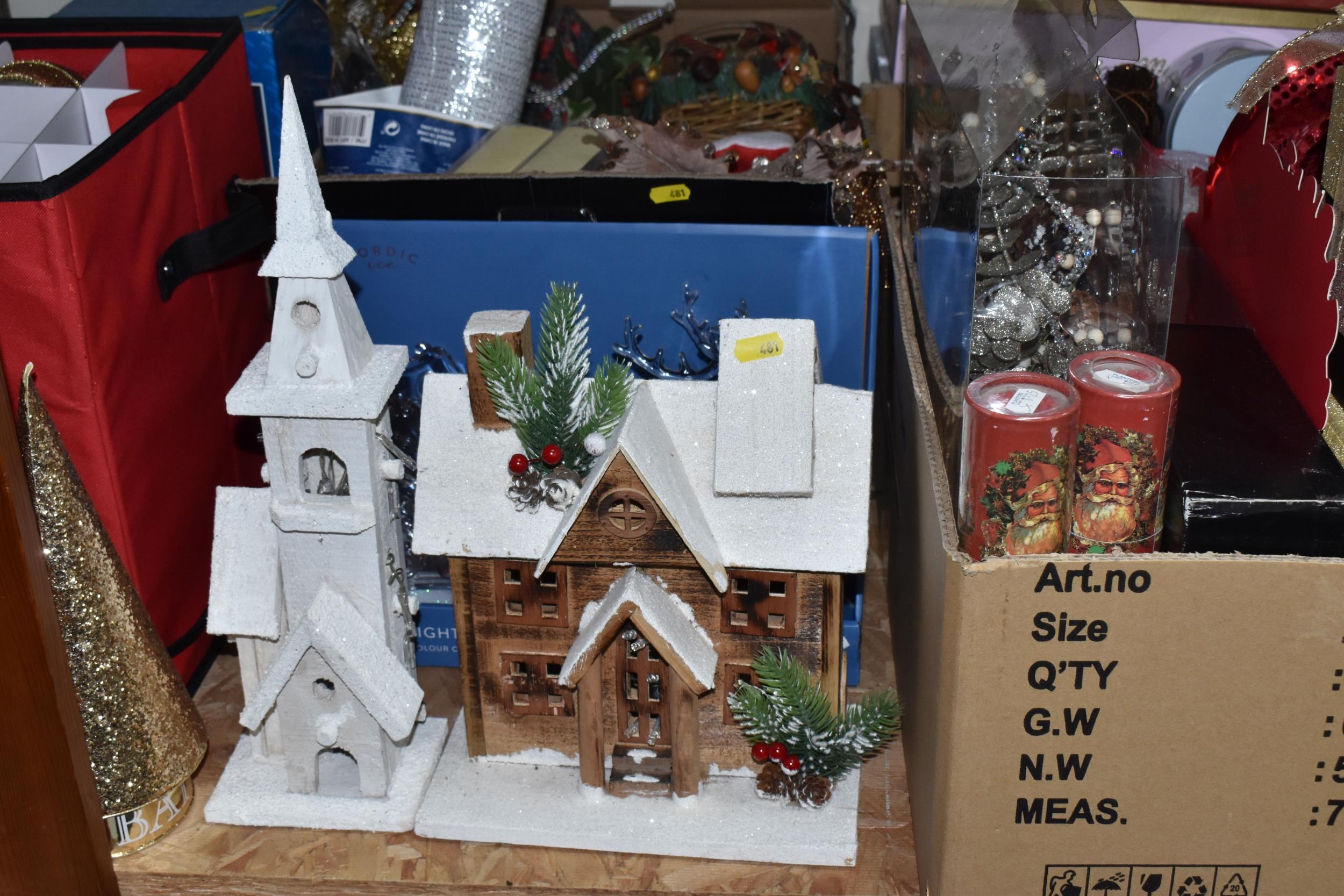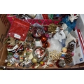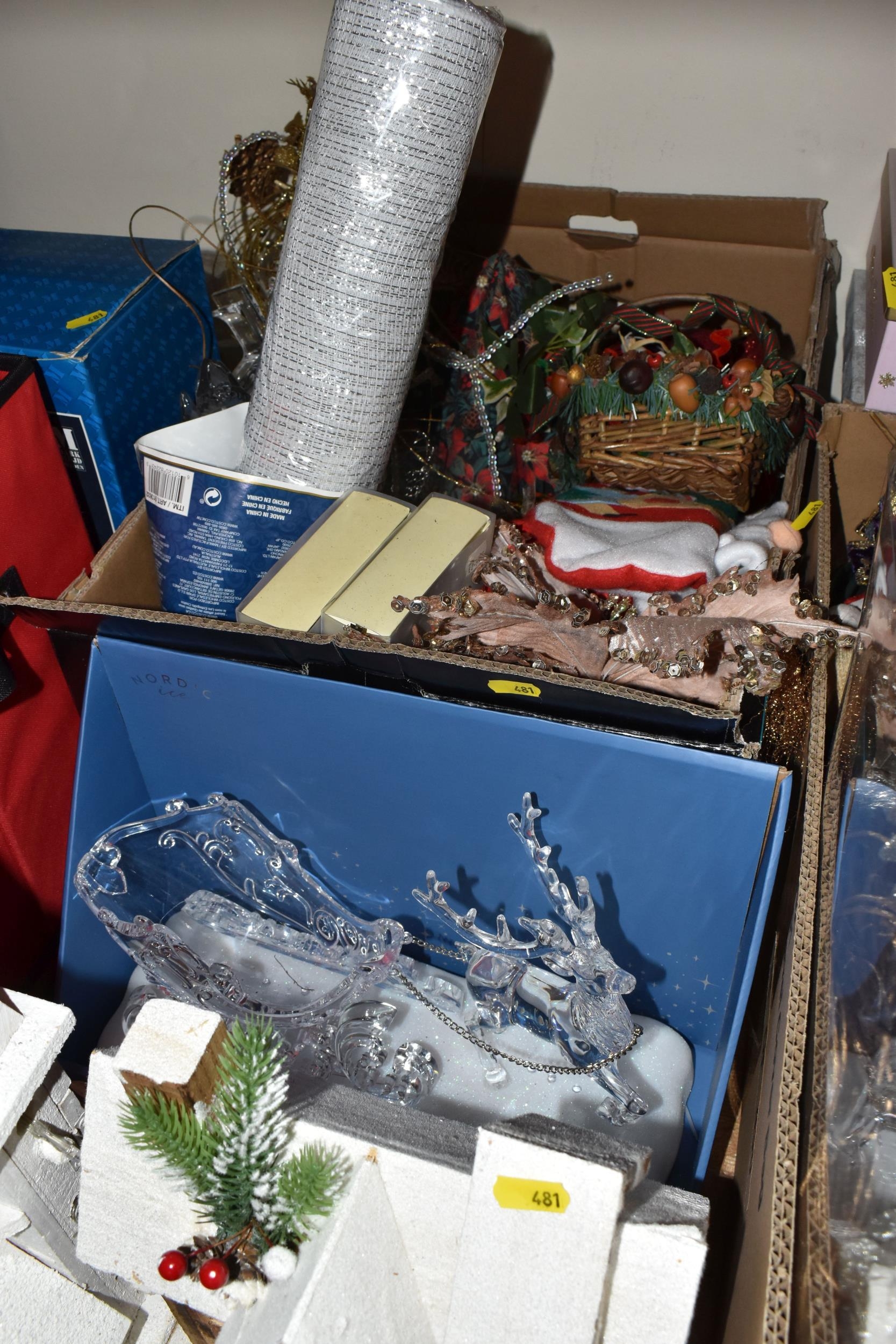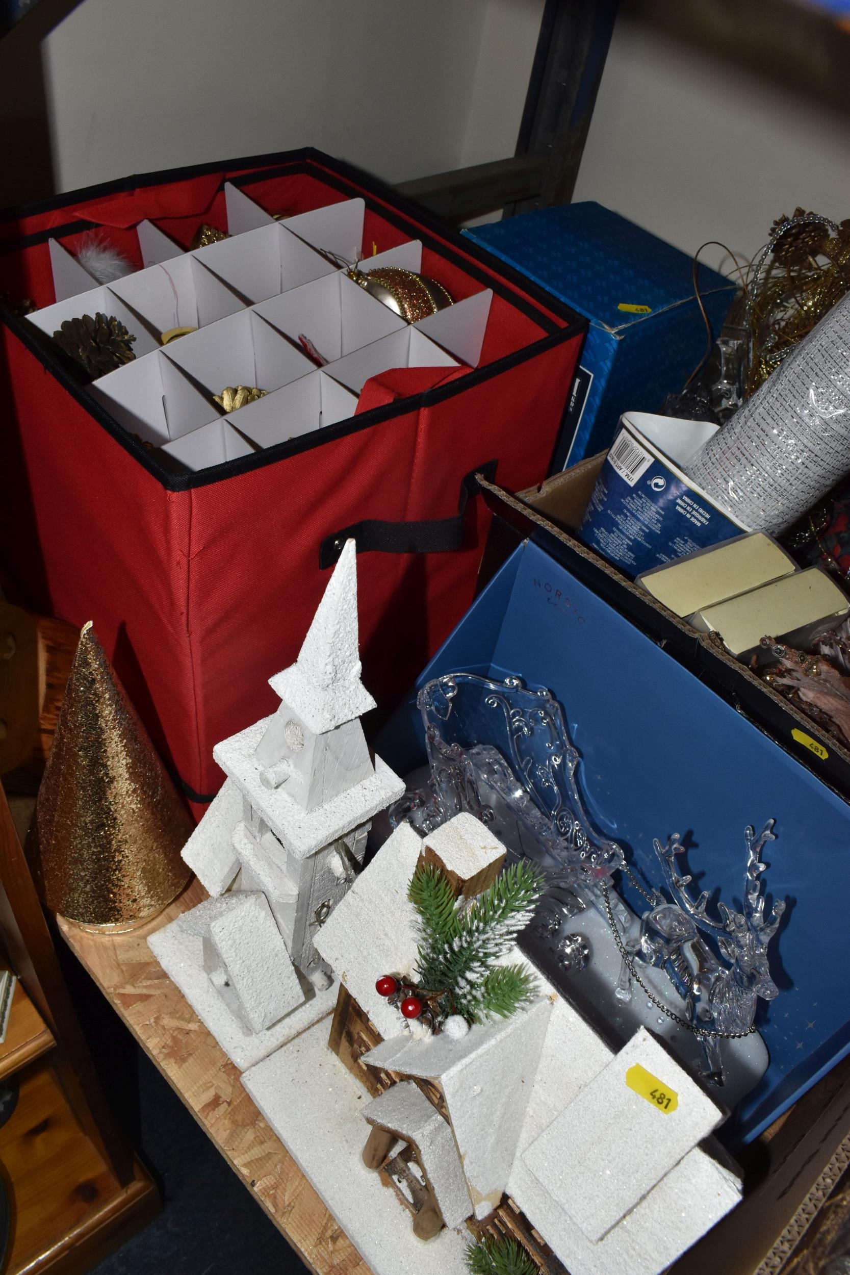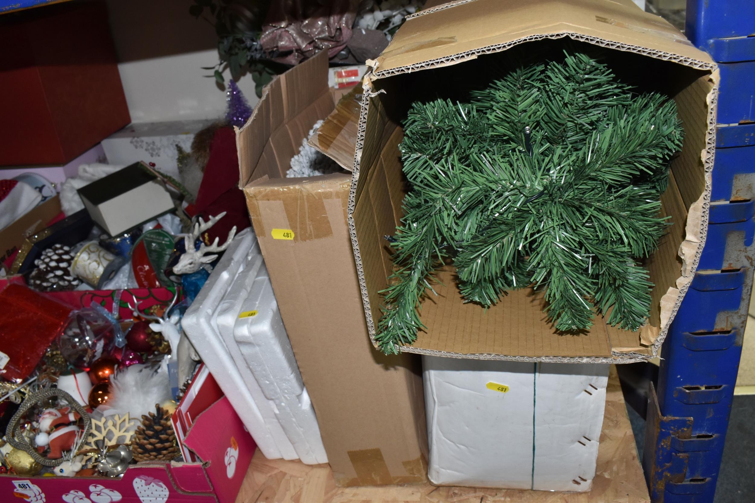 FIVE BOXES AND LOOSE CHRISTMAS-RELATED ITEMS to include a boxed 6ft artificial Christmas tree, another boxed Christmas tree, assorted wreaths, a large quantity of various tree decorations to include ceramic, glass, acrylic, etc, a large quantity of wrapping ribbons, boxes, lighting, and assorted ornaments, etc (5 boxes and loose) (s.d)