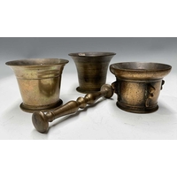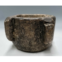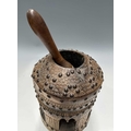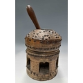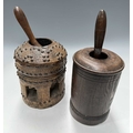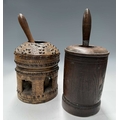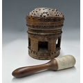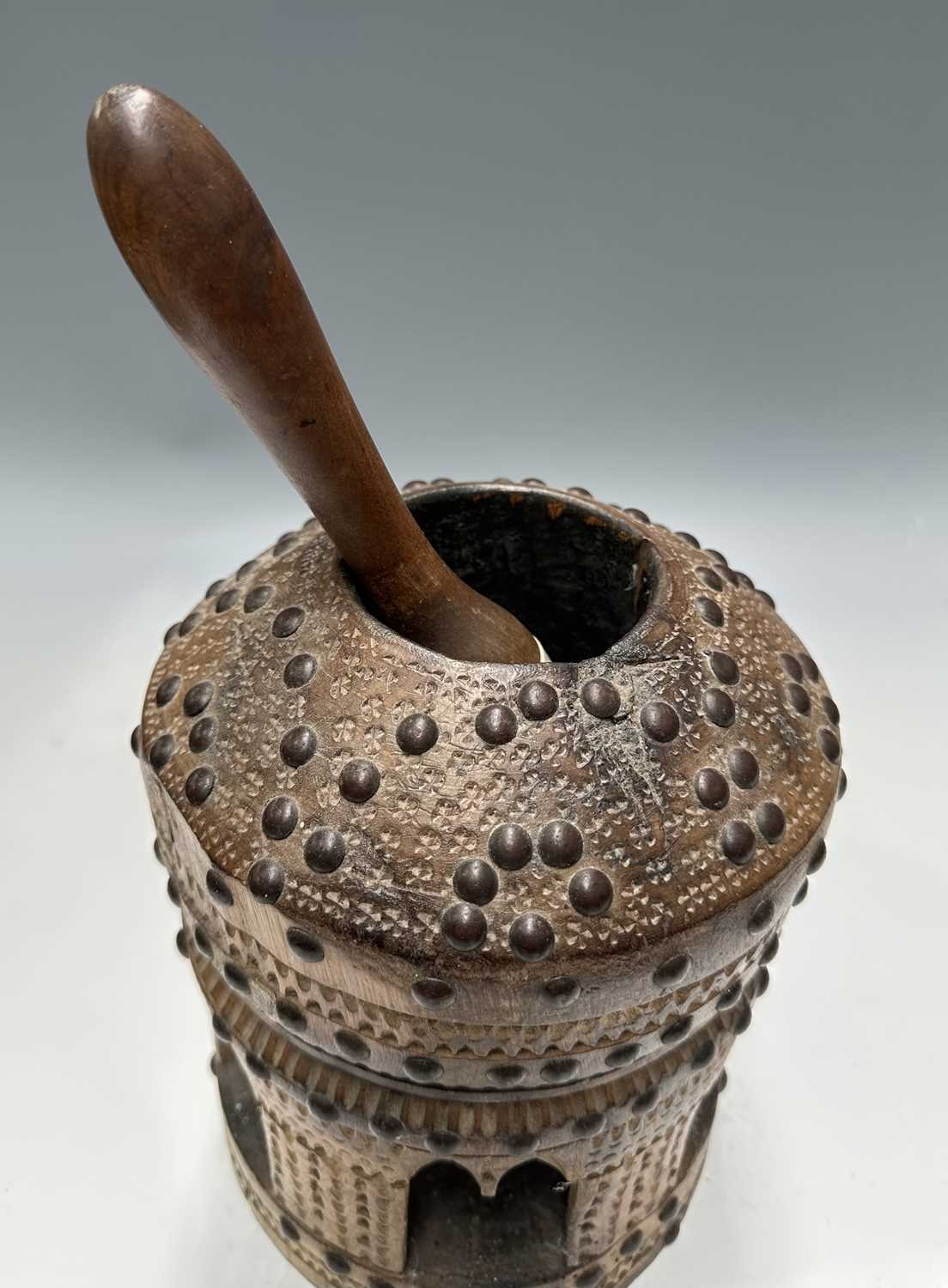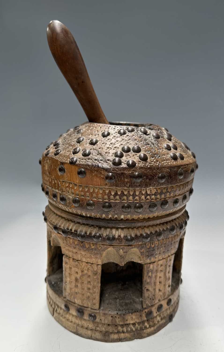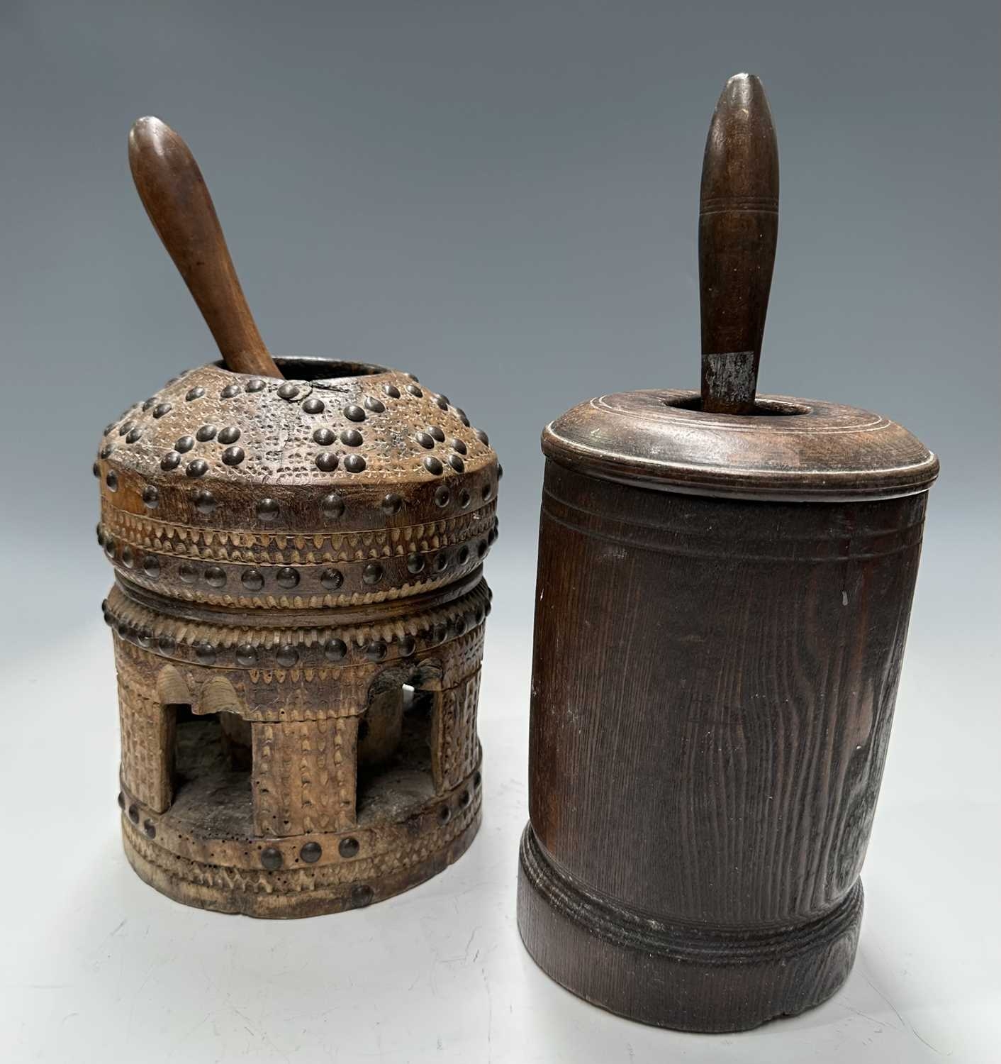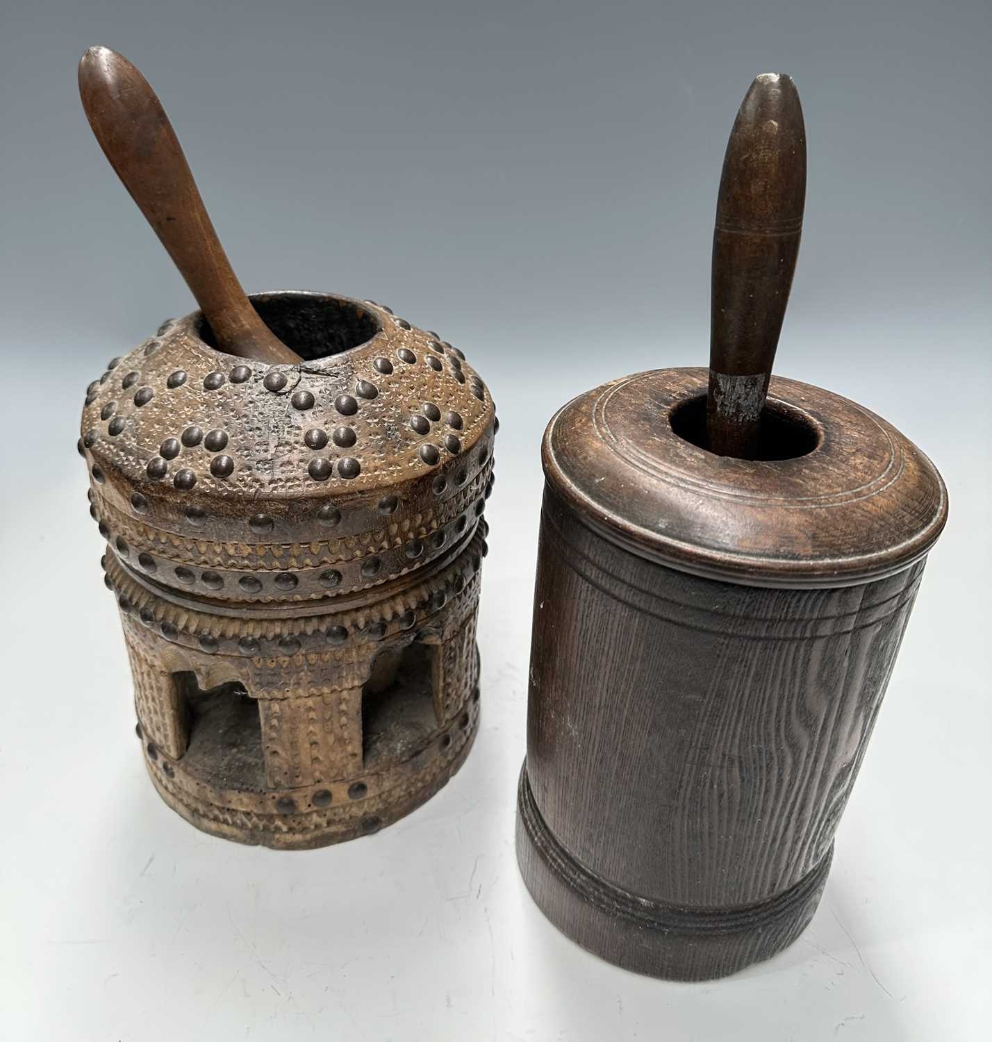 A tribal wooden mihbaj/mehbash, probably Bedouin, a coffee grinder carved from a single piece of wood with chip-carving and applied studs, an open arcade to the base, with a wooden handled pestle with ceramic head, height 24cm, together with a cylindrical oak pestle and mortar, with a detachable half-cover, height 23cm, diameter 14cm (4)