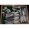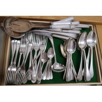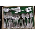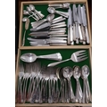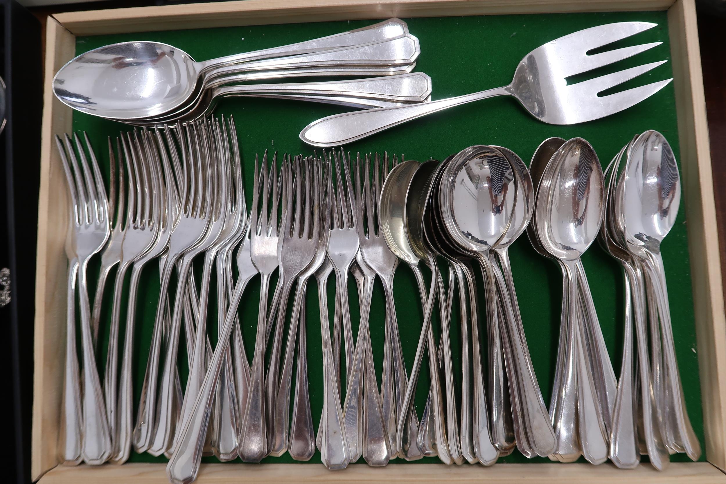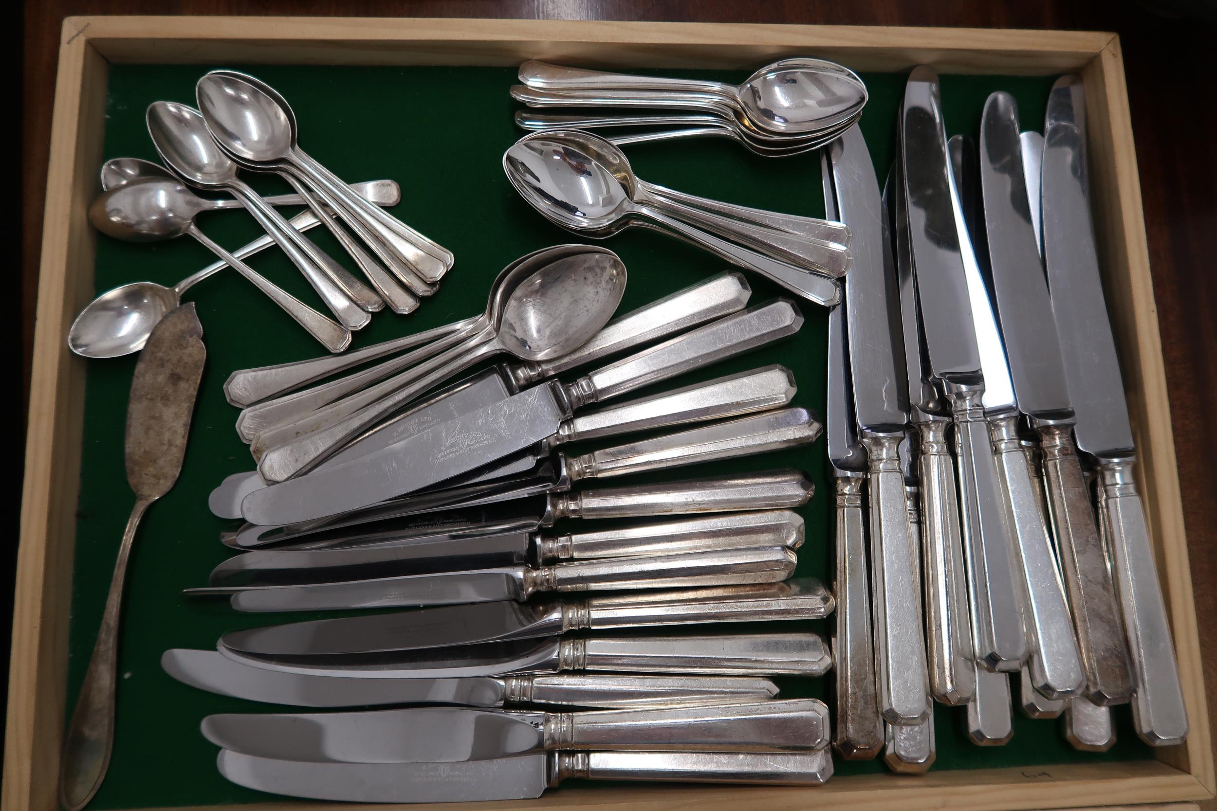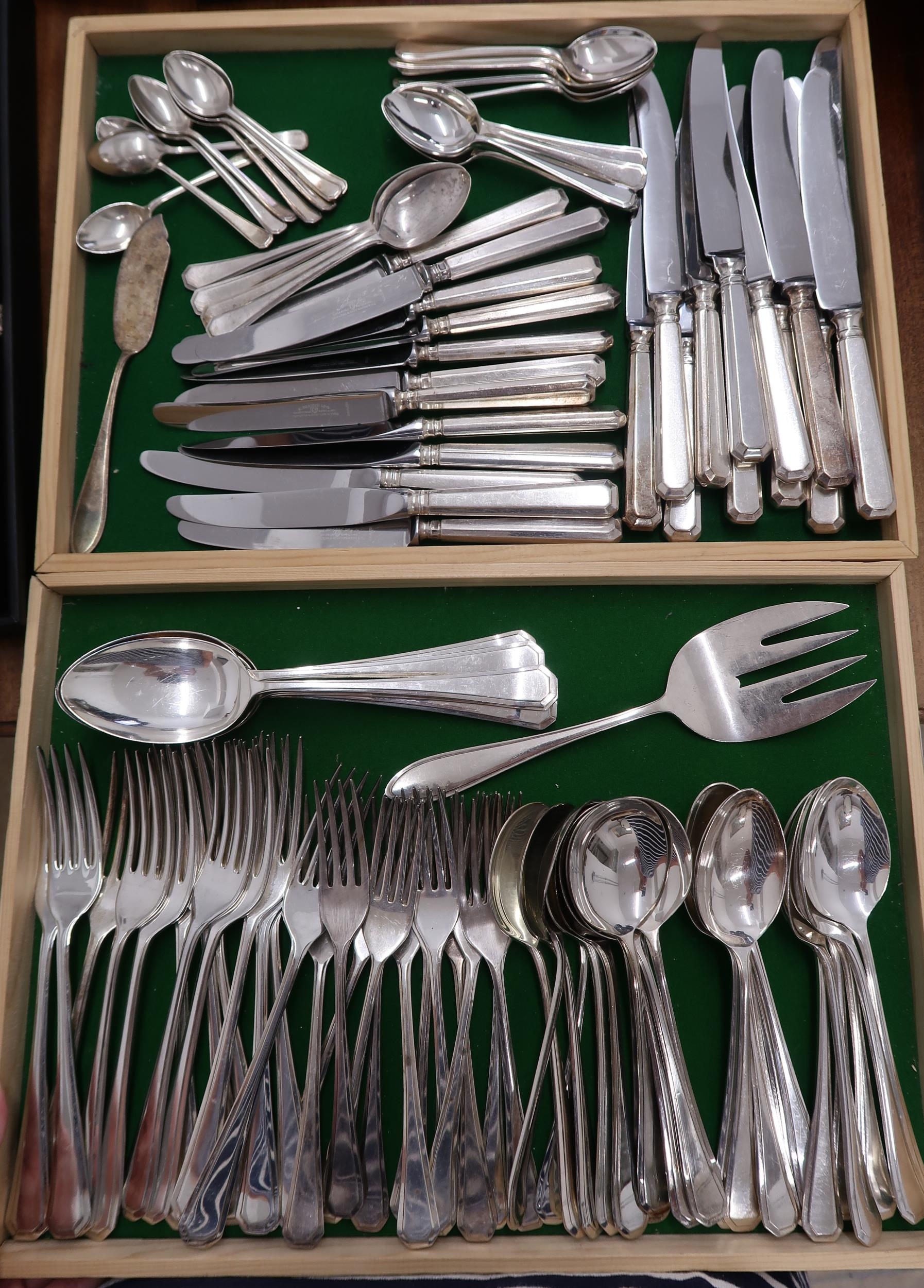 A set of silver plated flatwares for twelve place settings, of very similar pattern with reeded decoration, comprising twelve large and twelve smaller knives, butter knife, six serving spoons, twelve dessert spoons, twelve soup spoons, four large tea spoons, twelve teaspoons, nine coffee spoons, thirteen dinner forks, twelve dessert forks and a serving fork, various makers, mostly Sheffield.