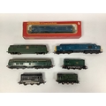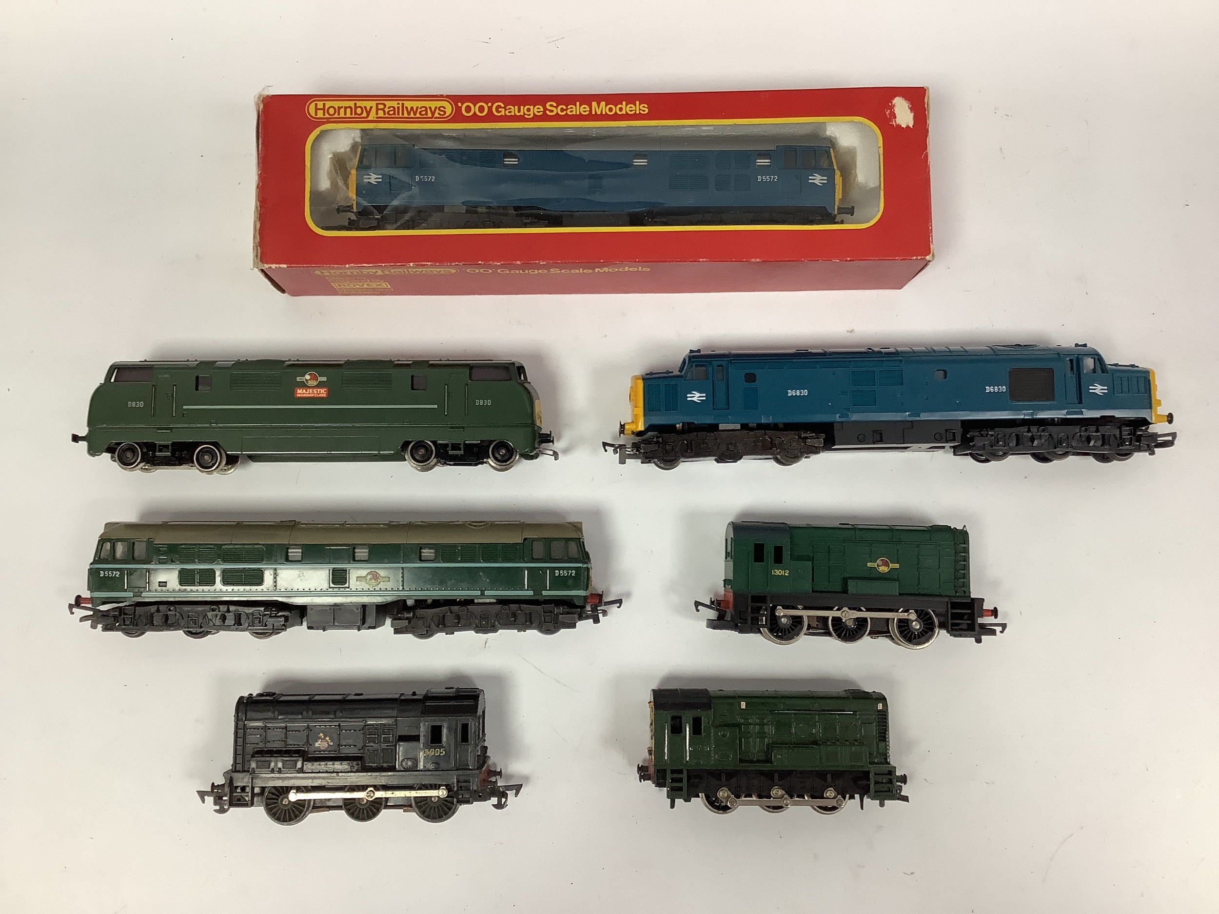 Seven '00' Gauge Diesel Locomotives: a boxed Hornby Class 31 in BR blue; a Triang green Class 31; a Triang blue Class 37; a Marklin "Warship"; and three Class 08 shunters by Lima and Hornby; all untested and playworn.