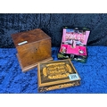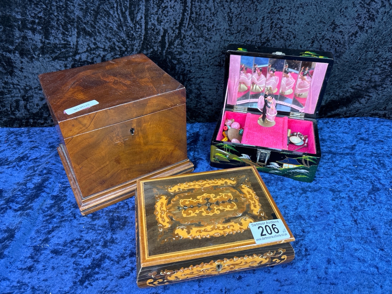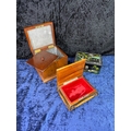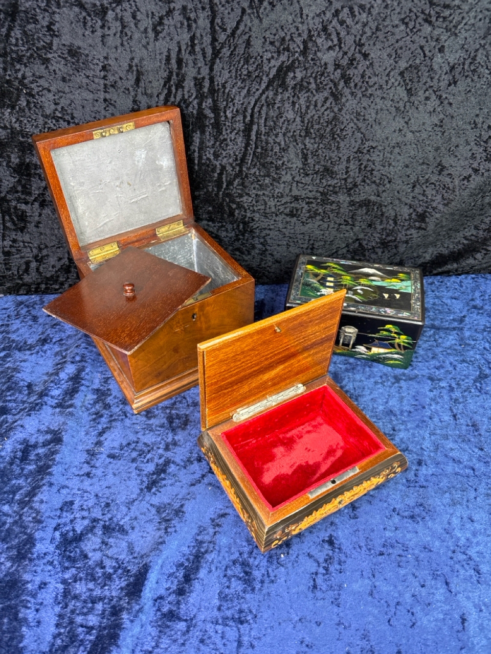 Trio of vintage wooden boxes inc tea caddy, lacquered oriental style music box and a pretty inlaid jewellery box